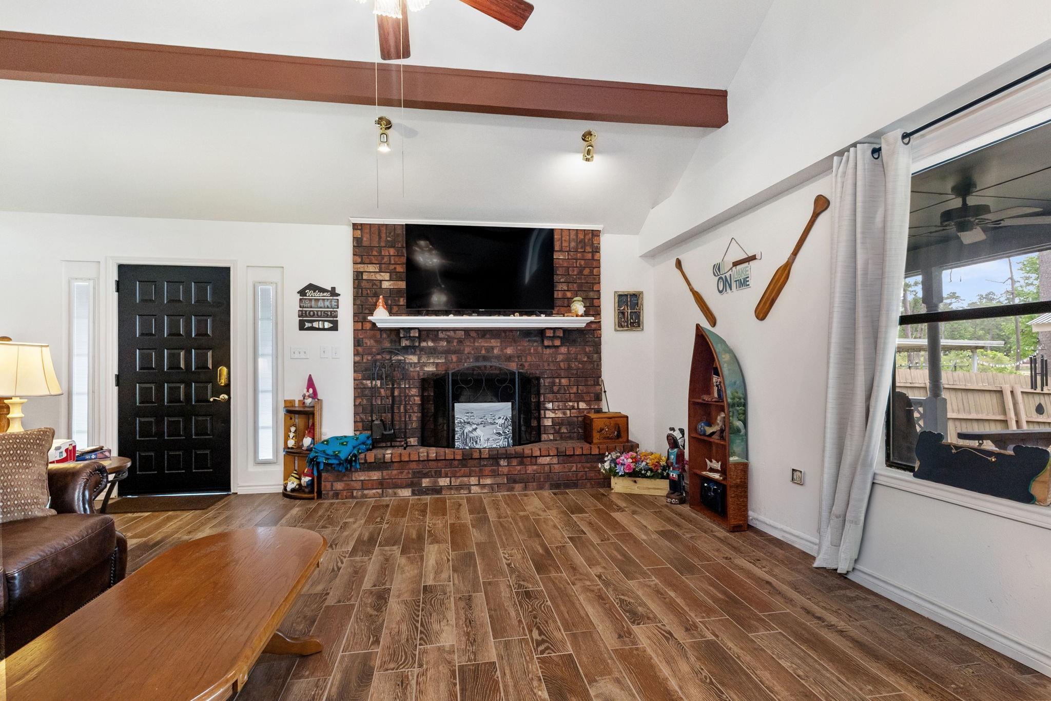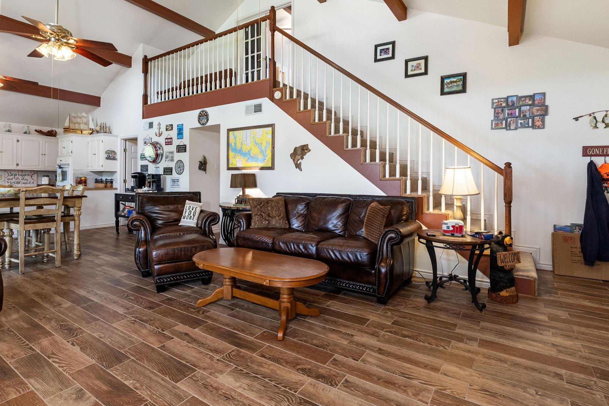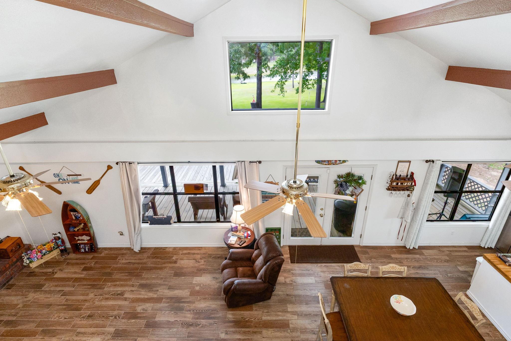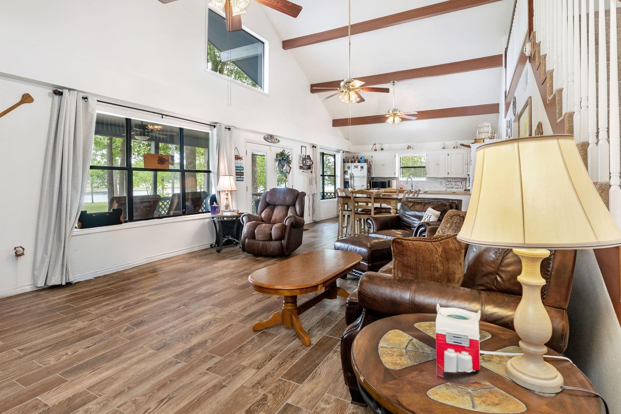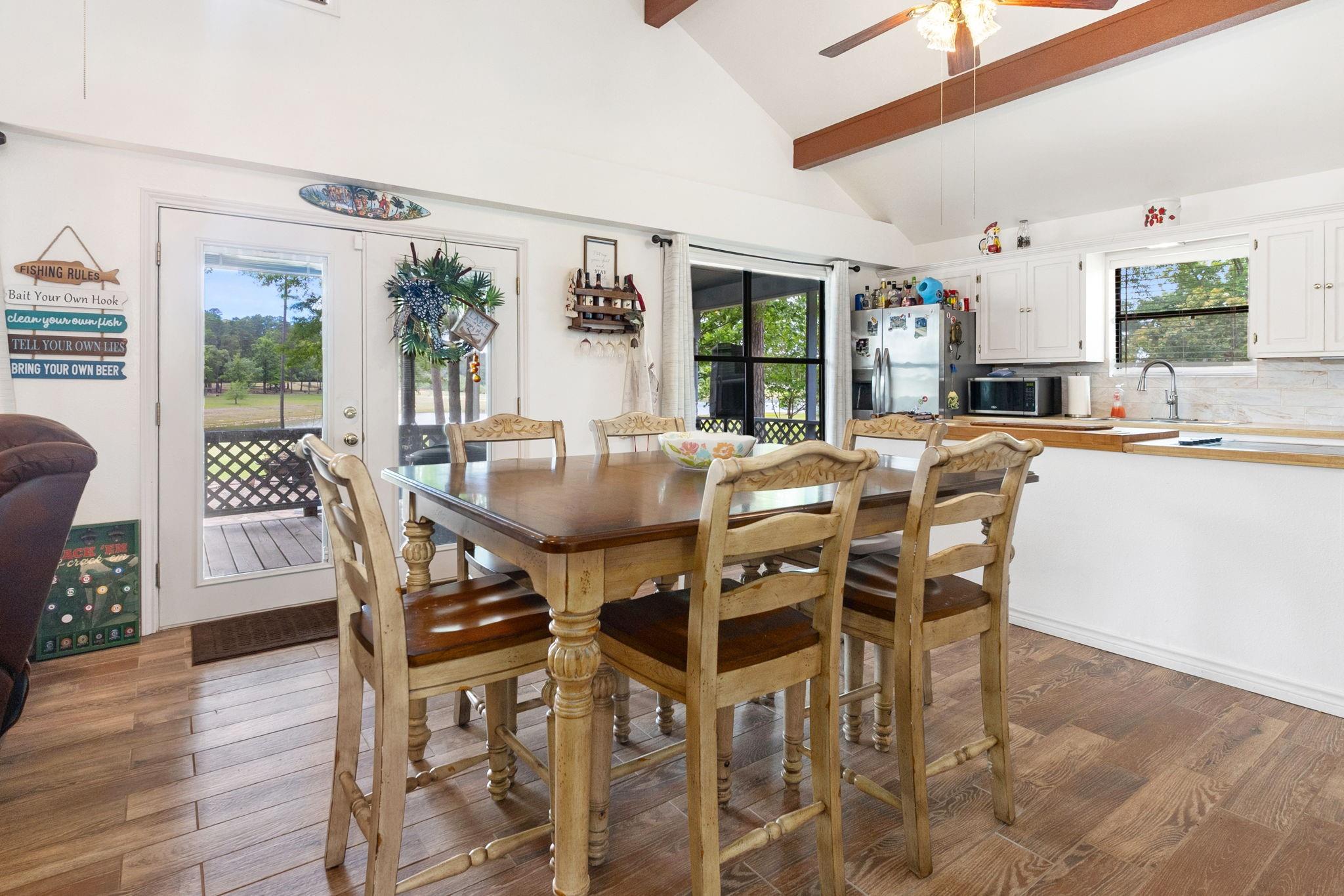 LAKEFRONT property on the shores of Lake Sam Rayburn. Stunning sunrise & sunsets! Versatile use as a weekend getaway, full-time residence, or income-producing investment. The main living area features soaring ceilings & open layout. A private guest house with full bathroom and wall Air Conditioner adds flexibility for visitors or potential rental income! Expansive Lake views from the large deck, complete with an outdoor kitchen and bar—ideal for gatherings by the water. Conveniently located around the corner from San Augustine Park, offering easy access for boat launching. This home is a must see. Check out the video! Start making memories! Removable dock stays with property & No HOA The Main home is 2,080 sq ft & Guest house is 368 sq feet... Total of 2,448 sq feet FULLY FURNISHED - Move In Ready & for a peace of mind it comes with a Generac Generator. Excluded in the sale: Outside wood patio furniture & bbq pit & Half table w/ Lamb on it & Small refrigerator in garage