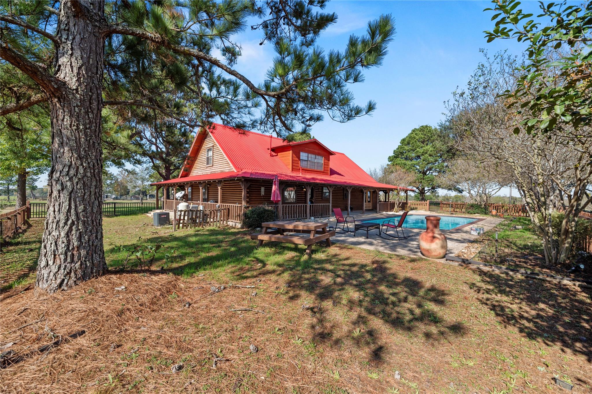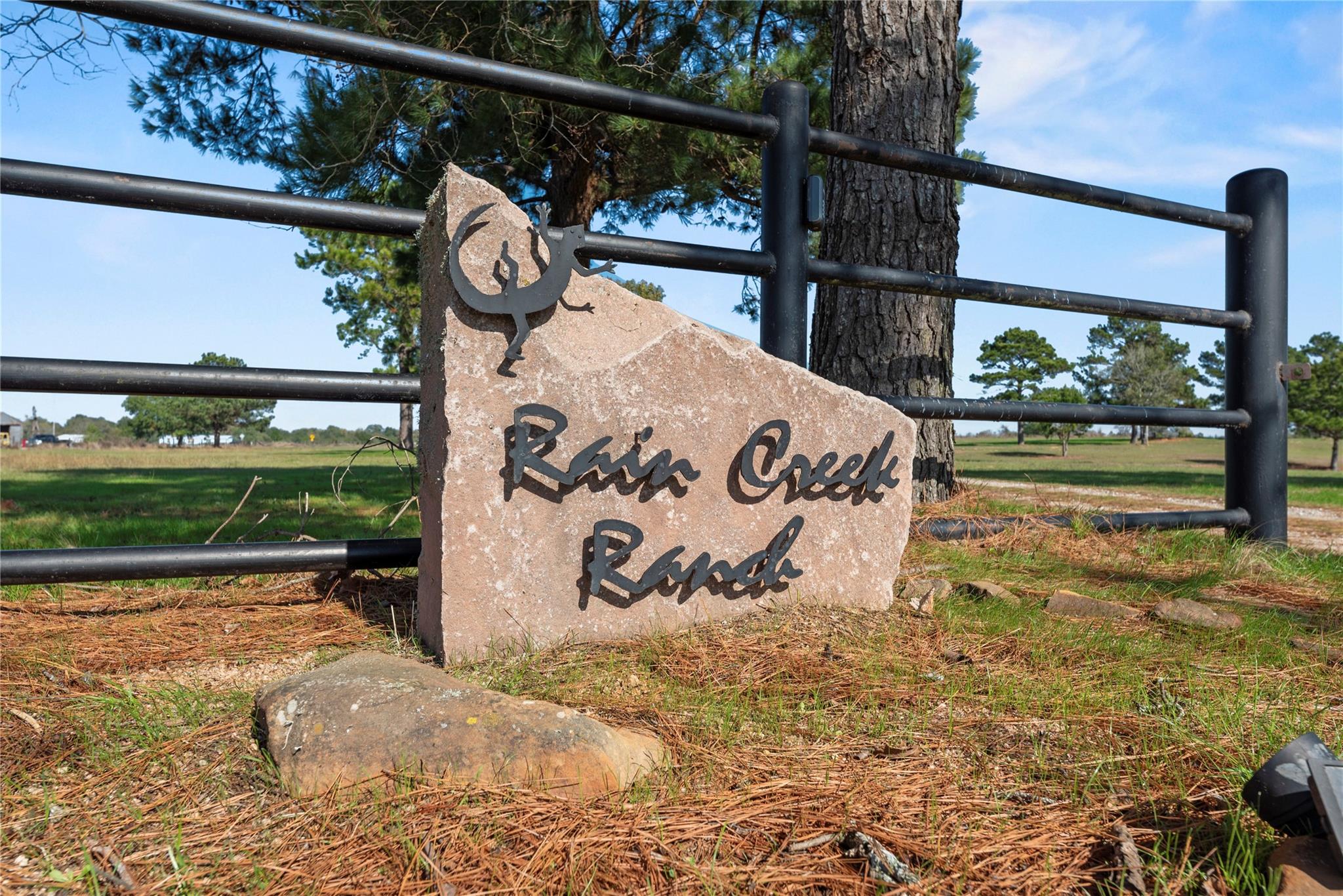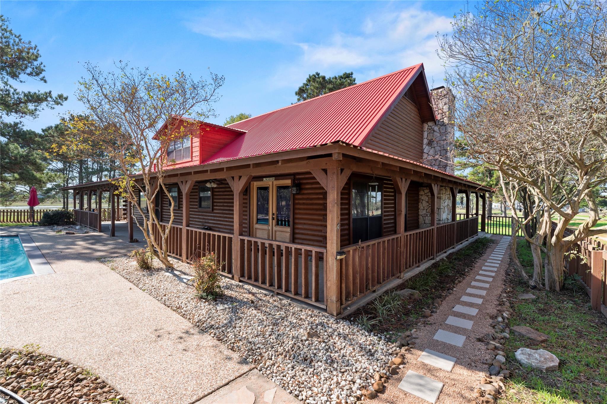 Rain Creek Ranch-82 Acres of Peaceful Country Living-Experience the beauty & privacy of this stunning 82-acre property with an electronic gated entrance, open pastures, wooded pockets and an abundance of wildlife. The 2,446 SF log cabin home offers 3 bedrooms, 3 baths, with 2 bedrooms on the main level. The living room features a wood-burning fireplace and opens to the kitchen, creating a warm space. Enjoy outdoor living with a beautiful pool and deck. The property holds a wildlife exemption and includes 3 ponds and has bird, owl and butterfly nesting houses throughout the property along with deer feeders. A large metal storage building, and 2 smaller barns are perfect for equipment and storage. Experience the unmatched serenity and beauty of Rain Creek Ranch-where country living meets comfort and convenience. 7 miles to I-10, 45 miles from Houston