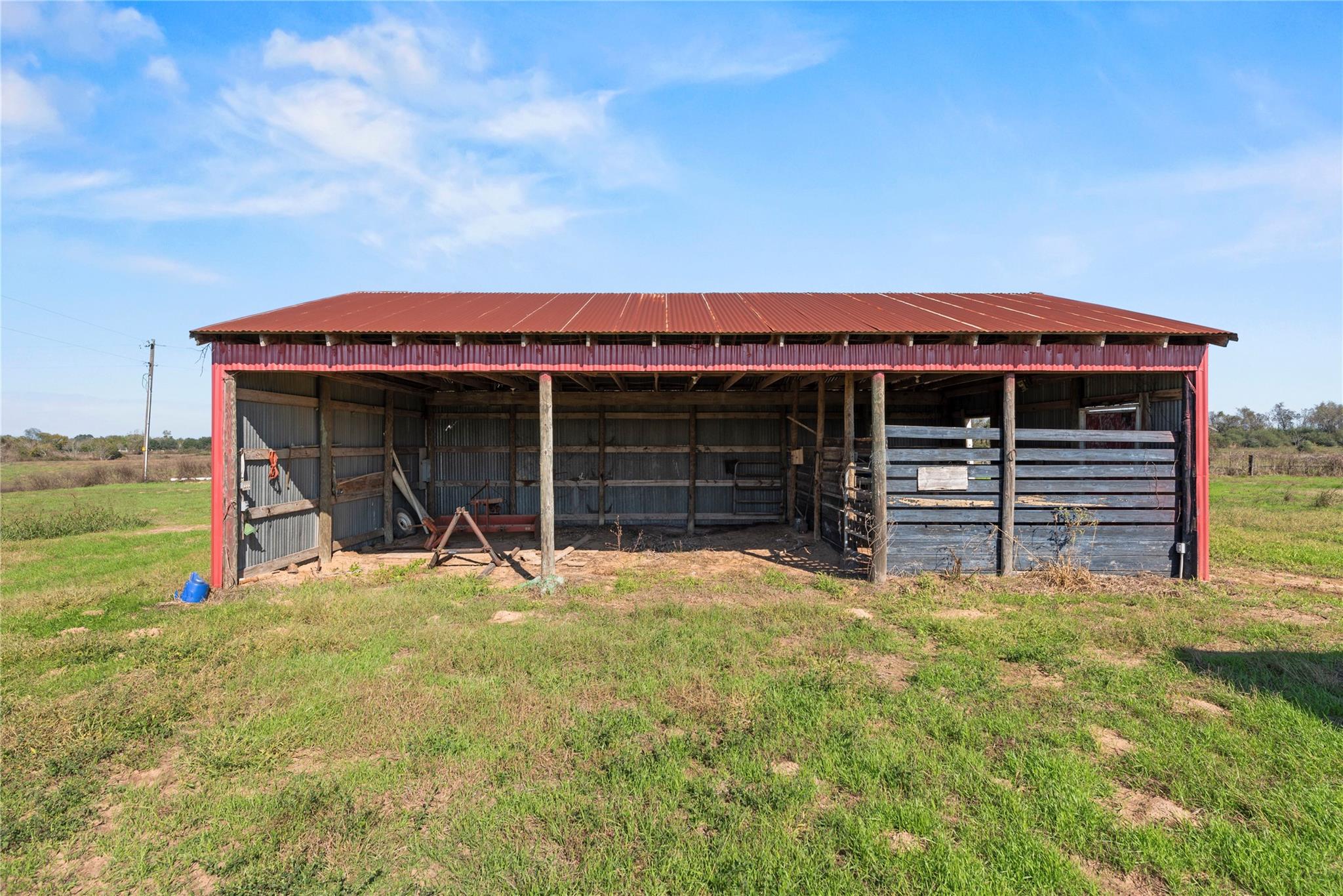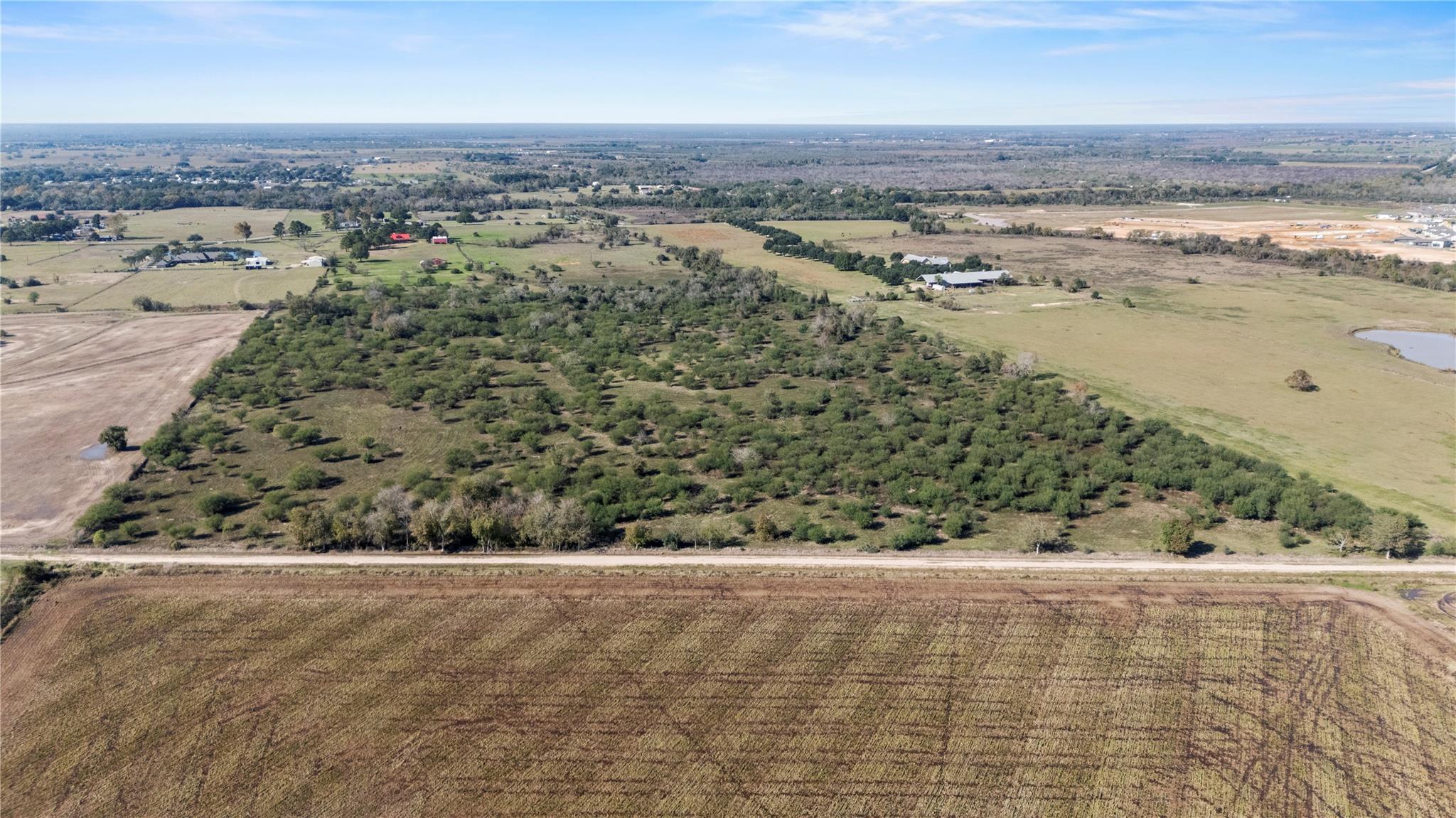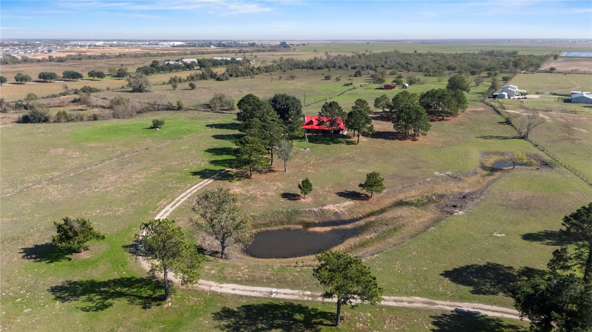Rain Creek Ranch-82 Acres of Peaceful Country Living-Experience the beauty & privacy of this stunning 82-acre property with an electronic gated entrance, open pastures, wooded pockets and an abundance of wildlife. The 2,446 SF log cabin home offers 3 bedrooms, 3 baths, with 2 bedrooms on the main level. The living room features a wood-burning fireplace and opens to the kitchen, creating a warm space. Enjoy outdoor living with a beautiful pool and deck. The property holds a wildlife exemption and includes 3 ponds and has bird, owl and butterfly nesting houses throughout the property along with deer feeders. A large metal storage building, and 2 smaller barns are perfect for equipment and storage. Experience the unmatched serenity and beauty of Rain Creek Ranch-where country living meets comfort and convenience. 7 miles to I-10, 45 miles from Houston