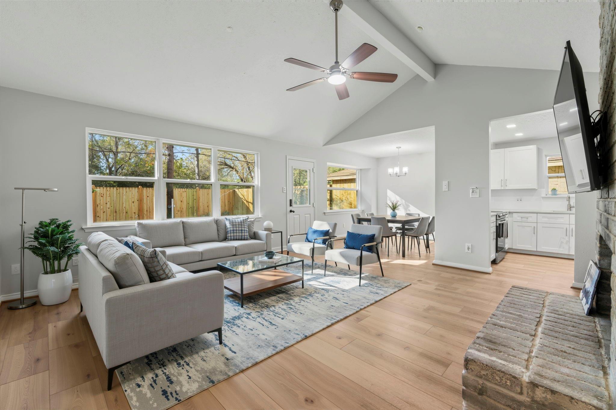 Move-in exceptional home offering better-than-new quality. This thoughtfully renovated 4-bedroom, 2-bath home features a beautifully updated kitchen with quality cabinetry, quartz countertops, and modern appliances, opening seamlessly to the dining area for easy everyday living and entertaining. Throughout the home, enjoy high-quality flooring upgrades, including waterproof luxury vinyl plank with a thick wear layer in the main living areas for durability and style, and plush, upgraded carpet with premium padding in the bedrooms for added comfort. Additional interior improvements include recessed lighting, updated doors and trim. Major behind-the-scenes upgrades include a full PEX-A plumbing re-pipe, electrical updates, and HVAC improvements, providing confidence and long-term value. Set in a quiet community with no back neighbors, surrounded by mature trees and nature, this home offers a peaceful, private setting. WELCOME HOME!