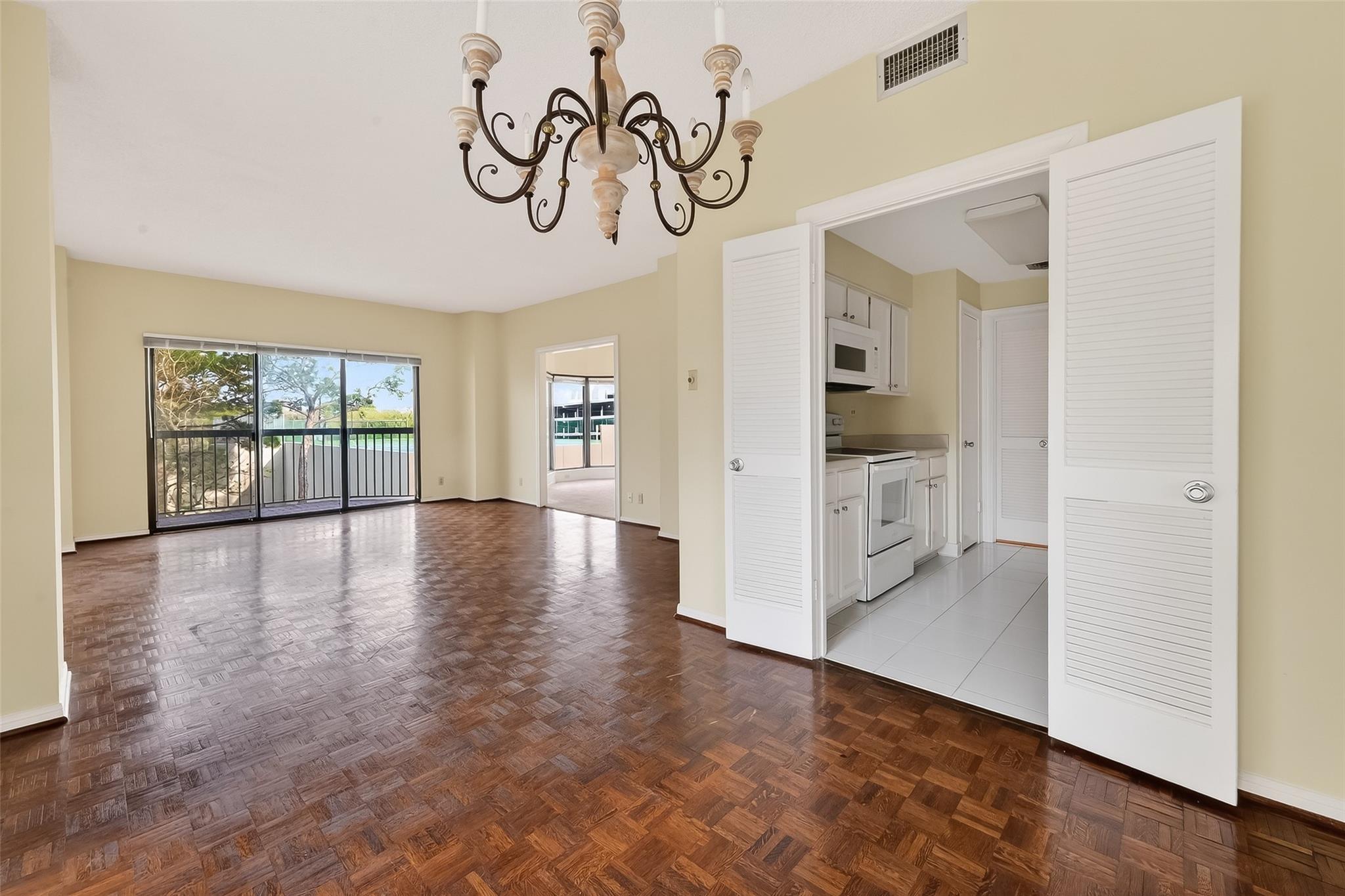 Large 2-3 bedroom unit with a pool view, priced to sell! One bedroom has been opened up to serve as a dining room or home office, and could easily be restored to a bedroom if needed. Please verify room dimensions!