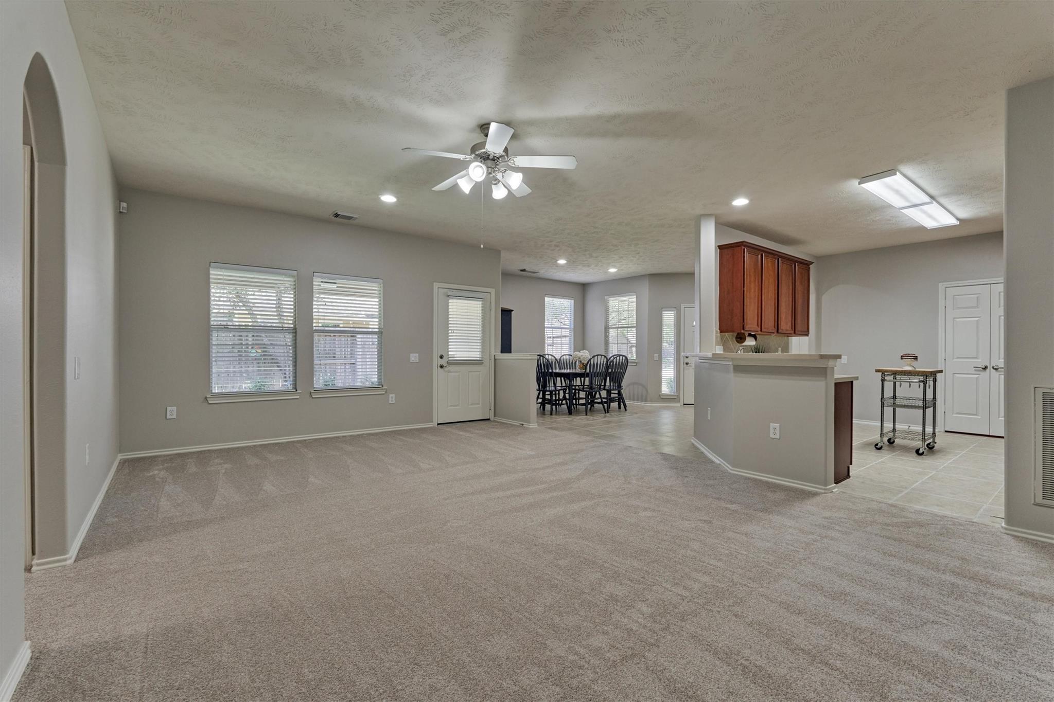 Welcome to 7 Greenwich Pl, a charming townhome in the gated 55+ community of Windsor Lakes. Bright, open floor plan w/ '26 carpet & seamless flow between the living, kitchen & dining areas. Ideal for comfortable everyday living. Spacious primary suite features a large walk-in closet & ensuite bath w/ vanity & walk-in shower. 2nd BR & full bath. Enjoy private patio. '26 interior paint, exterior locks & handles, driveway leveling & outdoor fan; '25 water heater, landscaping; '24 LED lighting; '22 commodes; '21 roof. Windsor Lakes is a unique gated enclave with a village-like atmosphere developed by The Woodlands Dev Co. 12,000SF clubhouse w/ gym, library, arts & crafts room, game room w/ pool table & shuffleboard, lighted pickleball court, lighted bocce ball court, ballroom, catering kitchen, resort style pool & spa w/ a beautiful deck area for outdoor entertaining. Near 242 and I-45, just minutes to Conroe, The Woodlands, shopping, post office, dining, Costco & world-class healthcare.