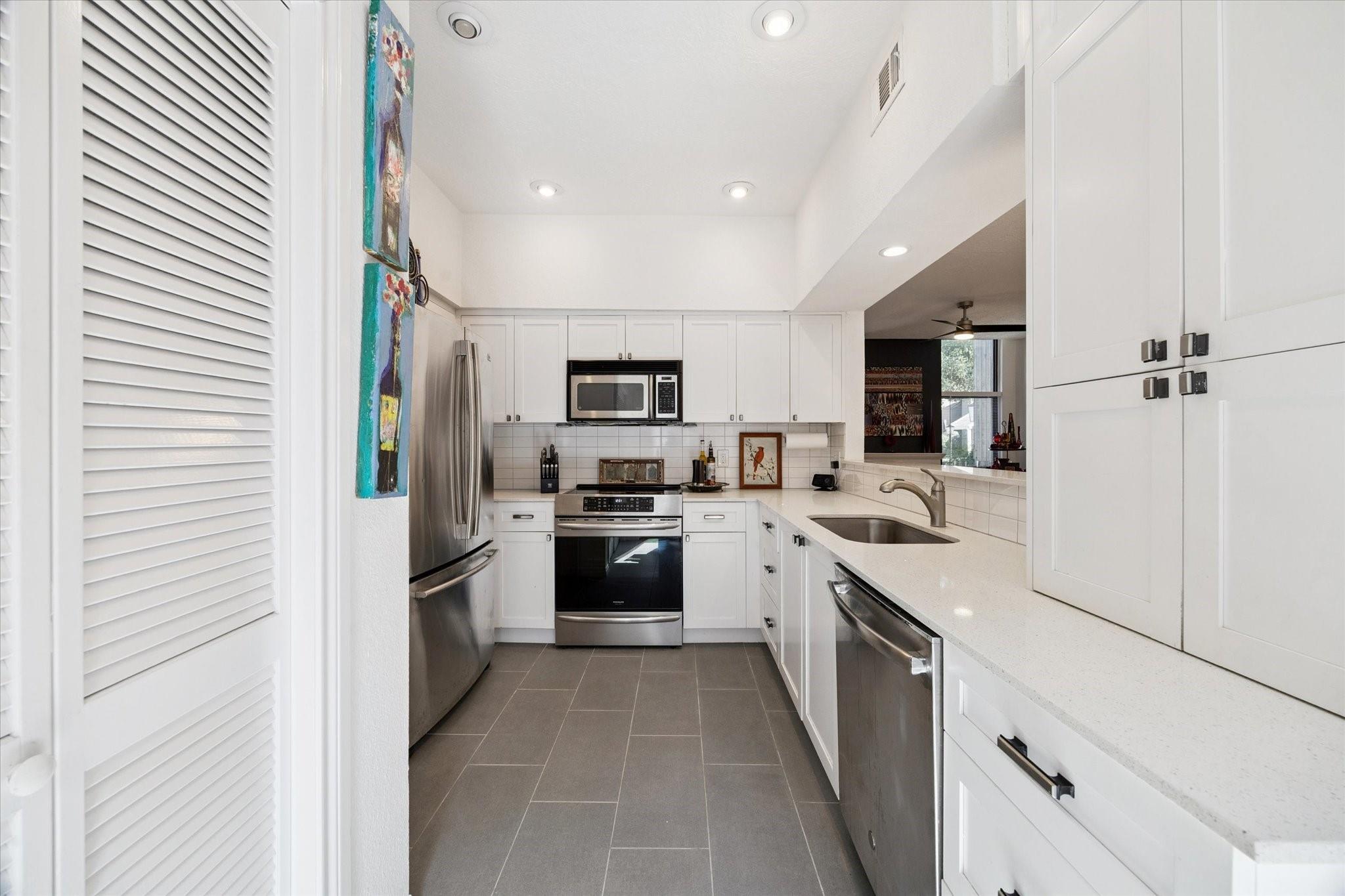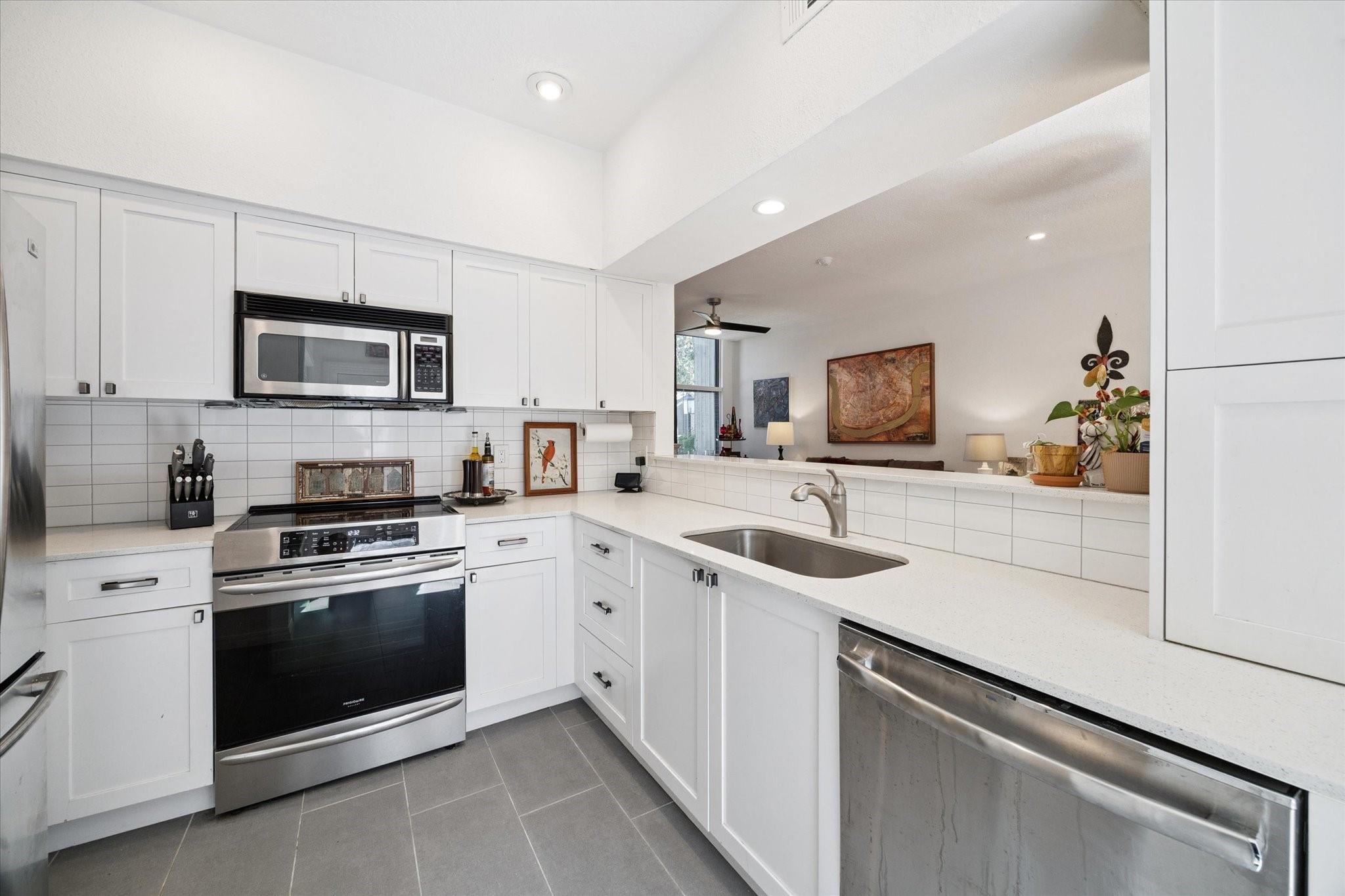 Amazing townhome in very desirable Woodway Pines featuring a remodeled kitchen and baths with new countertops, new cabinets and hardware. Hardwood floors in living and dining areas. Living area has wood burning fireplace with floor to ceiling windows. Kitchen opens up with a pass through to breakfast bar and has stainless appliances including recent induction range. French doors open up to private brick patio and adjacent 2 car garage. Upstairs has a second large living area/home office and spacious primary bedroom with en-suite bath with a walk in closet. Recent improvements include an electric panel with whole house surge protection, PEX piping, water heater. Woodway Pines has beautiful and walkable grounds with community pool. HOA covers the exterior building maintenance, trash, water and sewer, front yard maintenance in addition to the common areas. Across Bering is Tanglewood Park with a dog park and tennis courts. Great property and location to Houston's Galleria area.