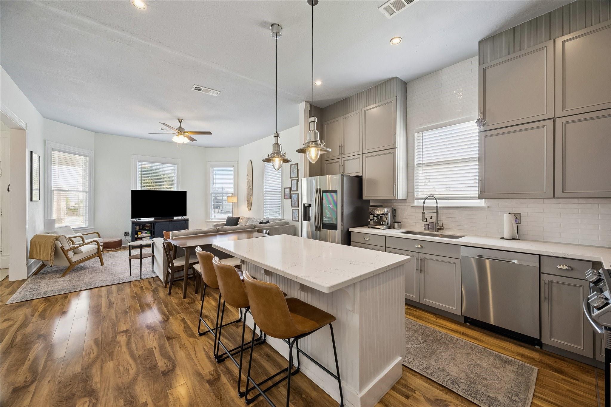 This beautiful remodeled Duplex is located one block from the beach on Broadway. All furnishings are included. Separated Meters for Gas, Electric and Water. Restaurants, UTMB Medical Center and walking areas are close by with a partial beach view from second floor balcony.