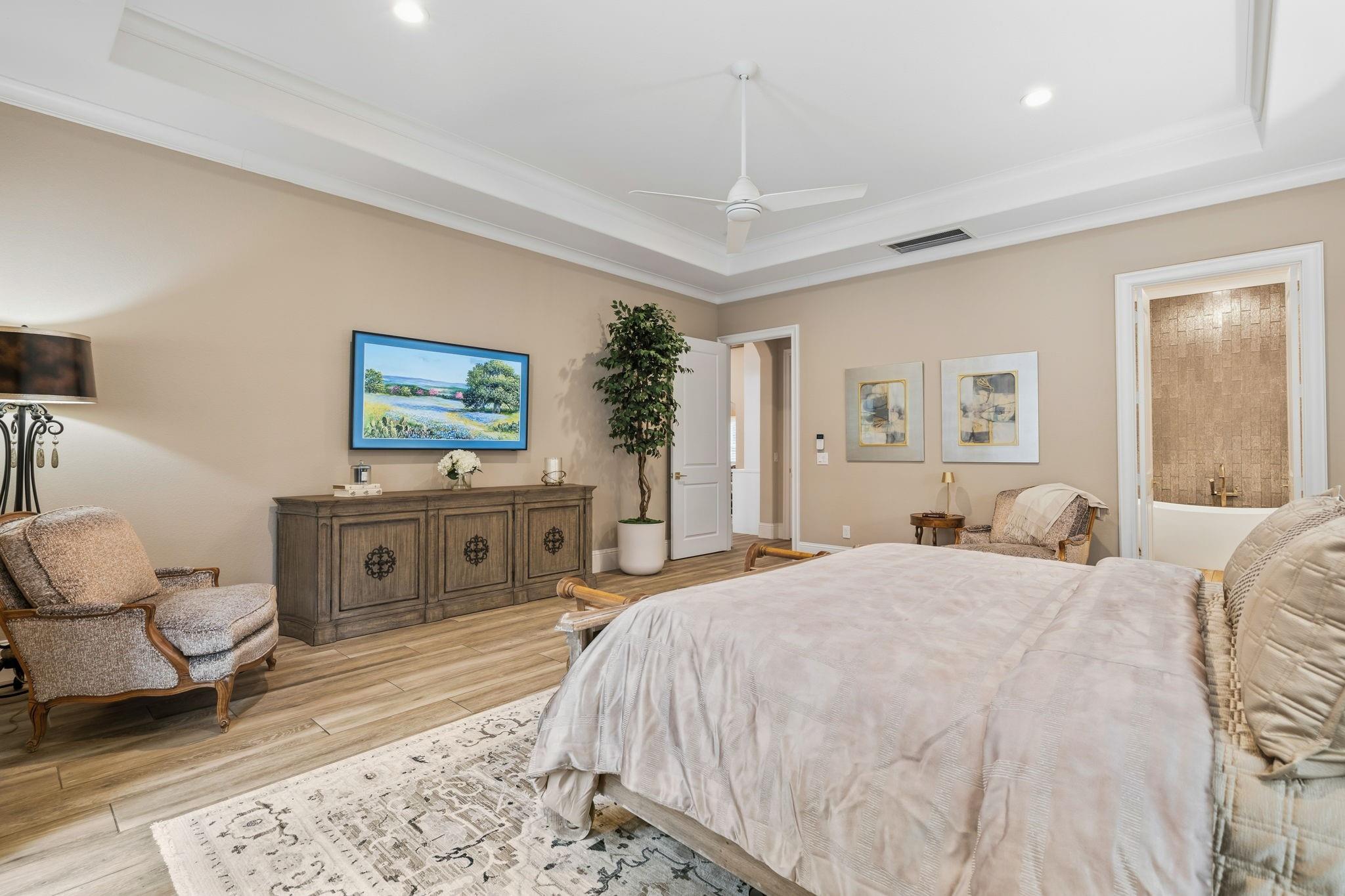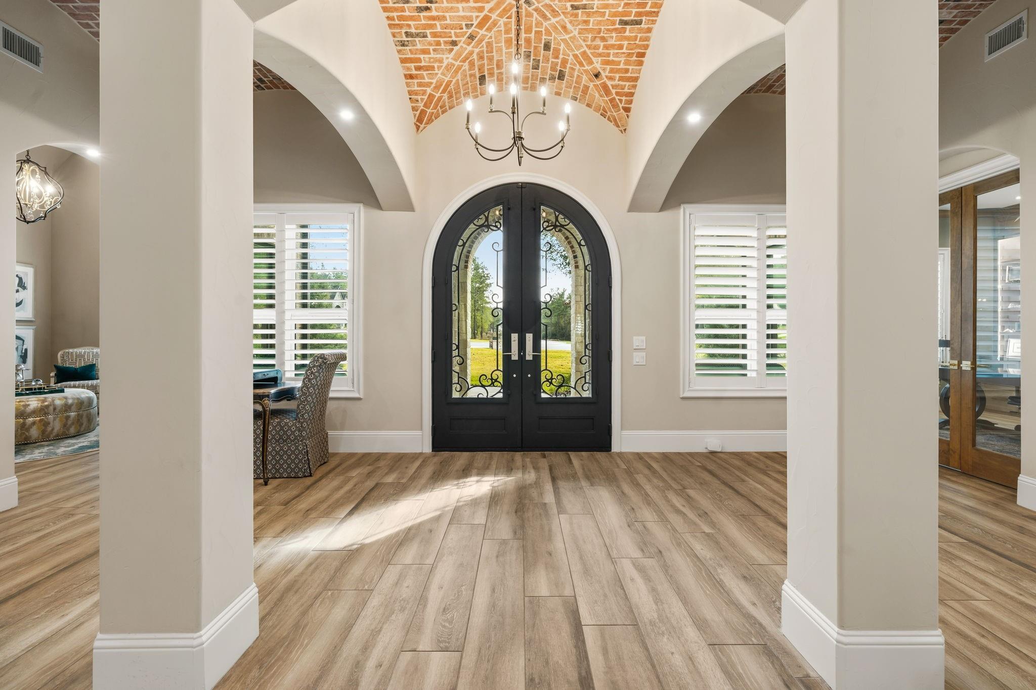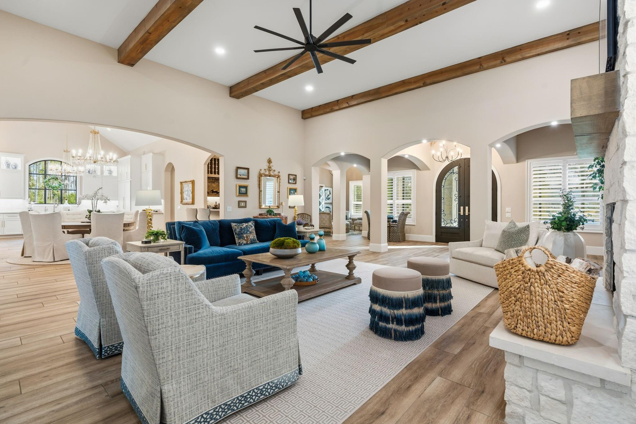 Understated luxury and exceptional craftsmanship define this custom home in a sought-after acreage community. Set on 1.5 acres, the 1.5-story residence offers 5,064 SF with three main-level ensuite bedrooms and an upstairs bedroom or game room, as well as a media room. A dramatic entry with custom iron doors and a brick groin ceiling sets the tone. Enjoy a private office with built-ins, formal dining, and open living with stone fireplace, custom shelving and bar—ideal for entertaining. Chef’s kitchen features Dacor/Thermador appliances, generous storage, two pantries, and seamless flow to casual dining. The primary suite is a true retreat with elegant finishes and French doors opening to the pool. Outdoor living impresses with a covered patio, vaulted ceiling, fireplace, outdoor kitchen and resort-style pool/spa, plus ample yard space for recreation. Complete with a 3-car garage and 1,750 SF RV garage, this home offers a rare blend of luxury, versatility and timeless design.