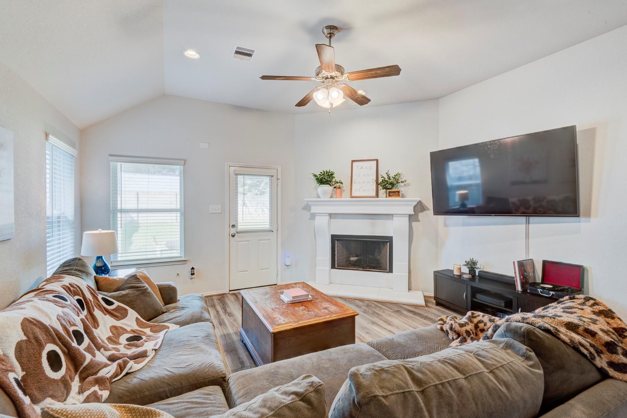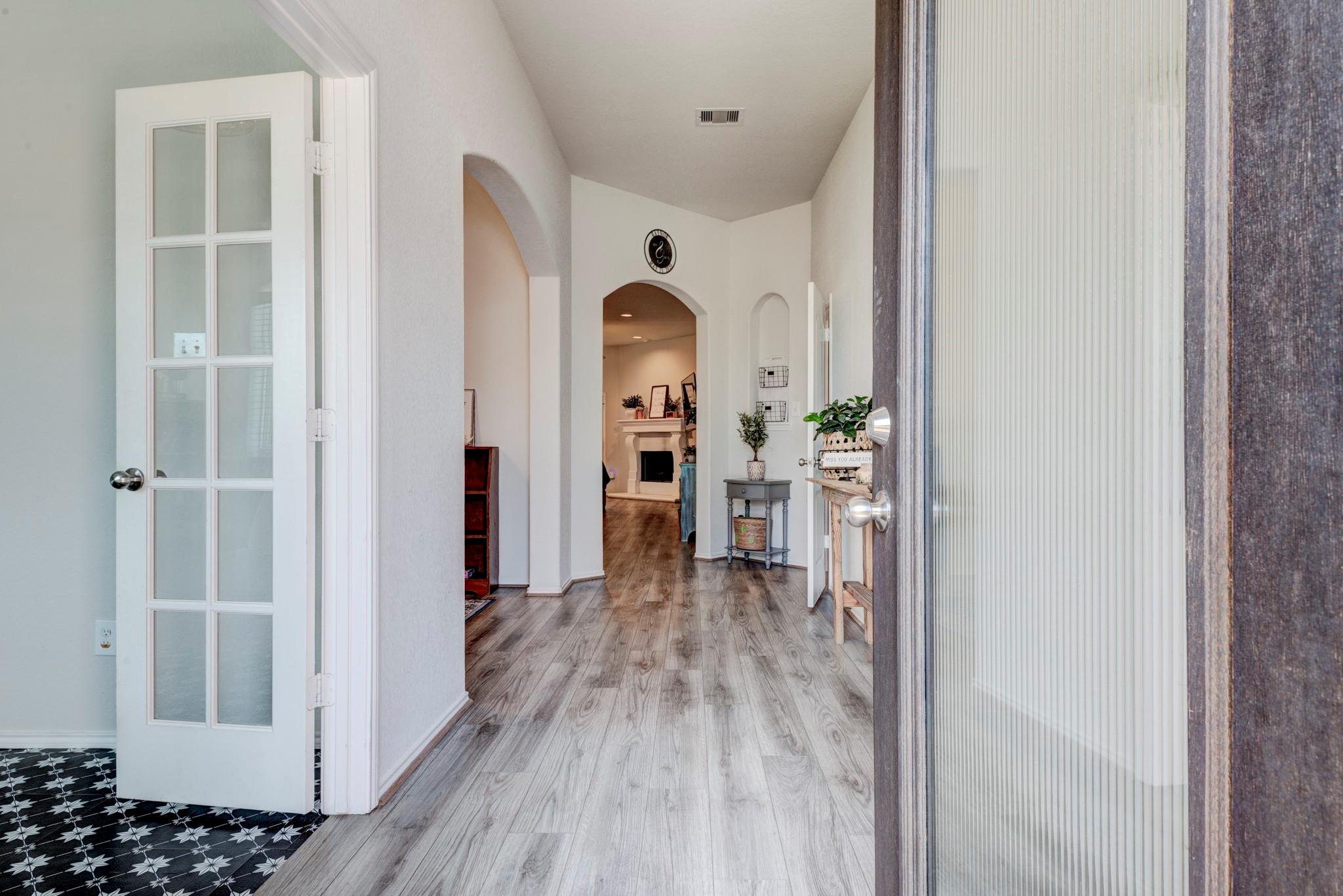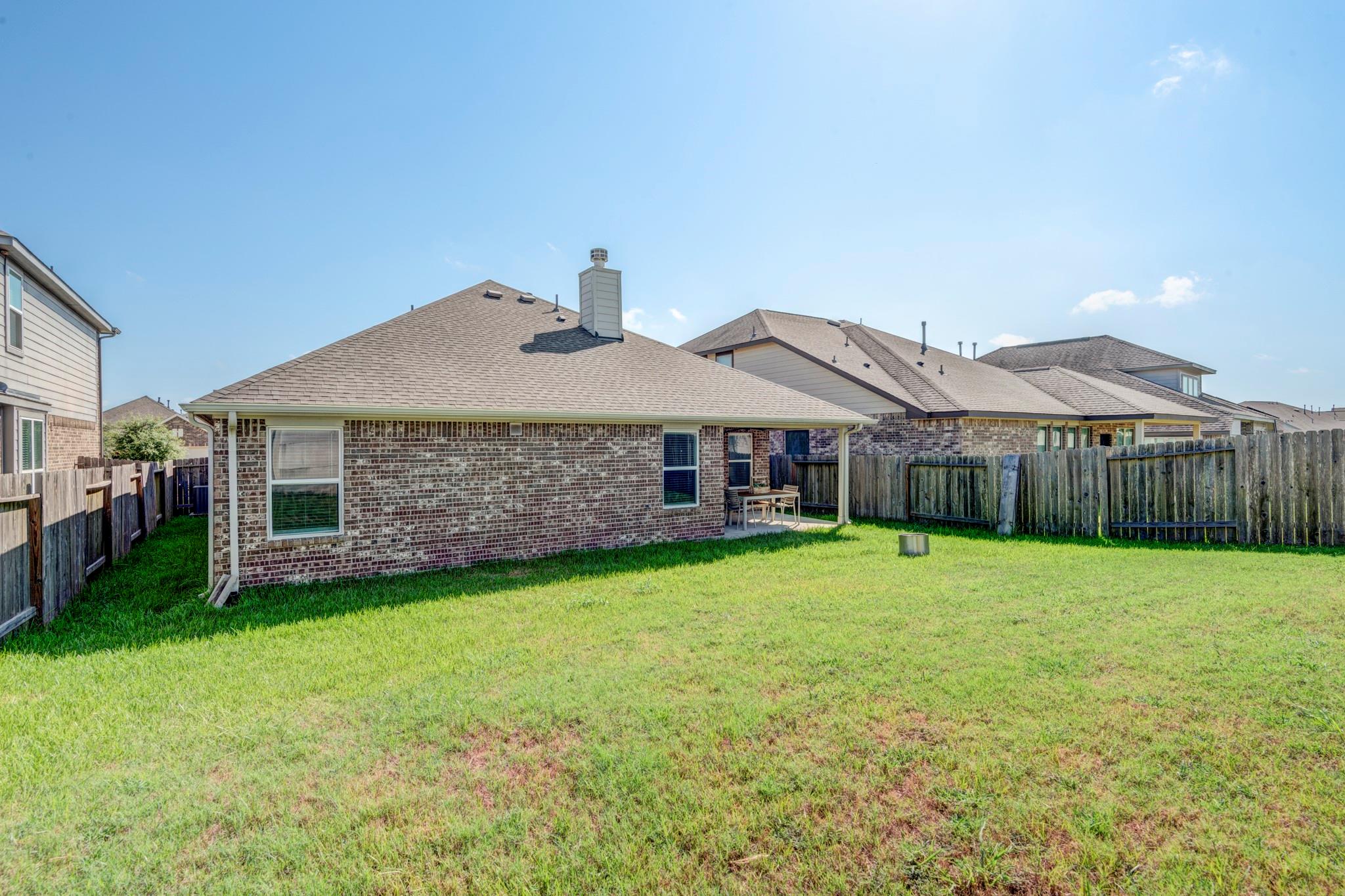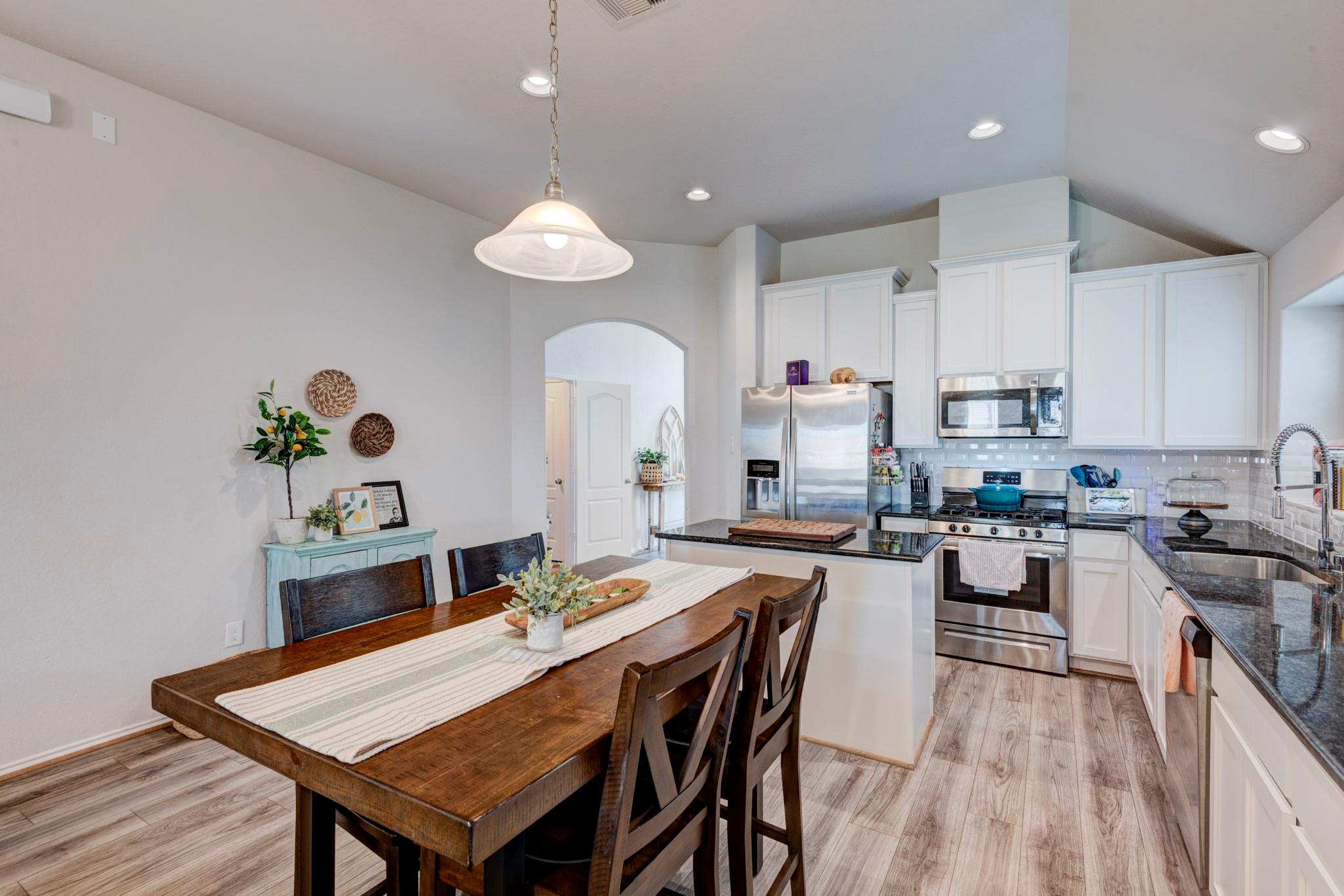 Gorgeous stone and brick one story, 4 bed, 2 bath home with study and formal dining! This spacious home has 10 foot ceilings, wide hallways and Rigid Core LVP flooring in the main areas for easy clean up. Open floor plan with stunning kitchen perfect for entertaining! Luxurious dark granite countertops contrast beautifully with the white cabinetry, 42" uppers, island, tile backsplash, tons of work area and pantry. Kitchen perfectly situated to add farm house table for a stunning breakfast room. Open good sized living room with fire place opens to covered back patio with tv mount. Bedrooms are located off to the right of the home with a spacious primary bedroom with huge closet and attached bath with dual sinks, vanity space, wc, soaking tub and standing shower. Generous secondary bedrooms sit toward the back of the home. Tons of upgrades- recessed can lights, ring doorbell, full sod, irrigation system, garage door opener, full gutters, 4 sides brick and no back neighbors! Tour today!