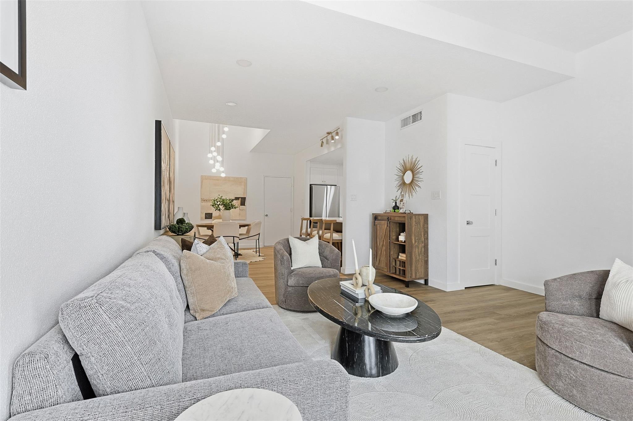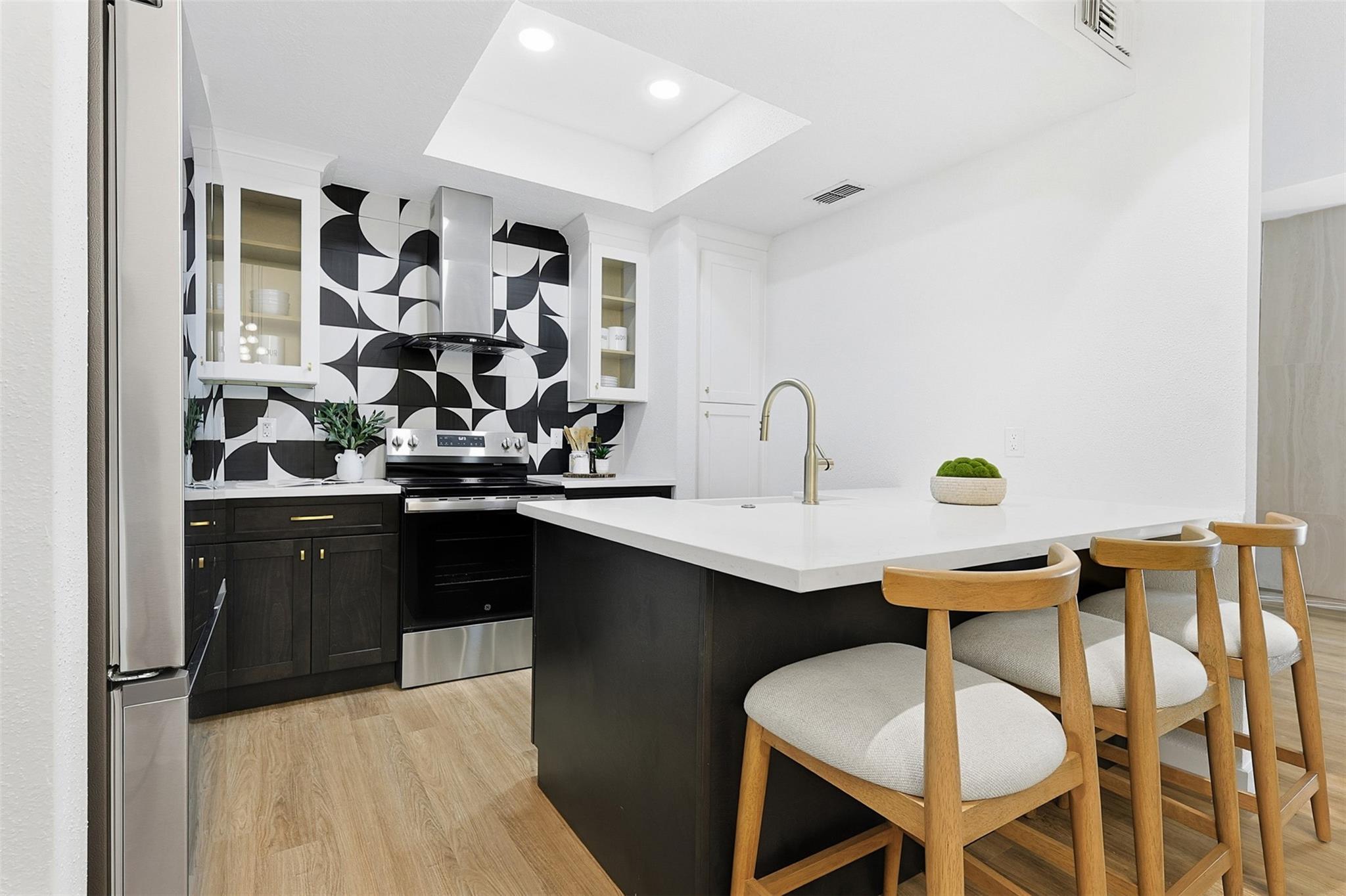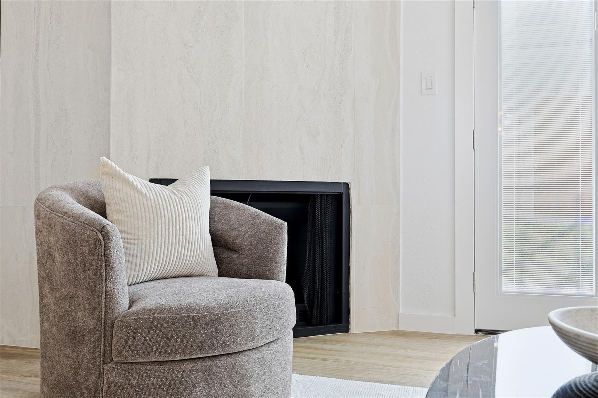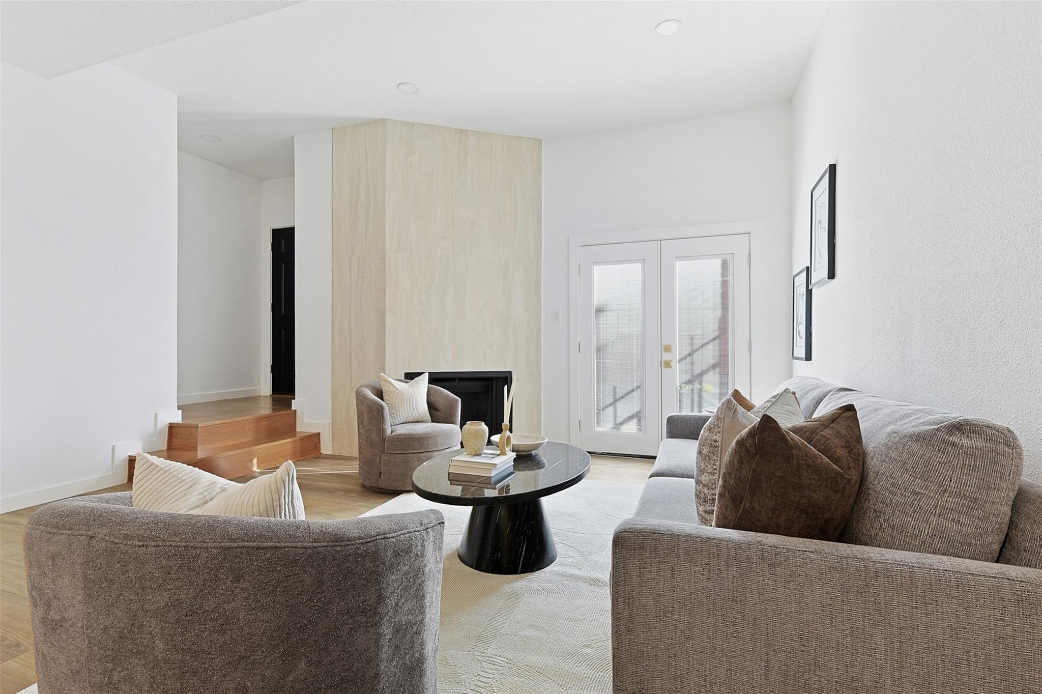 Exquisitely updated home in the highly sought after community of The Bradford! In an unmatched location, this pristine home sits in a quiet oasis, minutes away from fine dining, shopping and entertainment. A lovely foyer leads to the living room, with wooden floors and a beautiful fireplace. French doors facing the front open to a lovely terrace, and tall ceilings bring openness to the area. The completely new kitchen has beautiful soft closing cabinets and quartz countertops. The contrasting backsplash enhances the huge island. Adjacent to the living room, there is a completely renovated, conveniently located half bathroom. A stunning wood stair leads to the spacious main bedroom with a generously sized closet and an enchanting little balcony. The luxurious ensuite main bathroom has a double sink with quartz countertop, modern accent lighting and glass enclosed shower. The second floor also has a well-sized secondary bedroom, and another completely renovated bathroom.