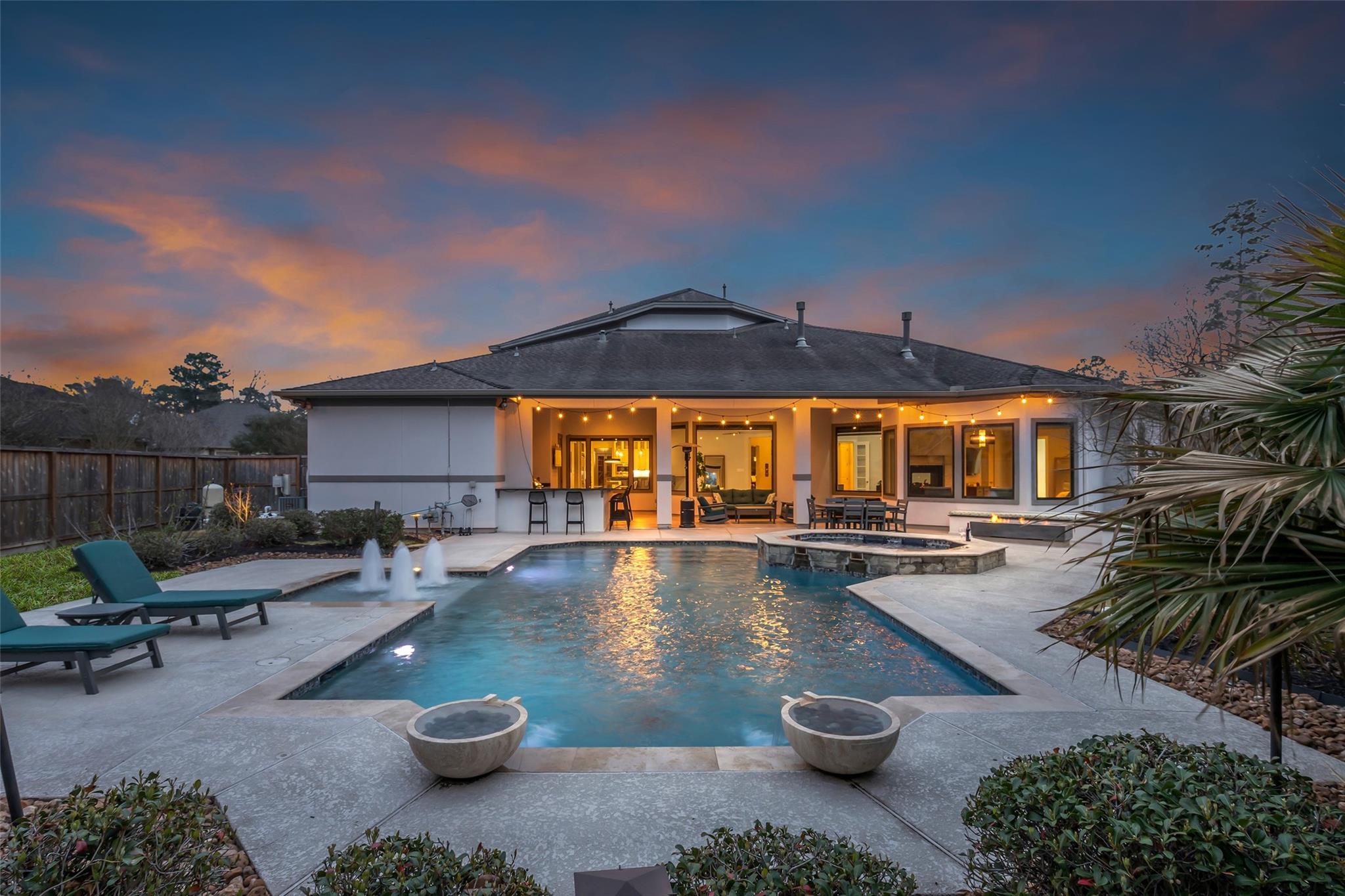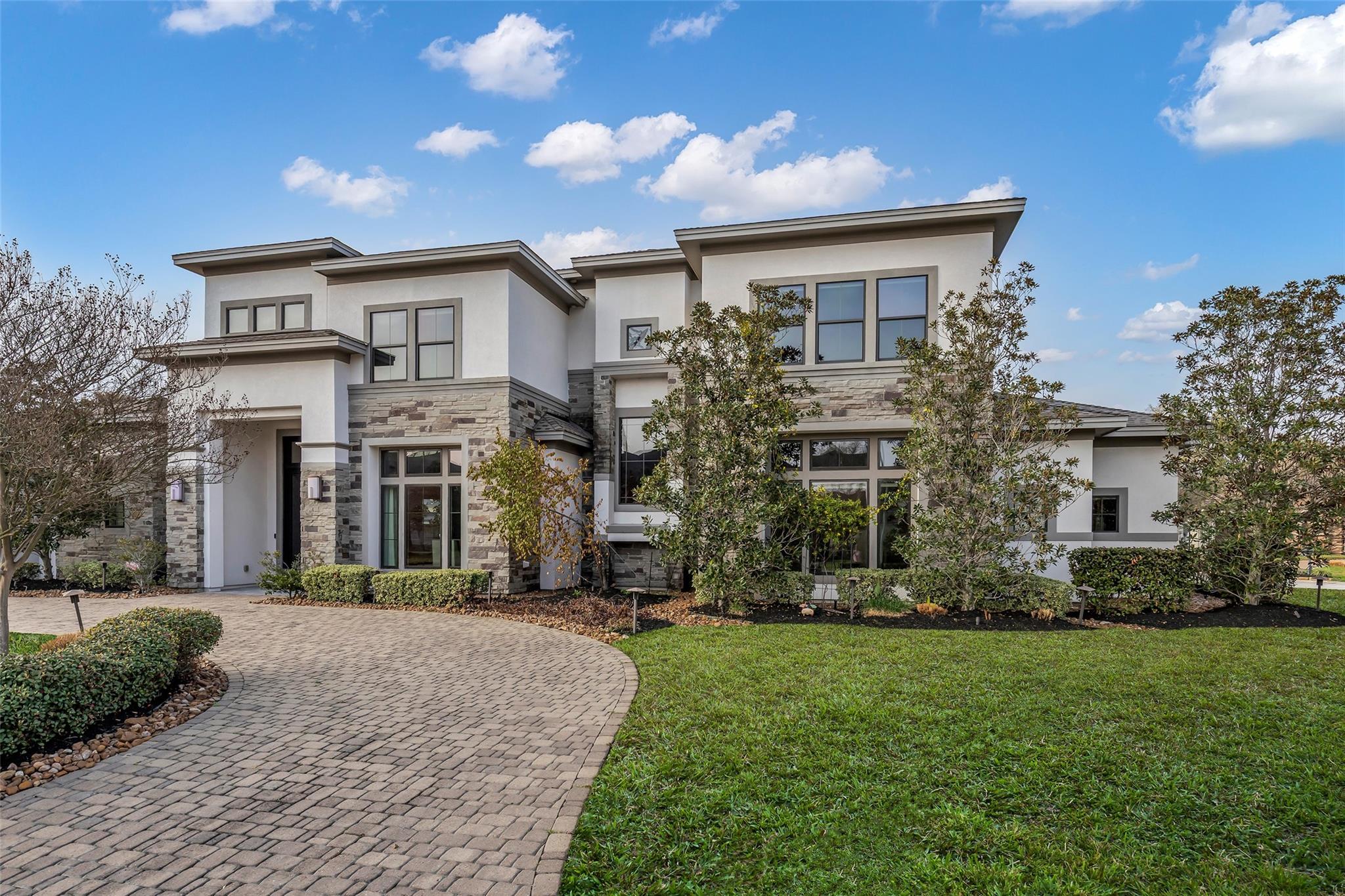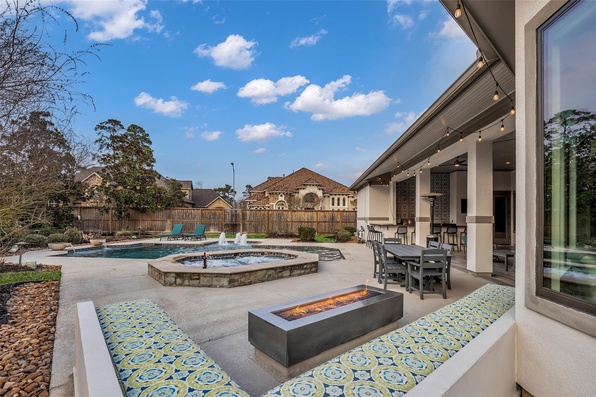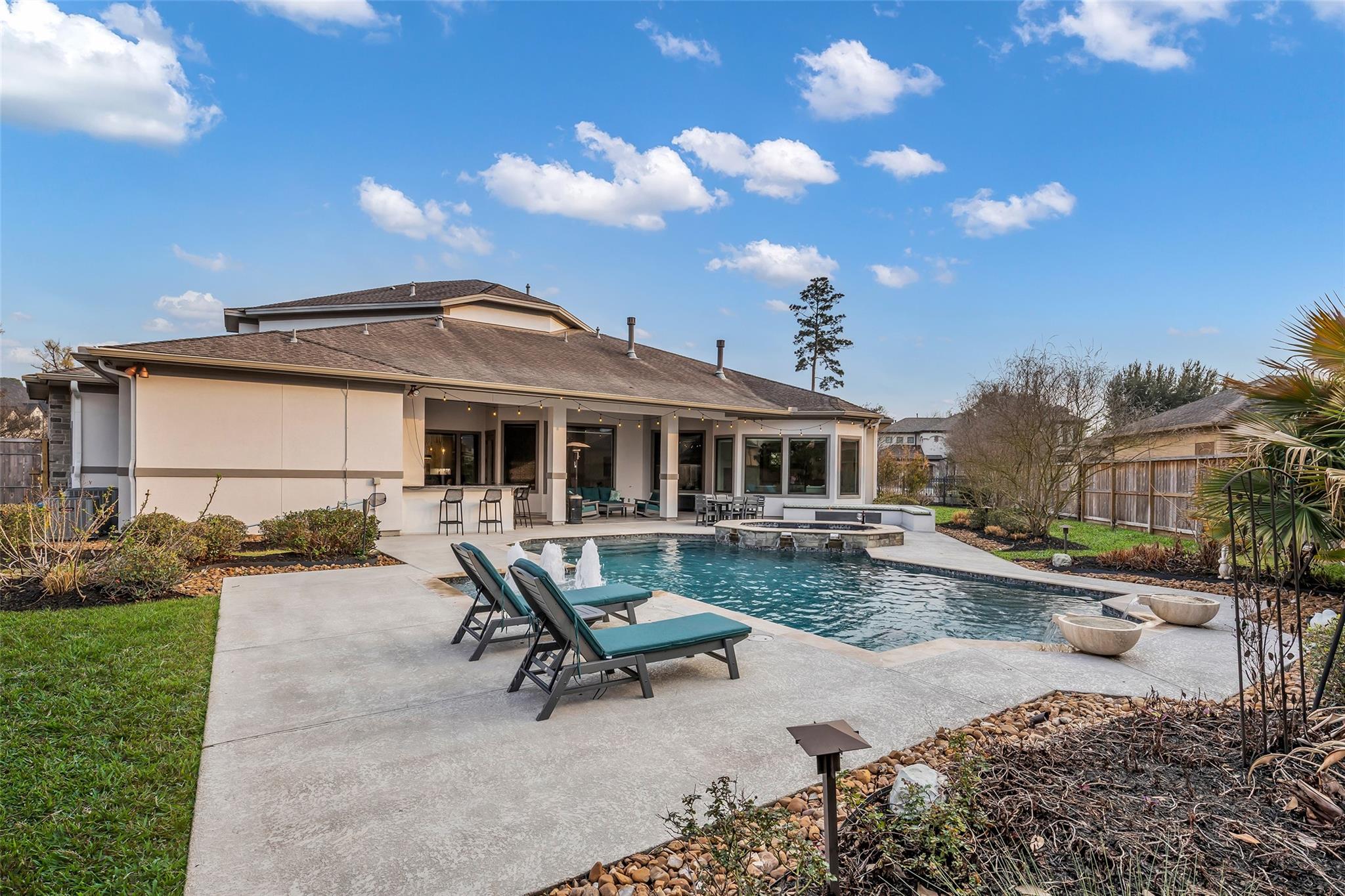 Striking custom home on an oversized corner lot in Creeks of Augusta Pines blends clean lines with thoughtful modern design. Features 4 bedrooms, 4 full and 2 half baths, including a private first-floor guest suite. It offers French oak floors, soaring ceilings, whole-house audio, water filtration, a generator, and a state-of-the-art theater with a 110” screen and dedicated cinema seating. The gourmet island kitchen showcases Thermador appliances, two sinks, display cabinets, and a walk-in pantry. Includes a full bar and dual wine cellars for 300+ bottles. The luxurious primary suite includes a sitting area, fireplace, spa-like bath with steam shower, oversized jetted tub, dual sinks, and an expansive closet. Outdoors, enjoy a covered patio with a summer kitchen, pool, spa, firepit, mosquito system, sprinklers, and a 3-car garage. Experience luxury living with all these amenities in one stunning property.