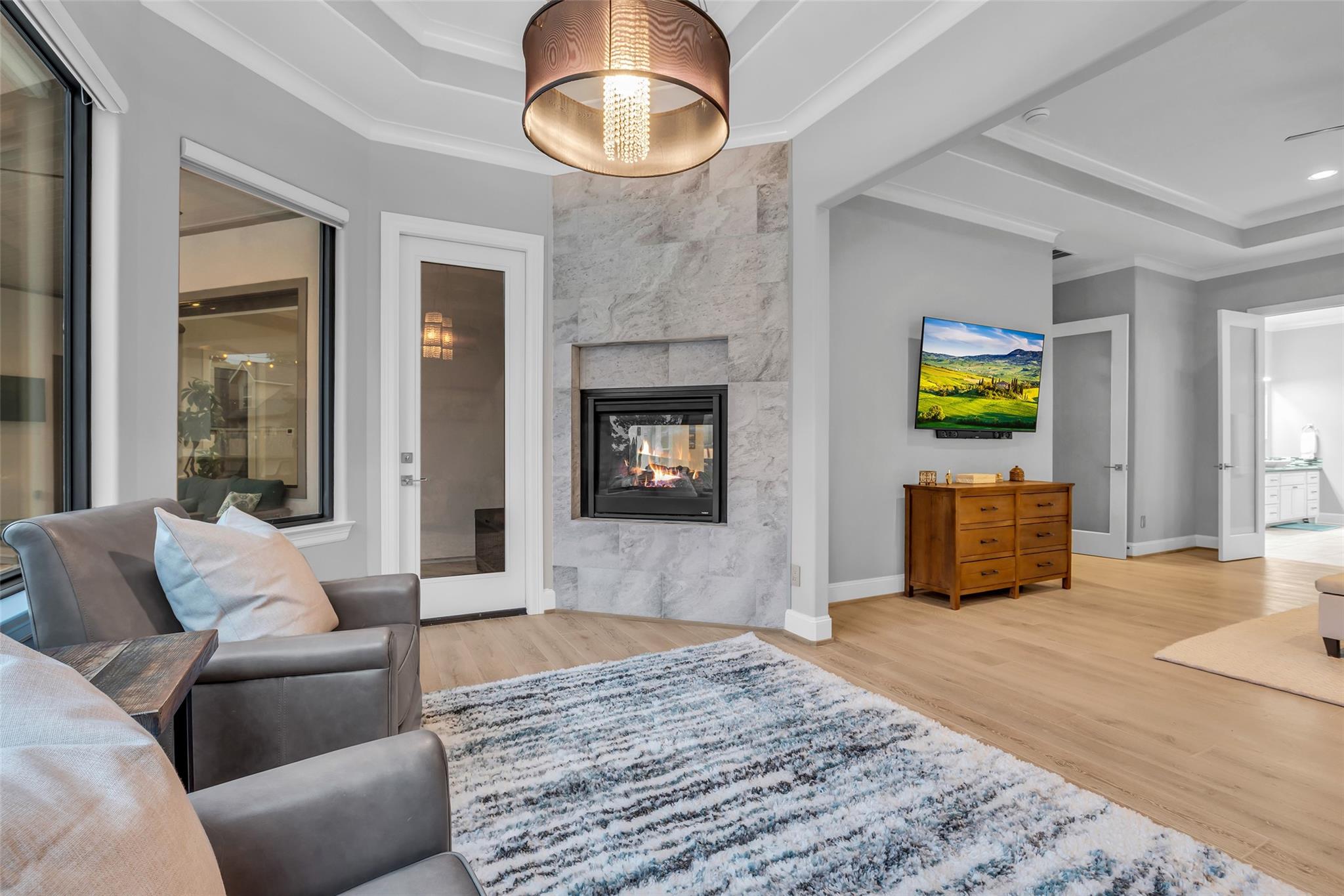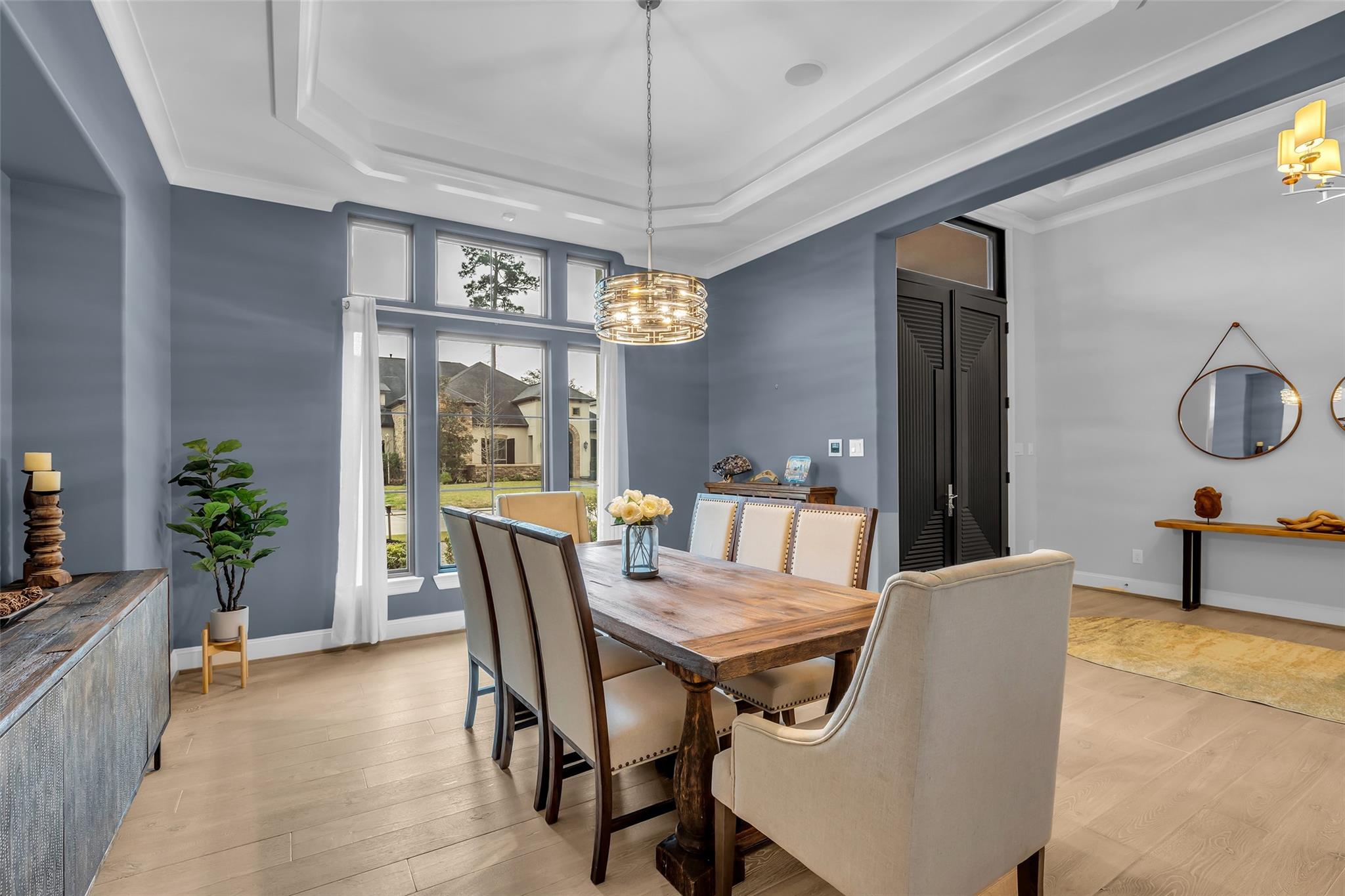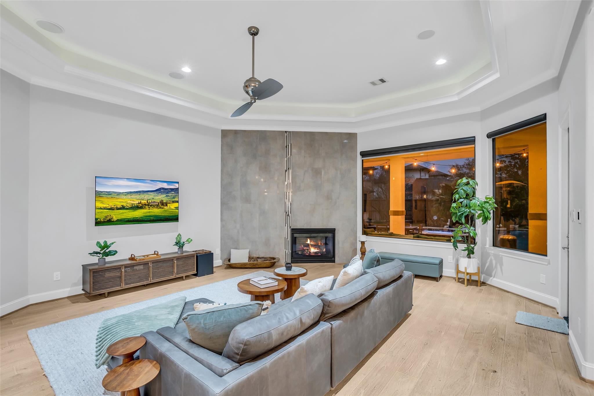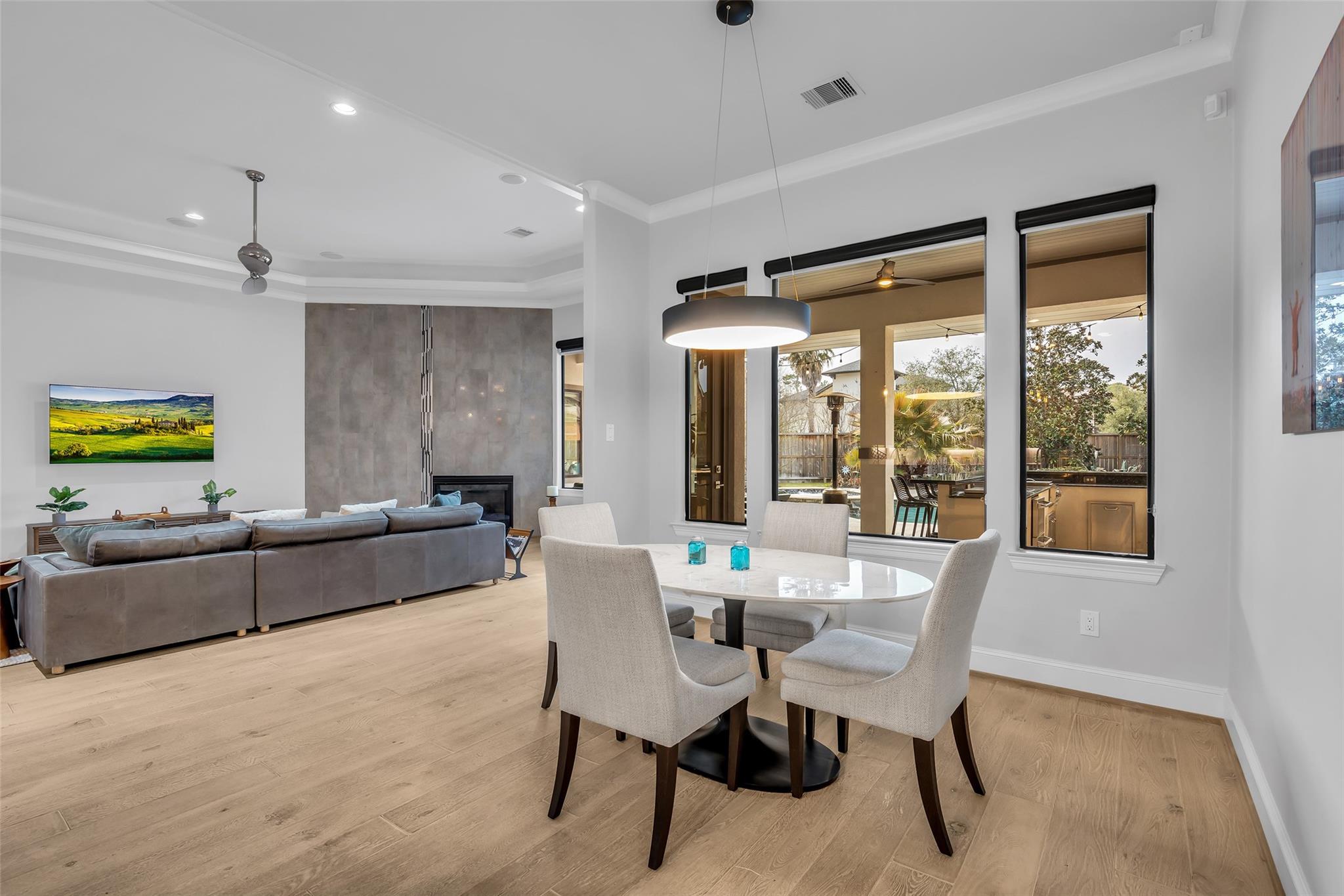 Striking custom home on an oversized corner lot in Creeks of Augusta Pines blends clean lines with thoughtful modern design. Features 4 bedrooms, 4 full and 2 half baths, including a private first-floor guest suite. It offers French oak floors, soaring ceilings, whole-house audio, water filtration, a generator, and a state-of-the-art theater with a 110” screen and dedicated cinema seating. The gourmet island kitchen showcases Thermador appliances, two sinks, display cabinets, and a walk-in pantry. Includes a full bar and dual wine cellars for 300+ bottles. The luxurious primary suite includes a sitting area, fireplace, spa-like bath with steam shower, oversized jetted tub, dual sinks, and an expansive closet. Outdoors, enjoy a covered patio with a summer kitchen, pool, spa, firepit, mosquito system, sprinklers, and a 3-car garage. Experience luxury living with all these amenities in one stunning property.