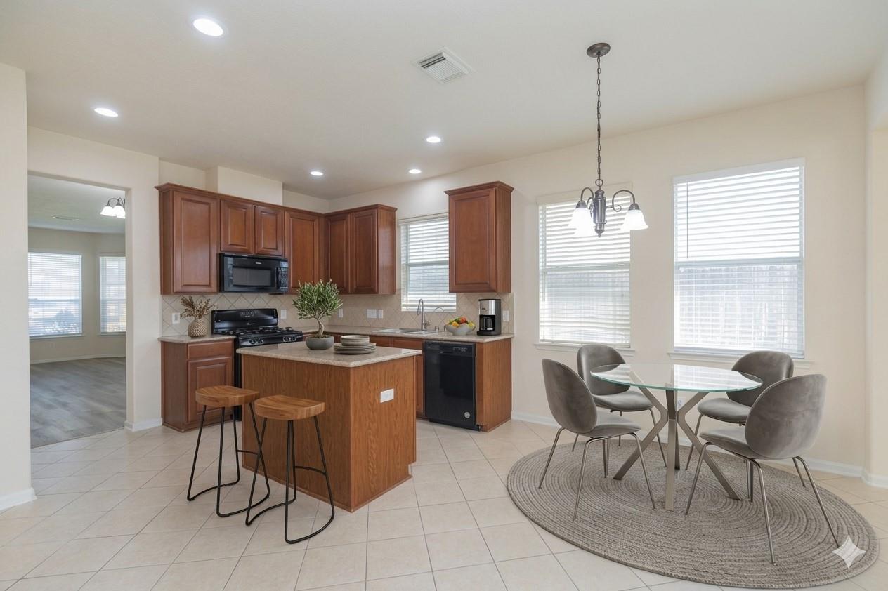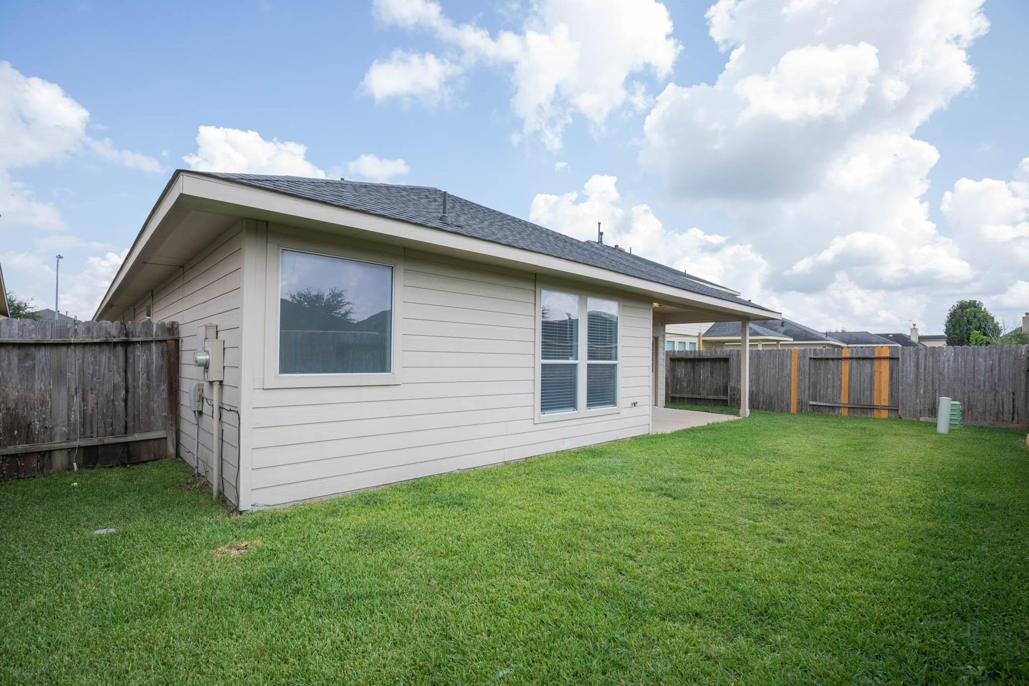 Energy saving low utilities bills because New AC installed (July 2025), New roof (07/2025). New /upgraded woodlike vinyl flooring (11/2025), covered portch in backyard. Lovely one story 4 bedrooms and 2 full baths. Gorgeous Designed Tiles floor thru foyer/ entry, island kitchen, family room, and all wet area. Pre-wired surround sound system in many rooms, plus outdoor speaker hook up at Covered patio. Beautiful kitchen w/upgraded cabinets, granite countertop, and nice stone backsplash. Nice community subdivision swimming pool and club house. House built by Morrison Homes energy saving plan - for low utilities bills! 5 minutes to Super HEB, and Super Target!