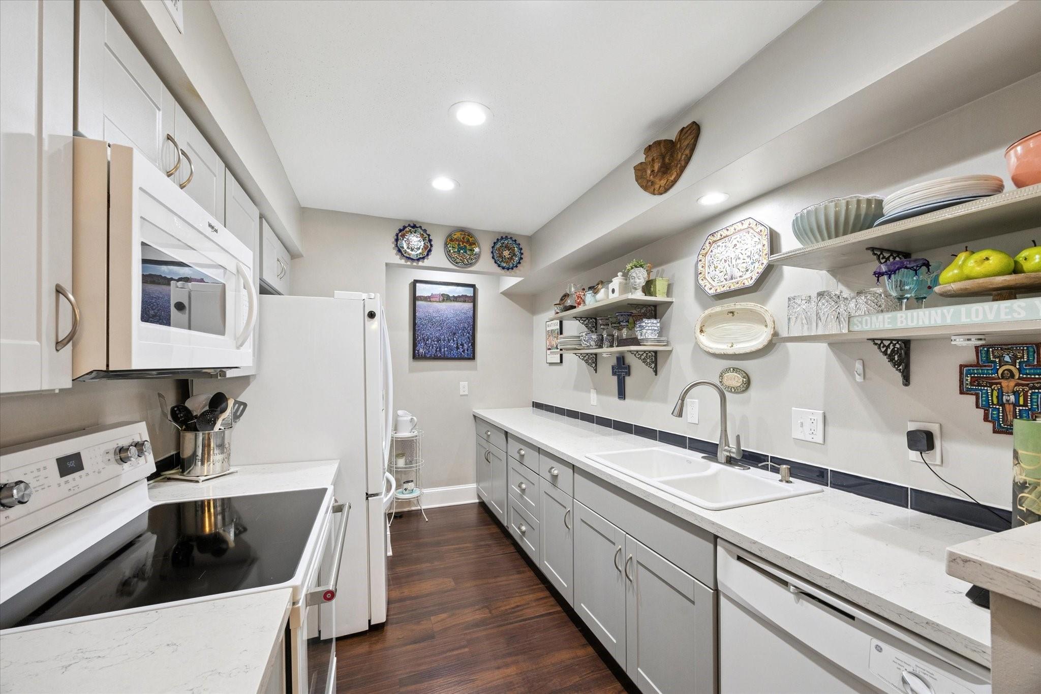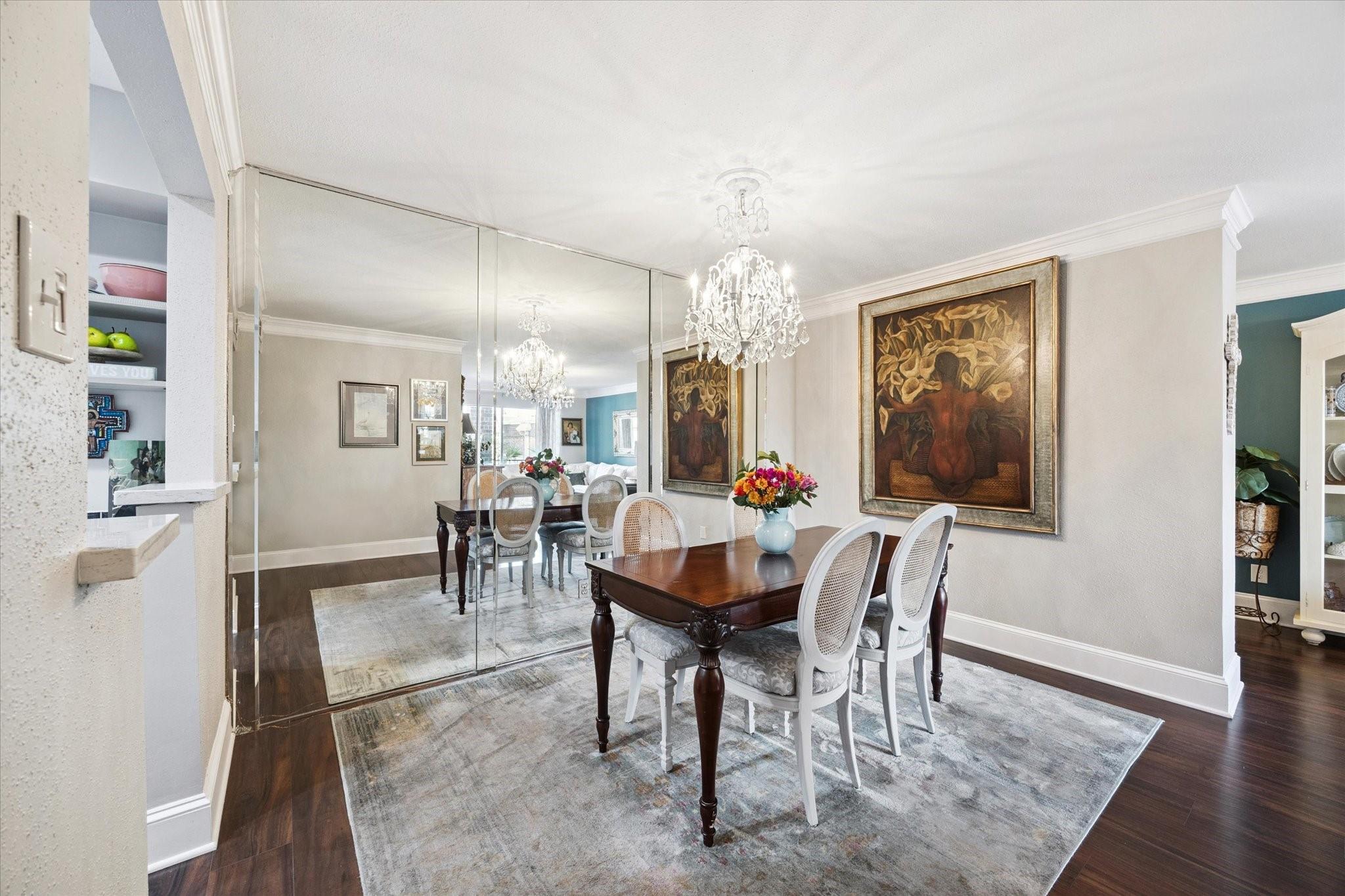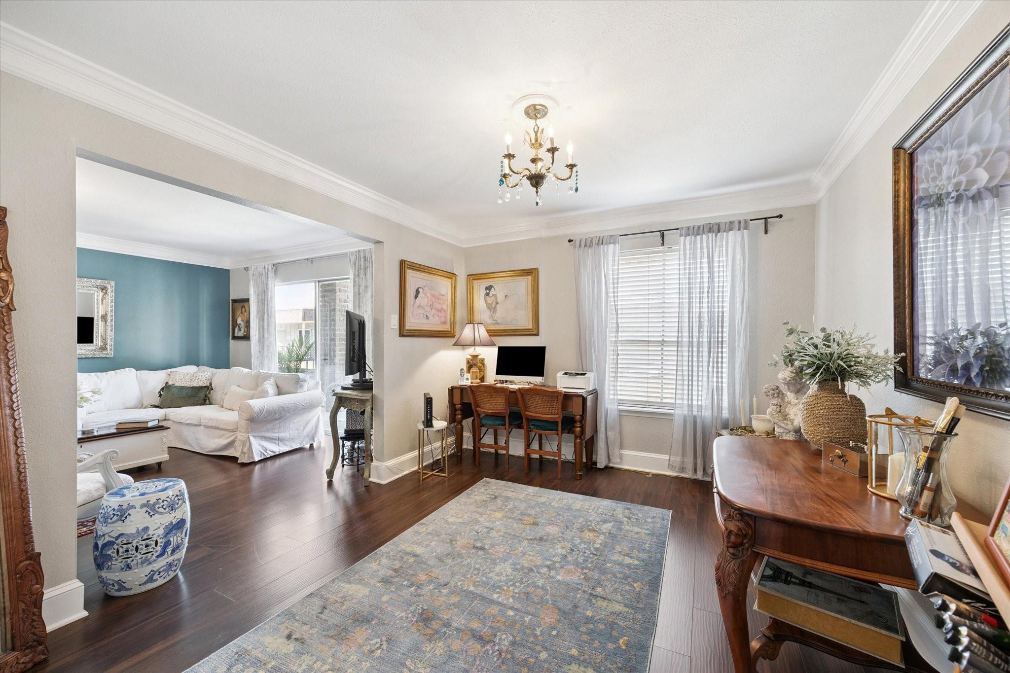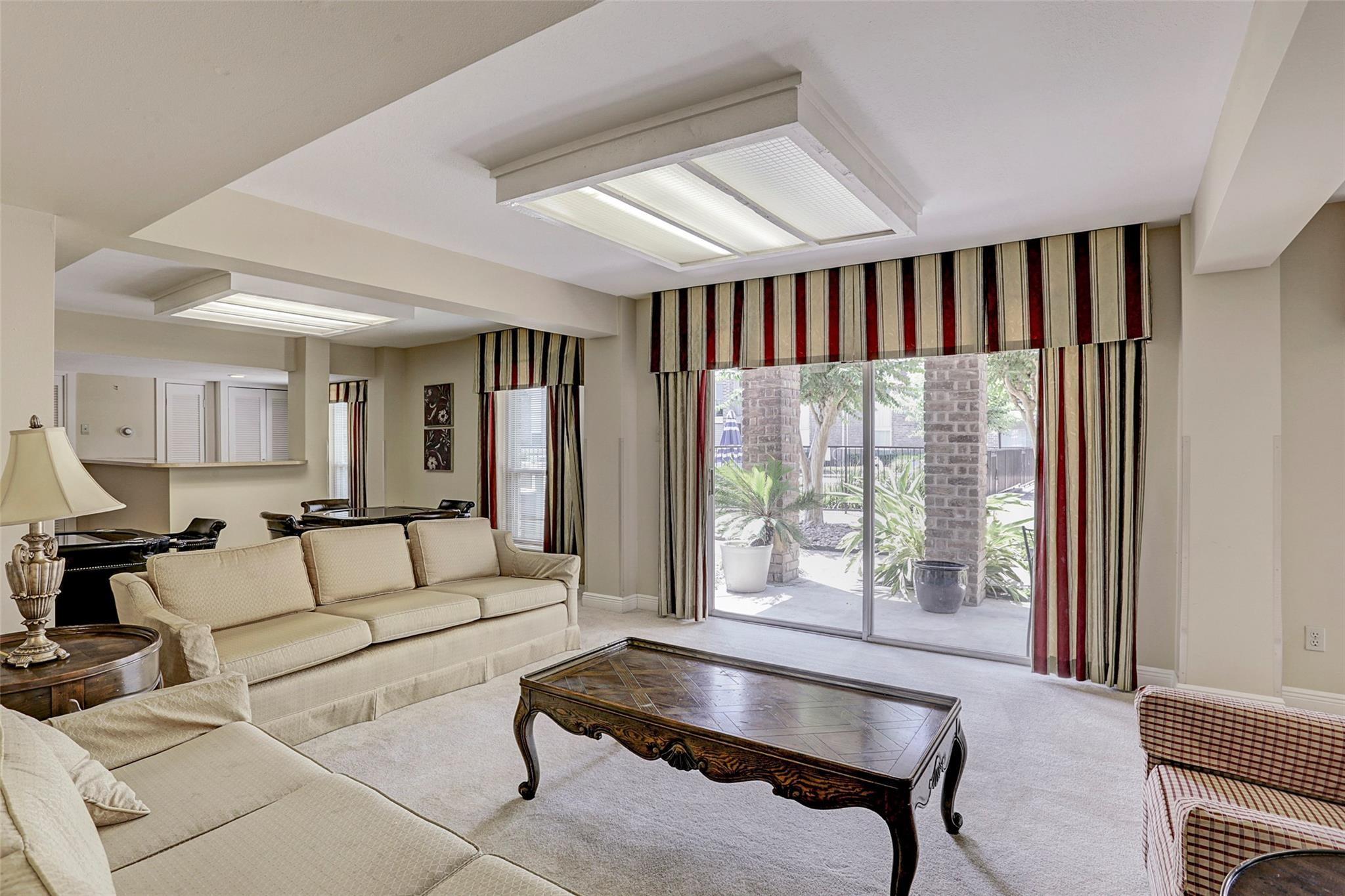 Prime Memorial location, gated with a tasteful and classy Renovation. This corner unit with only one connecting wall has a balcony, double crown, molding, tall baseboards, beautiful chandeliers, engineered hardwood throughout with tiled bath, lovely foyer with bookcases, beautiful window, coverings, complete kitchen renovation, recent appliances in Stone countertops, living room, joints, a spacious home office/study and it has a closet and could be converted into a second bedroom, primary bedroom with double closets and primary bath has lovely stone counter vanity and tub/shower stacked washer and dryer off hallway. Carport has assigned parking and an extra storage closet downstairs easy access to I-10 & 610 Loop there are two pools clubhouse and on site management. Management management fees, cover cable grounds, pool, gates, clubhouse, exterior insurance, electricity, water, sewer, and trash. It’s close to all the memorial amenities and schools, and less than 10 miles from downtown.