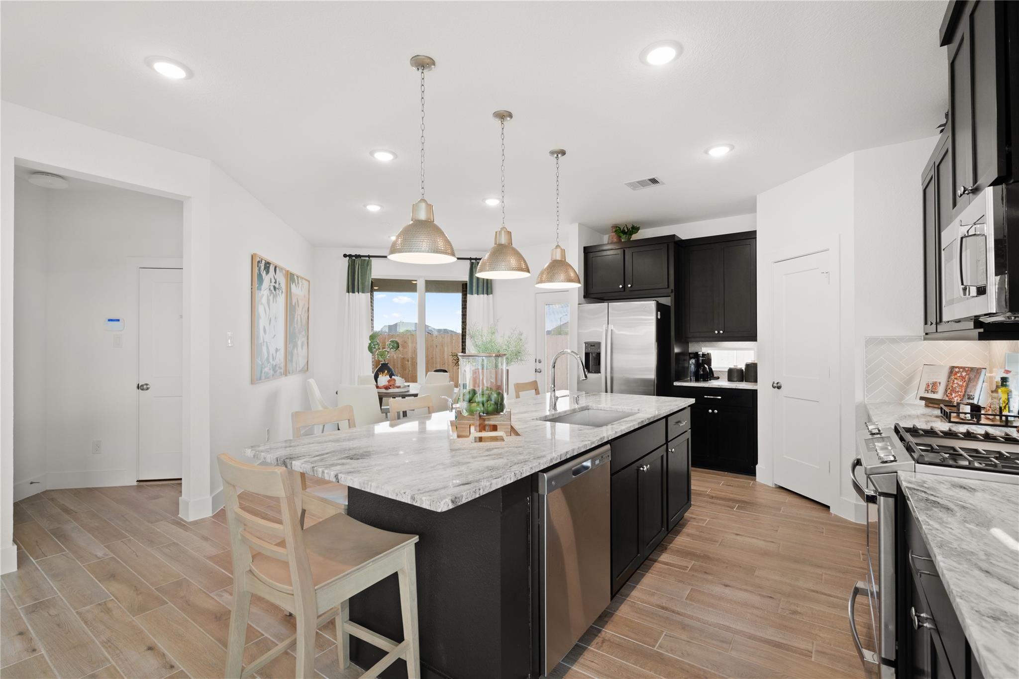 SMELL THE ROSES IN THE ROSEWOOD! This Courtyard Collector is a Crowd Favorite offering Two-Stories of Wide-Open Spaces. First Floor Main Living offering a Sprawling Great Space showcasing Striking Two-story Entry, Large Family Room, a Pocket Office, Quartz Island Kitchen, and Casual Dining leading out to Covered Patio. Upstairs Main Owner’s Suite w/ Attached Spa Bath featuring Dual Sinks, Large Shower, and Spacious Walk-in Closet. Roomy Secondary Bedrooms are located around Central Flex Space making for Convenient Game Room or Study Space. Modern Upgrades, GE Stainless Steel Appliances, Blinds, Security System, Sprinkler System, Full Gutters, Fully Sodded Yard + Landscaping Package all included!