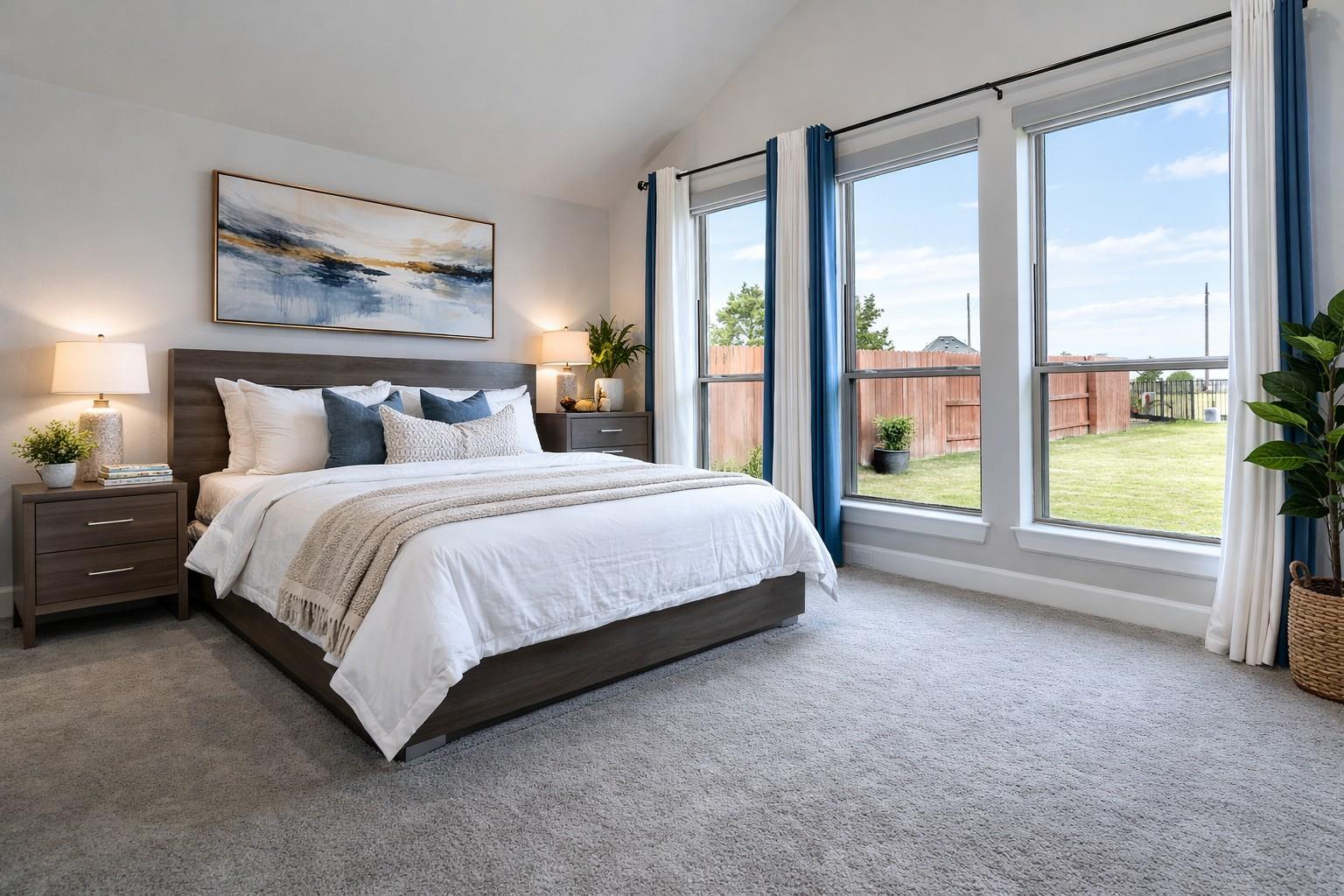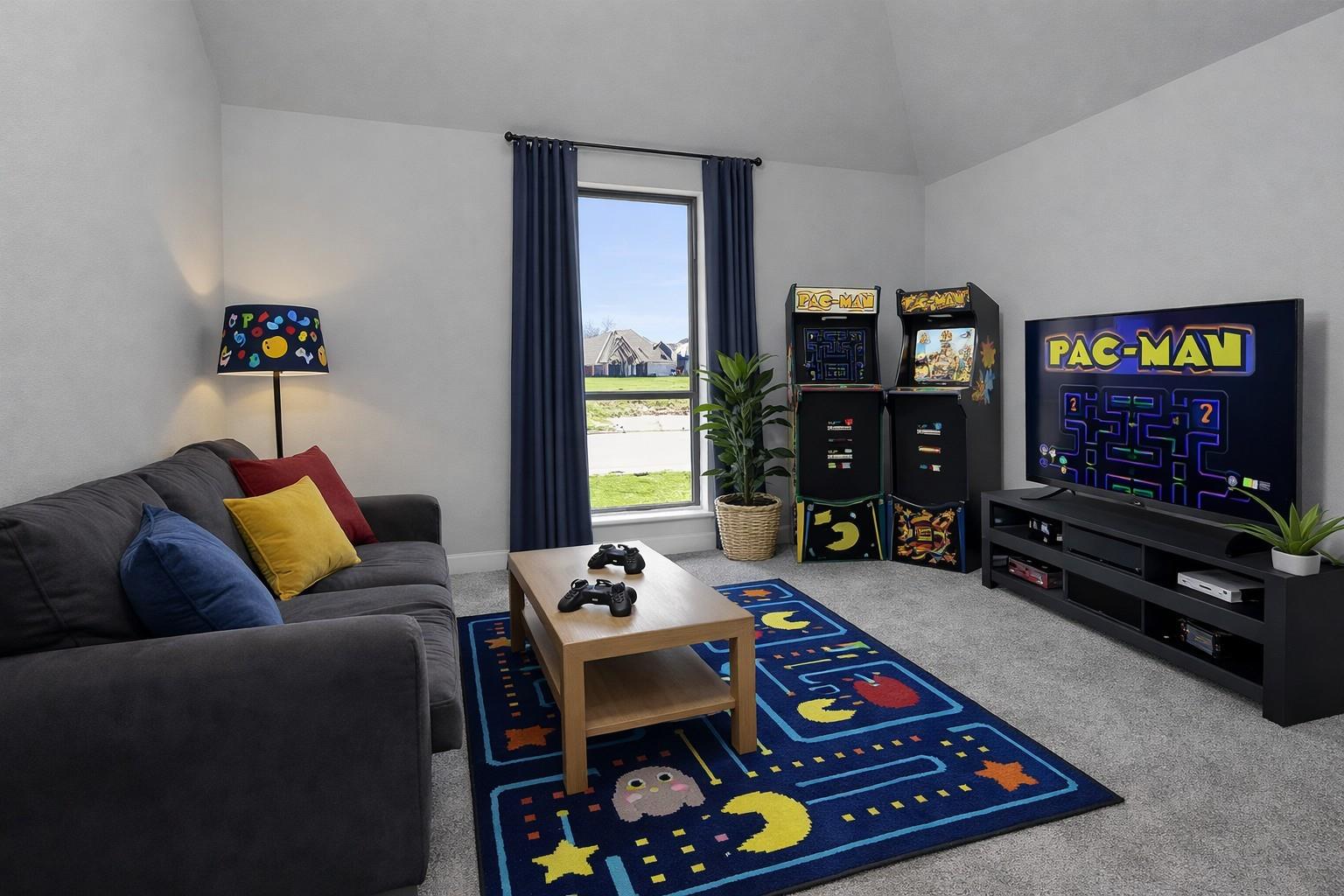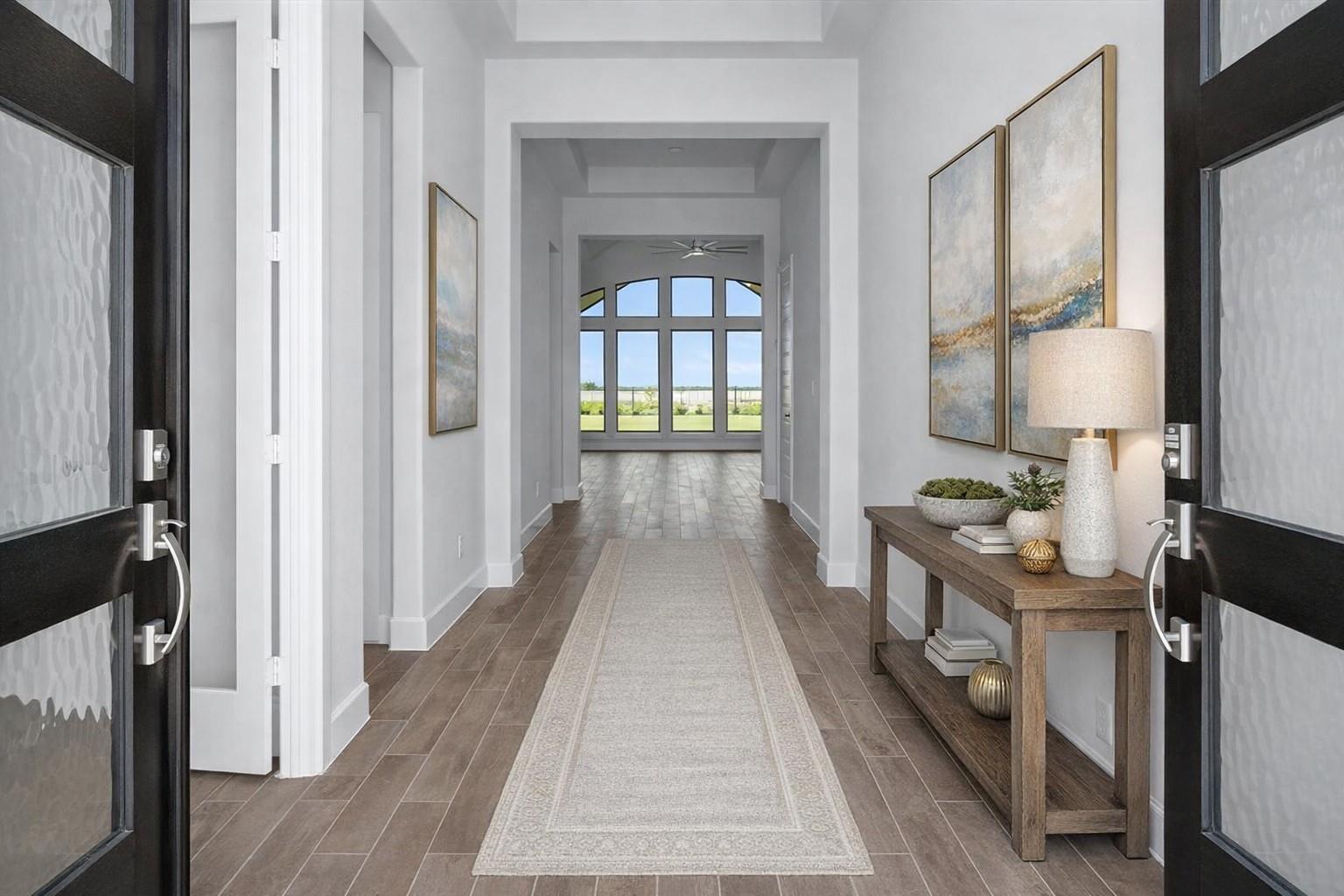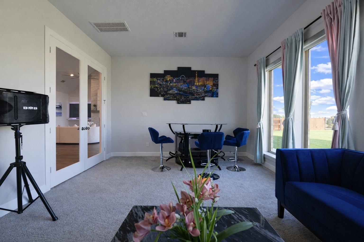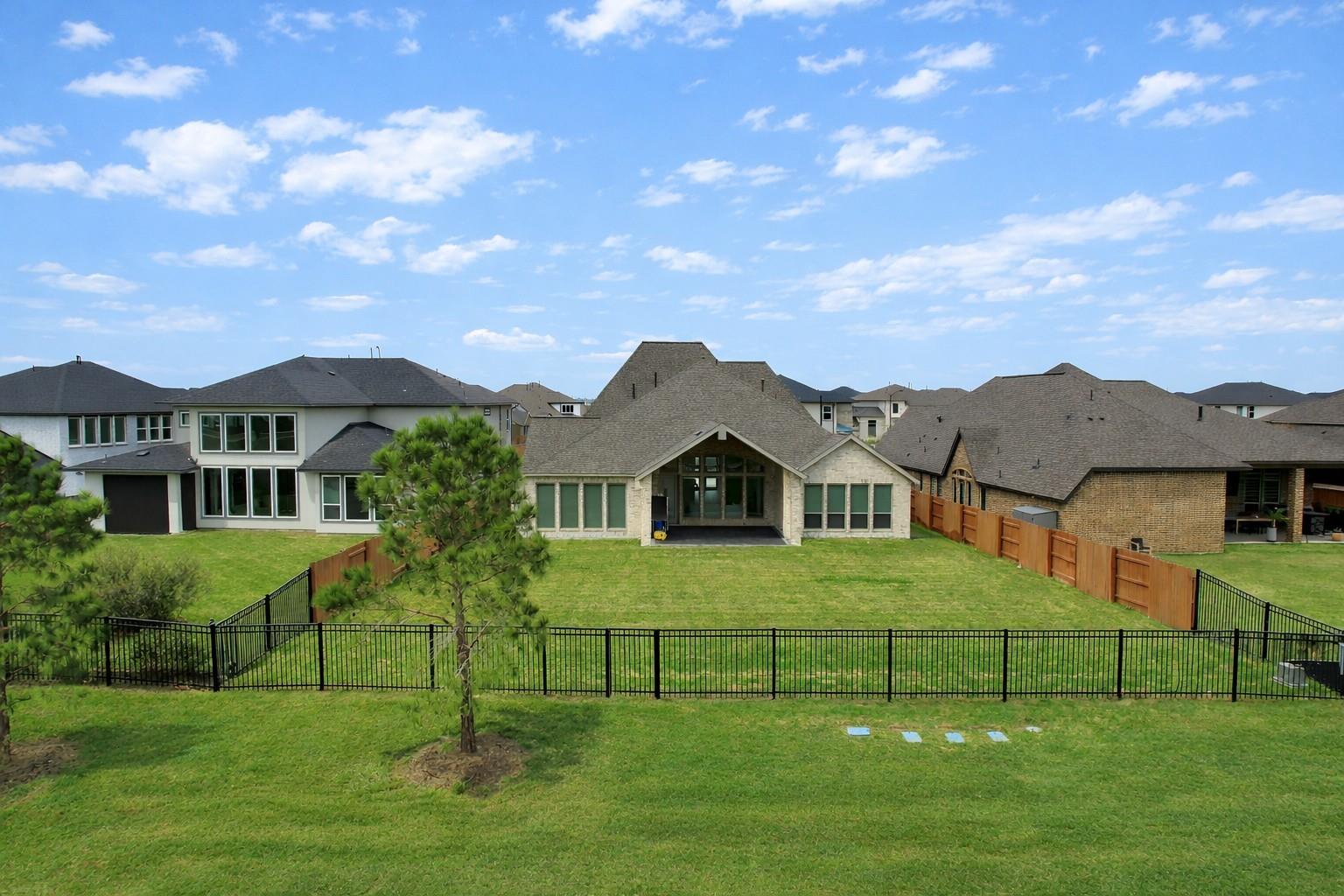 Stunning Perry Homes offering modern elegance, soaring ceilings, and an exceptional open-concept. This spacious four-bedroom home welcomes you with a private home office featuring French doors and a 12-foot ceiling just off the entry. The extended foyer opens to a breathtaking family room, dining area, and chef-inspired kitchen, highlighted by dramatic 16-foot ceilings, a cozy fireplace, and a wall of windows that fills the home with natural light. The kitchen features generous counter space, a walk-in pantry, and an oversized island with built-in seating, perfect for gatherings and entertaining. A bright game room with a wall of windows sits just off the dining area. The private primary suite includes a wall of windows and a spa-like bath with dual vanities, garden tub, glass-enclosed shower, and two walk-in closets. Enjoy outdoor living on the extended covered patio with a 16-foot ceiling. Mud room and spacious three-car garage, combining style, comfort, and functionality.
