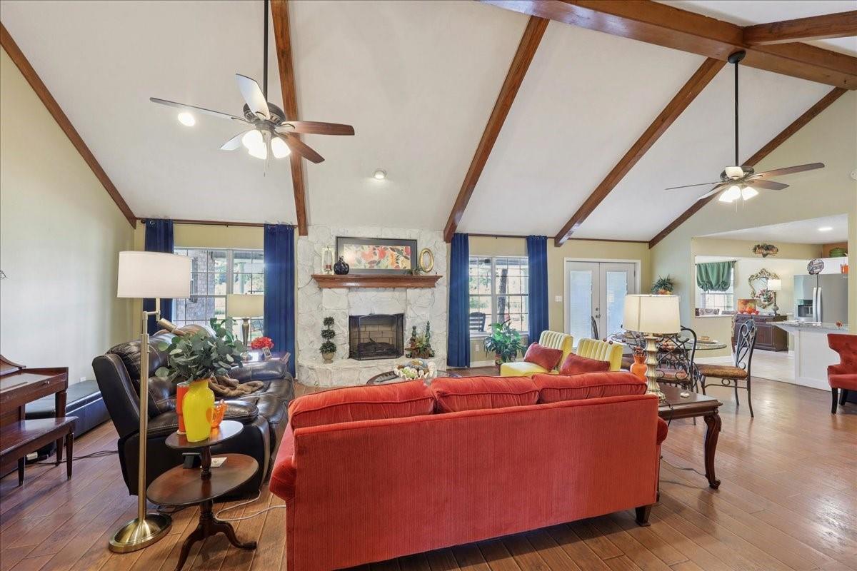 Beautifully updated home on a large lot with no direct rear neighbors in Boykin! Oversized living room with gorgeous wood beams, laminate flooring, 2 ceiling fans and a gas log fireplace has french doors w/blinds leading out to the large covered patio! Open concept to the large kitchen featuring granite countertops, tile backsplash, smooth cooktop, painted cabinets w/ new hardware, double ovens, microwave, dishwasher, island w/built-in shelves and a pantry! Formal dining room can easily accommodate a table of 10. The primary suite is such a retreat with his & hers closets, double sinks, a soaking tub, separate shower w/bench and door leading to the covered patio. Hall bath also has a walk-in tiled shower w/a bench! Laundry room has a built-in office area and a door leading to the garage. Lots of extra parking with a driveway leading to the double gate and RV / boat cover. 12 x 20 storage building w/electricity. Gutters w/leaf guard!