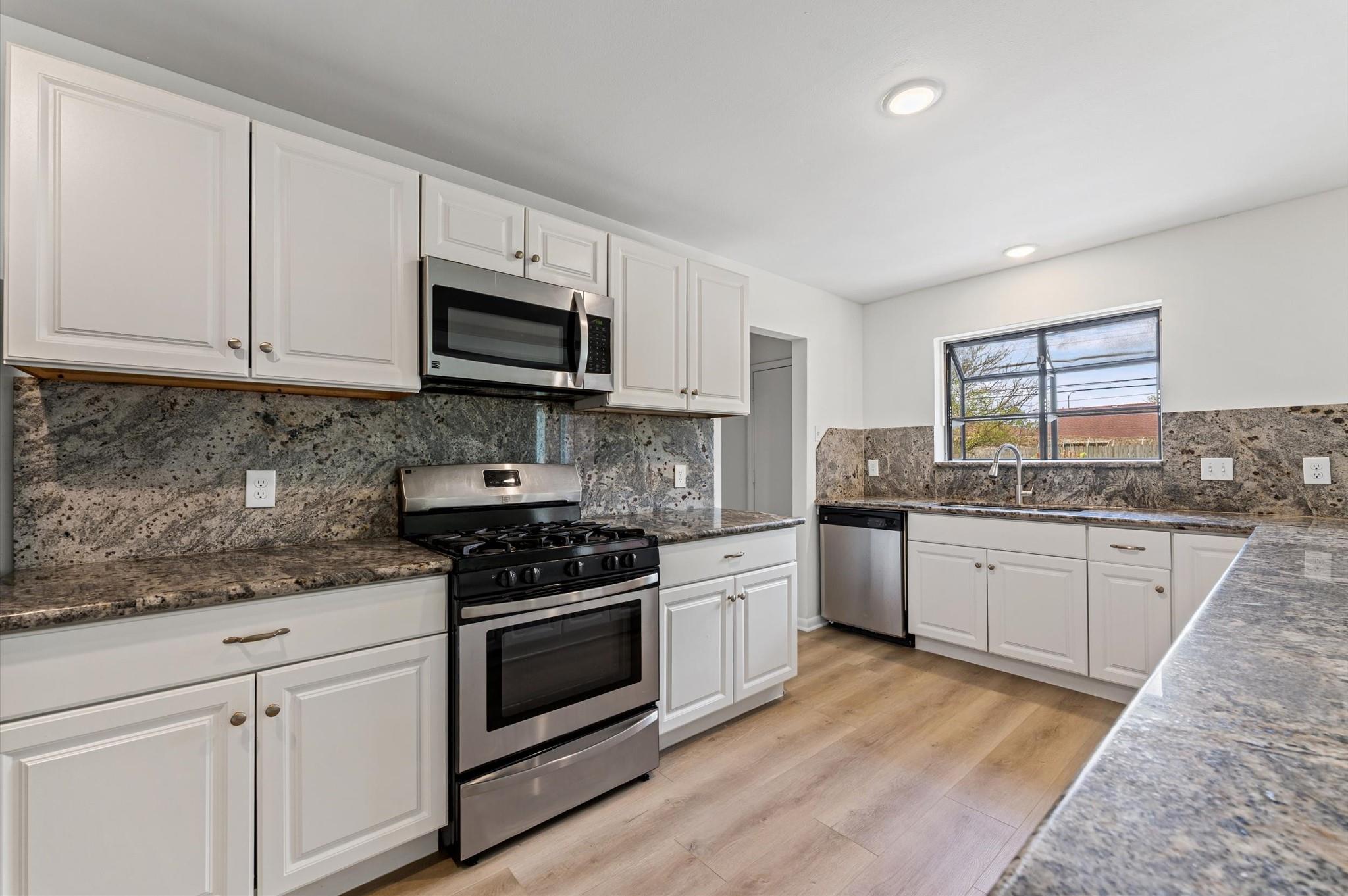 Recently updated 3-4 bedroom home has been freshly painted and has new flooring through out. The remodeled open concept kitchen flows in to the family room, from where a large patio door opens up to a huge concrete patio. kitchen and bathrooms feature granite countertops. A door has been added to the formal living areas, allowing flexibility of use. This area can be used for its original purpose or as a media room, office, or additional bedroom.
