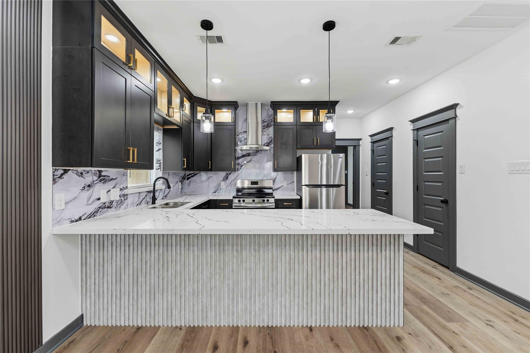 Stunning brand-new construction duplex where modern design meets true functionality. Each unit offers 3 bedrooms and 2.5 baths with a bright, open-concept layout and elevated finishes throughout. The kitchen is a showstopper with oversized quartz counters, sleek black soft-close cabinetry, striking designer stone backsplash, stainless appliance package, and pendant + recessed lighting. Wide-plank flooring, statement accent detailing, and clean contemporary trim work highlight the builder’s attention to detail. Bathrooms deliver a spa-like feel with quartz tops, matte black fixtures, oversized mirrors, and custom tile surrounds. Enjoy private outdoor space with a fenced yard plus a covered balcony/terrace—ideal for relaxing or entertaining. Convenient access to 610 and I-69 and just minutes from the future Lyndon B. Johnson Hospital campus—perfect for an owner-occupant or investor seeking a quality new-build duplex.