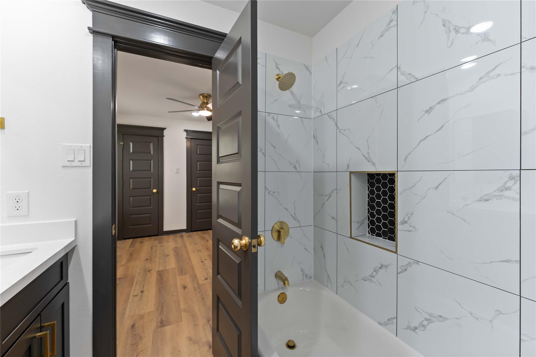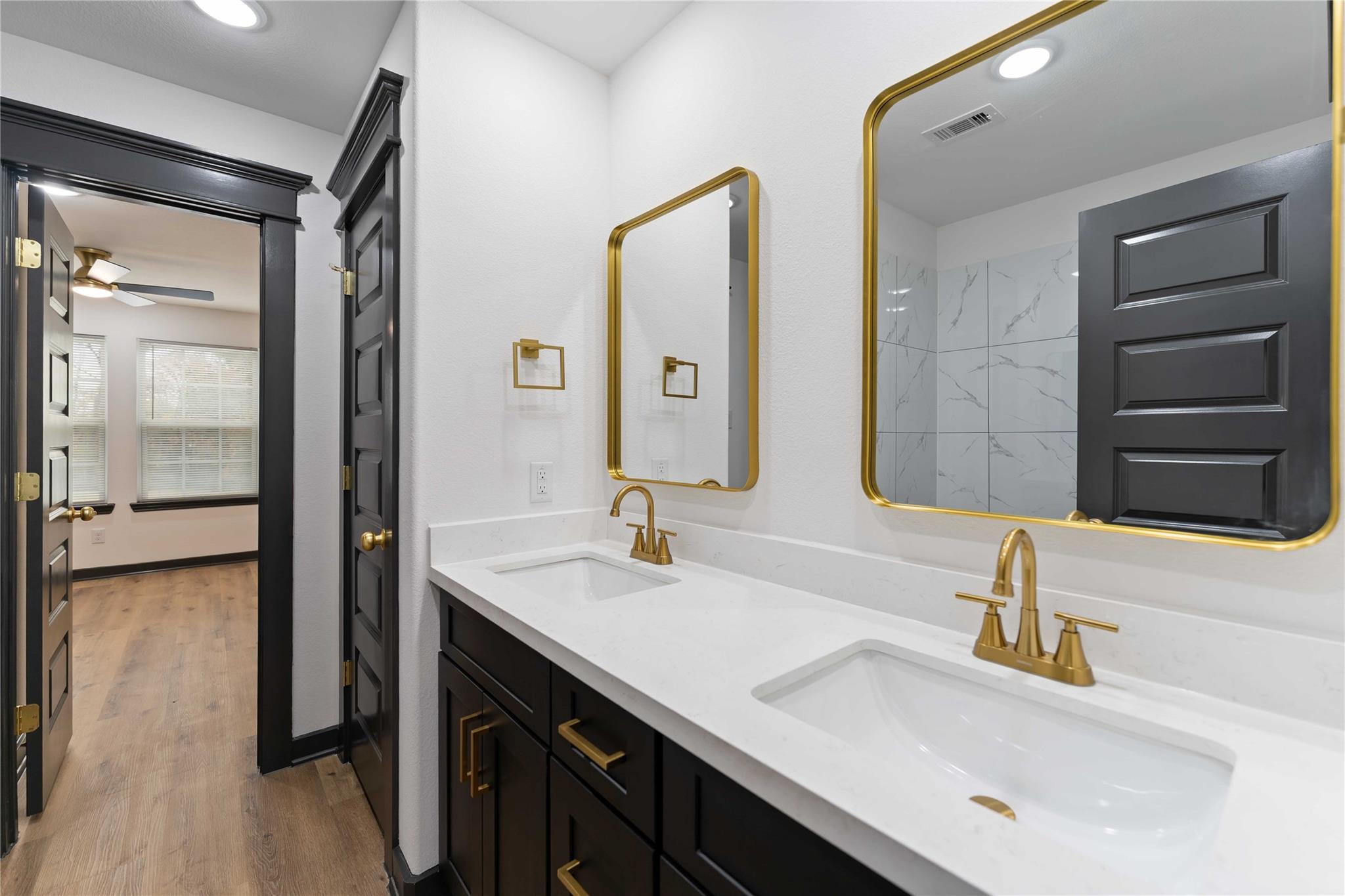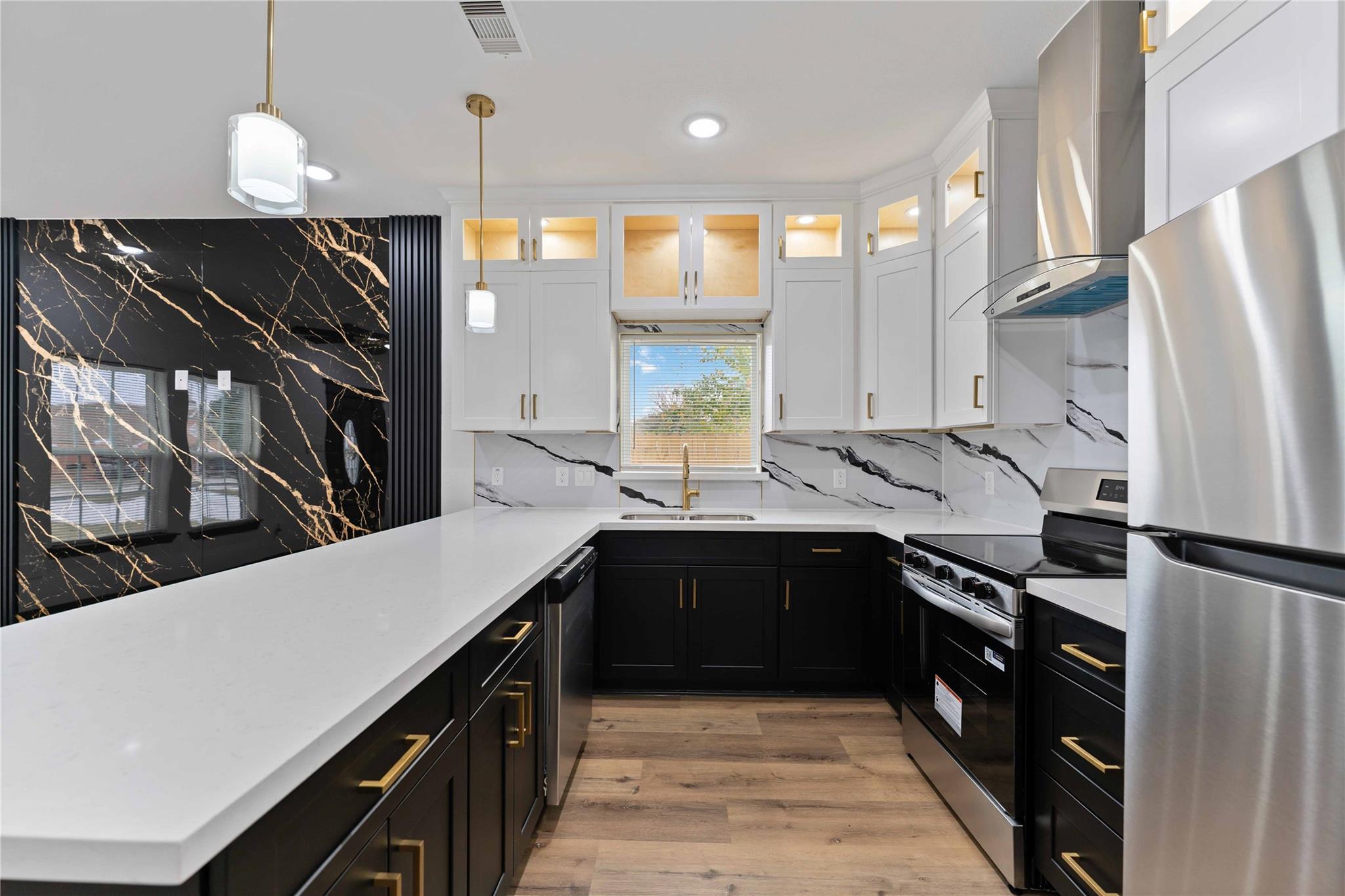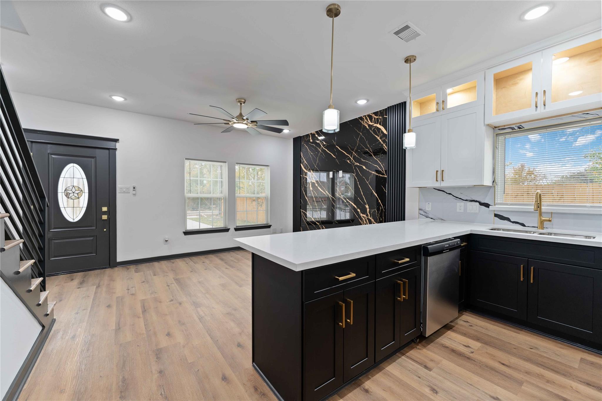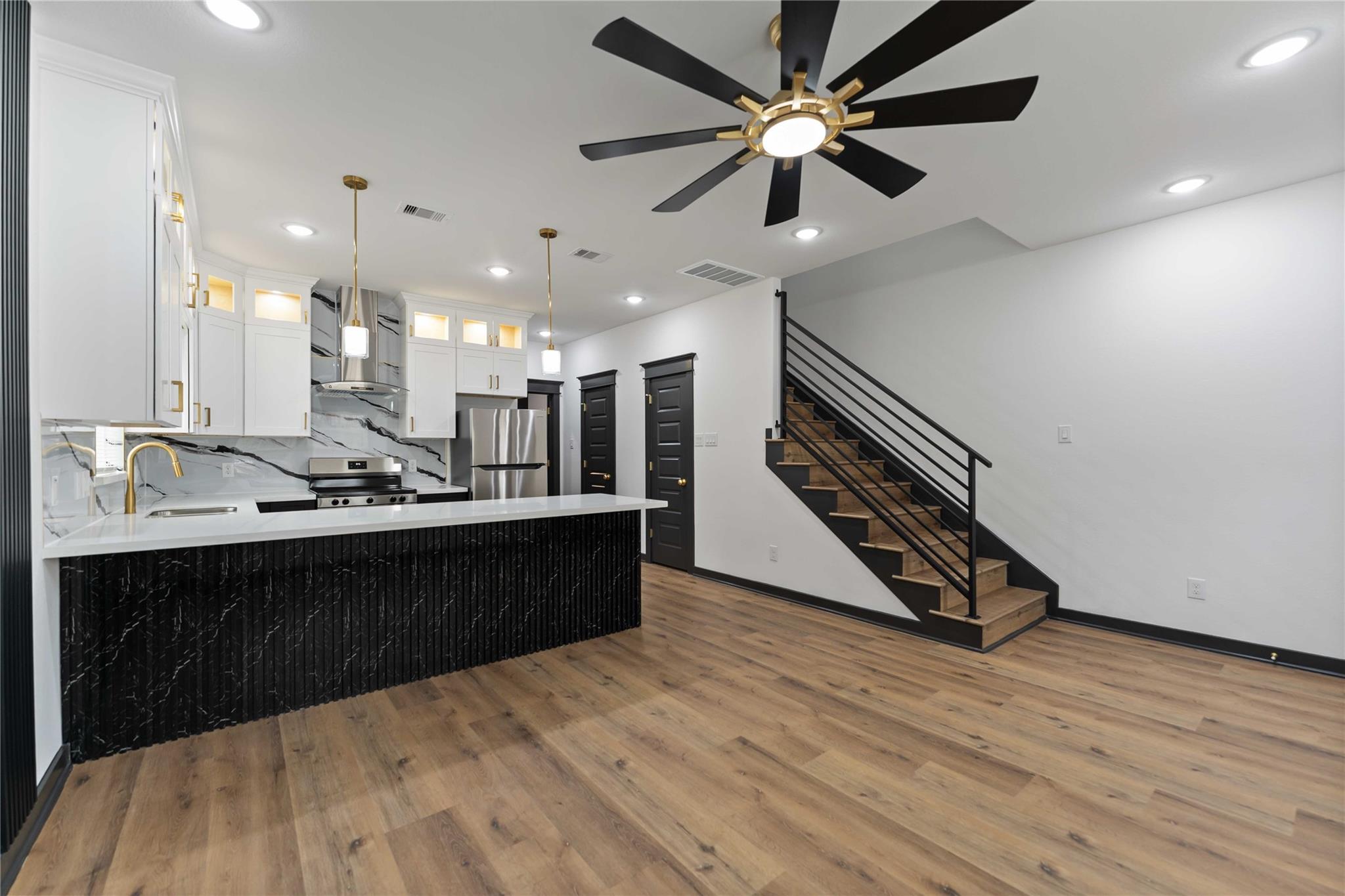 Stunning brand-new construction duplex in 77028 where modern design meets true functionality. Each unit offers 3 bedrooms and 2.5 baths with a bright, open-concept layout and elevated finishes throughout. The kitchen is a showstopper with oversized quartz counters, two-tone cabinetry with glass accent uppers, sleek gold hardware, statement pendant lighting, stainless steel appliances, and a striking designer backsplash. Wide-plank flooring, recessed lighting, stylish ceiling fans, and a modern railing staircase complete the contemporary feel. Bathrooms feature quartz vanities, upgraded mirrors, and custom tile surrounds, plus a dedicated laundry area and generous storage. Enjoy private outdoor space with a fenced yard and a covered balcony/terrace—ideal for relaxing or entertaining. Convenient access to 610 and I-69 and just minutes from the future Lyndon B. Johnson Hospital campus—perfect for homeowners or investors seeking quality new construction in Northeast Houston.