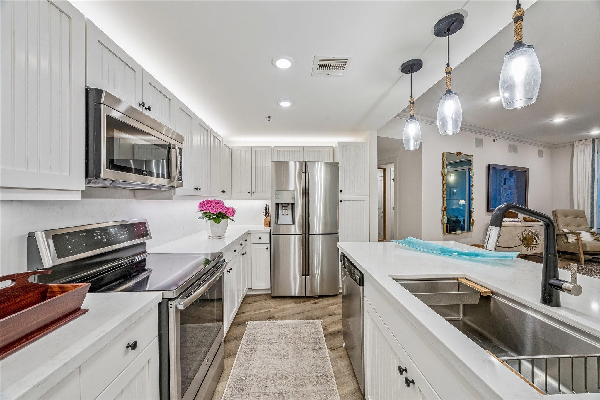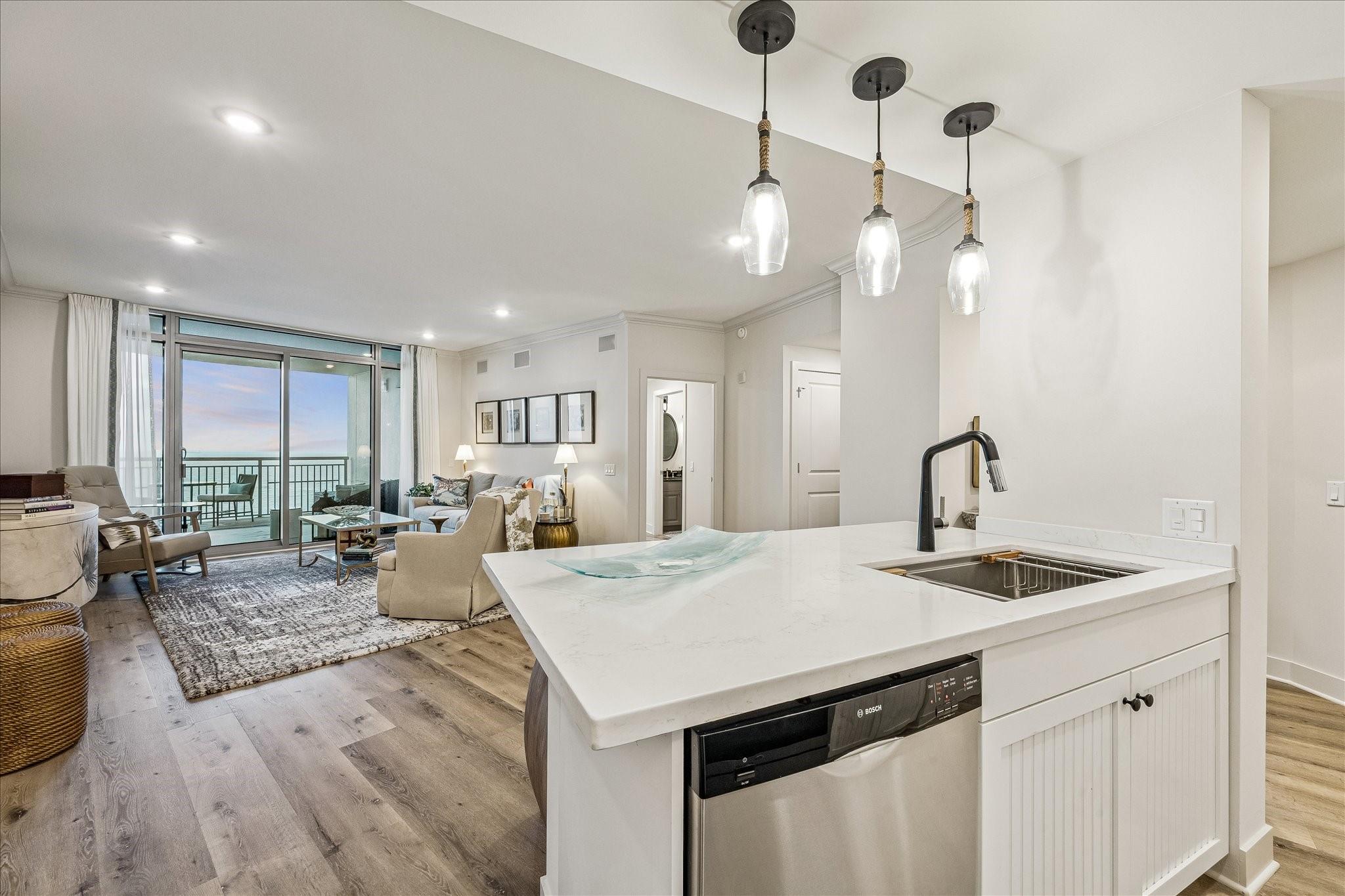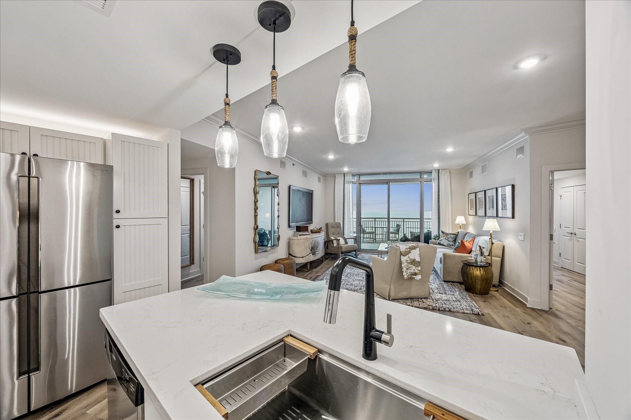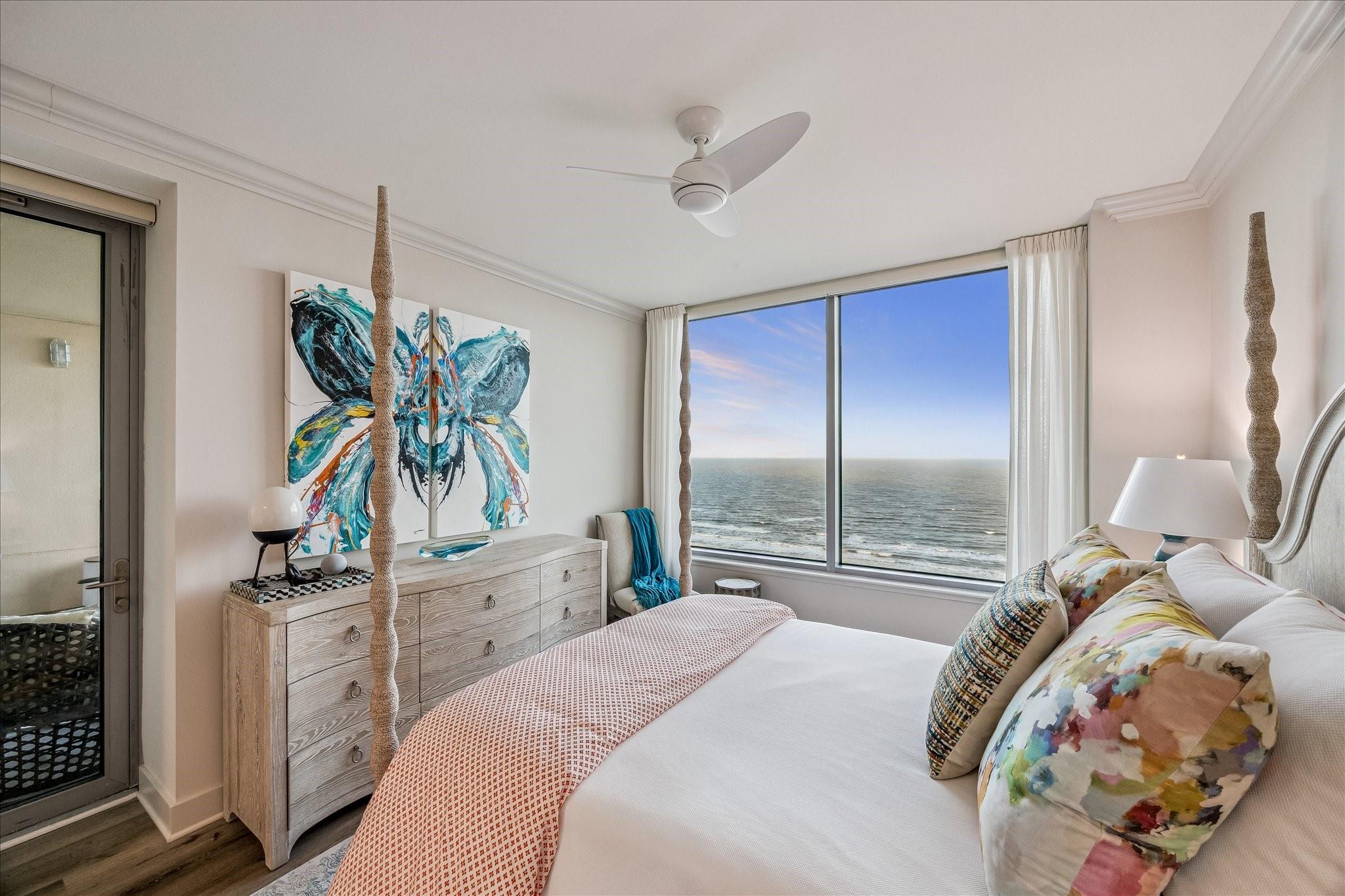 Step into refined coastal elegance with this professionally designed two-bedroom, two-and-a-half-bath residence at Palisade Palms on Galveston’s coveted East End. This exquisitely updated home showcases open-concept living, LED and recessed lighting with dimmers, designer fixtures, integrated audio, and a chef’s kitchen with Quartz countertops, custom backsplash, Bosch appliances, and Kohler sinks—all complemented by breathtaking ocean views. A Palacek chandelier highlights the dining area, while custom drapery, panels, and Hunter Douglas shades add a polished, designer finish. Located in one of Galveston’s most prestigious beachfront communities, residents enjoy world-class amenities including a resort-style pool, spa, fitness center, and 24-hour concierge-level services—all just moments from the beach, Seawall, The Strand, and fine dining, and shopping. This one is a show-stopper!