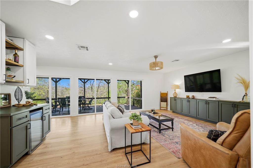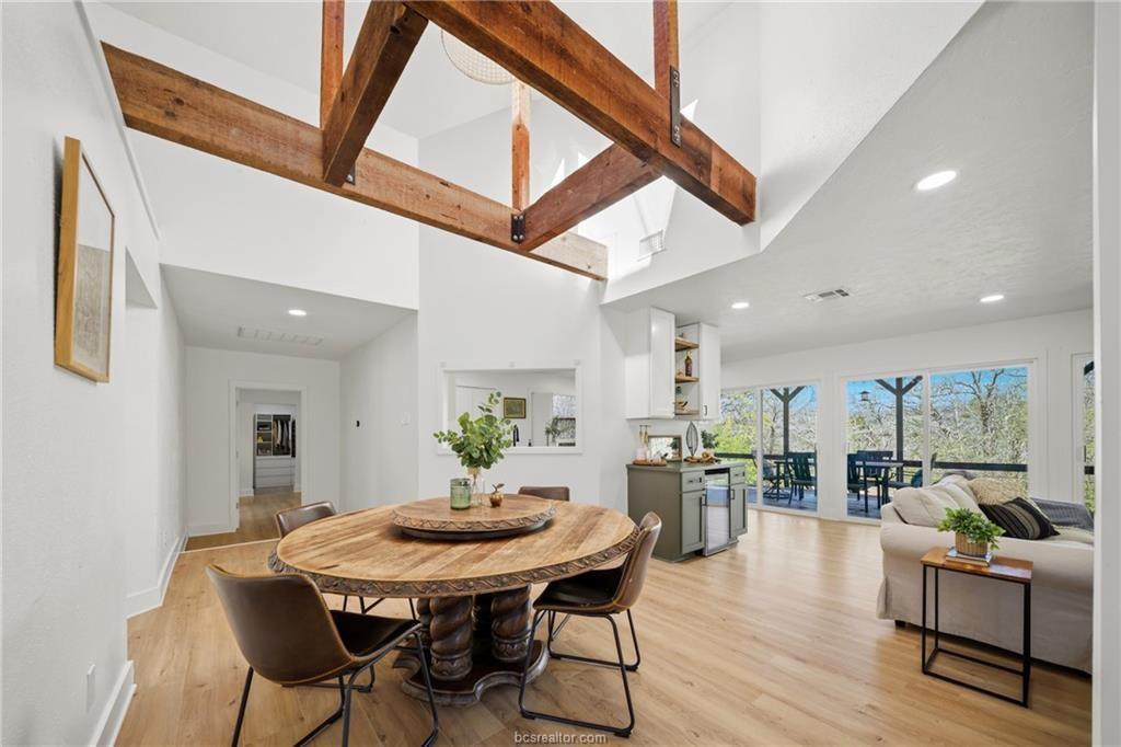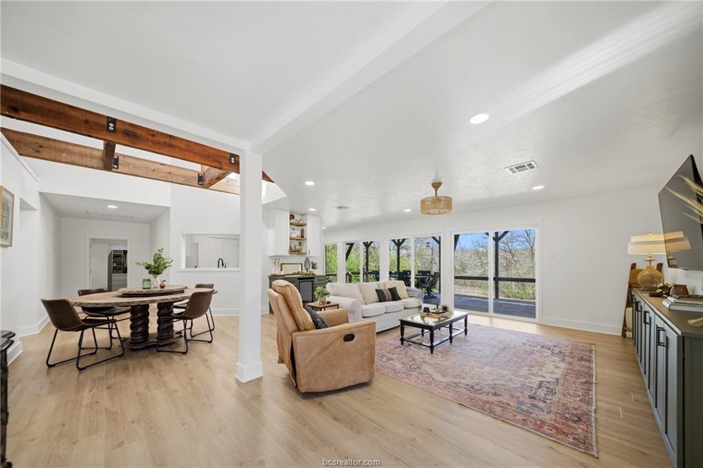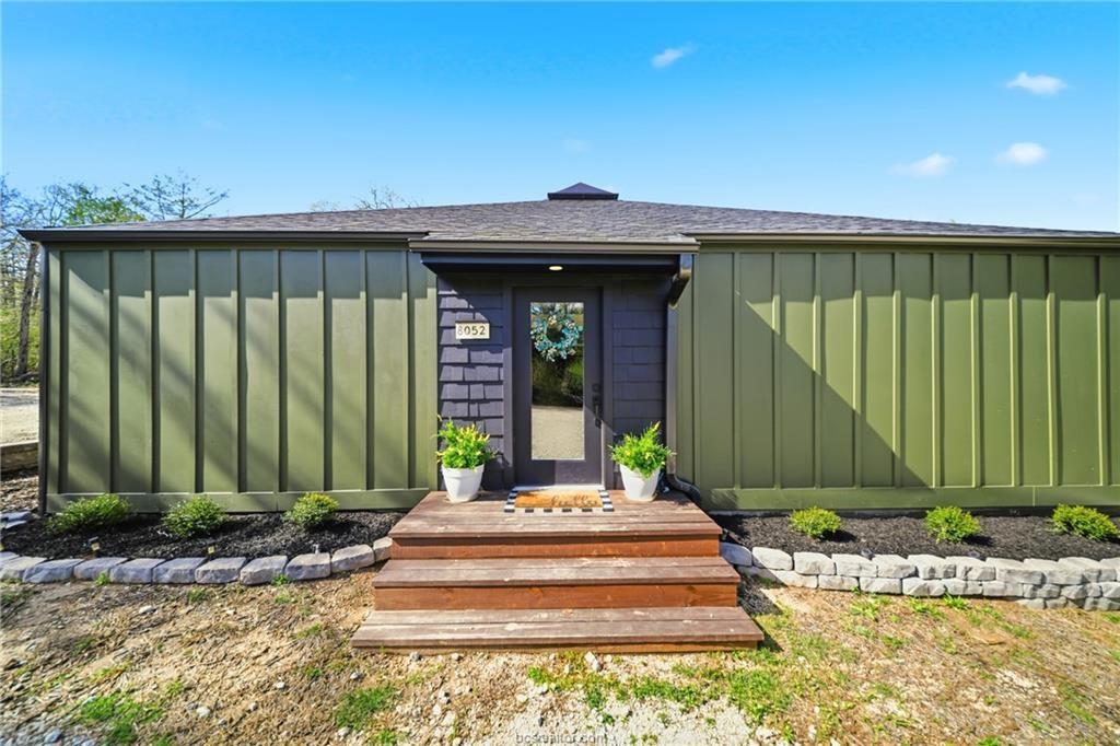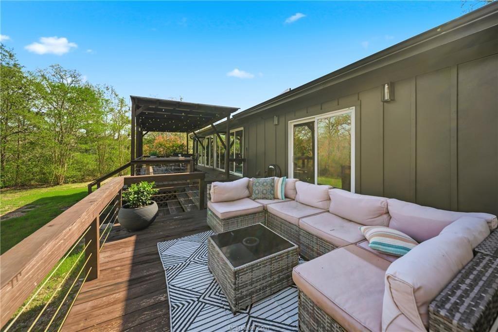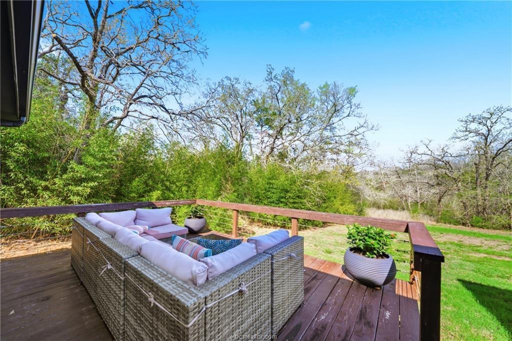 Nestled on 1.28 wooded acres with no HOA and minutes from Texas A&M, this renovated 3-bedroom, 2-bath home offers about 2,100 sq ft of comfortable living, including a spacious primary suite addition. Updates include new siding, vinyl windows and doors, updated flooring, and fresh interior/exterior paint for a bright, cohesive feel. The kitchen features custom cabinetry, an island, farmhouse sink, subway tile backsplash, and built-in storage. The primary suite includes a large bedroom, spa-style bath with soaking tub and walk-in shower, and an oversized closet. The guest bath is also remodeled. Energy efficiency is improved with spray foam insulation, averaging about $130/month utilities. Enjoy a covered patio and deck overlooking the wooded lot. Extras include a newer roof, skylight, Nest thermostat, refrigerator, 8-year-old HVAC, and septic system pumped in 2021—ideal as a retreat, game-day getaway, or investment.