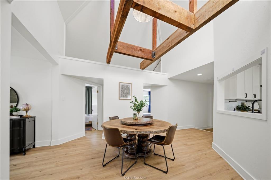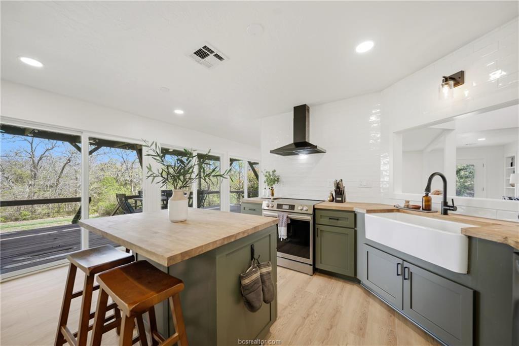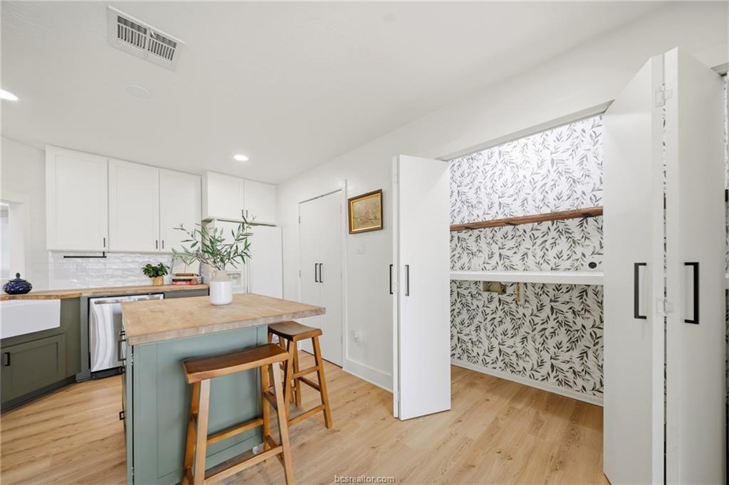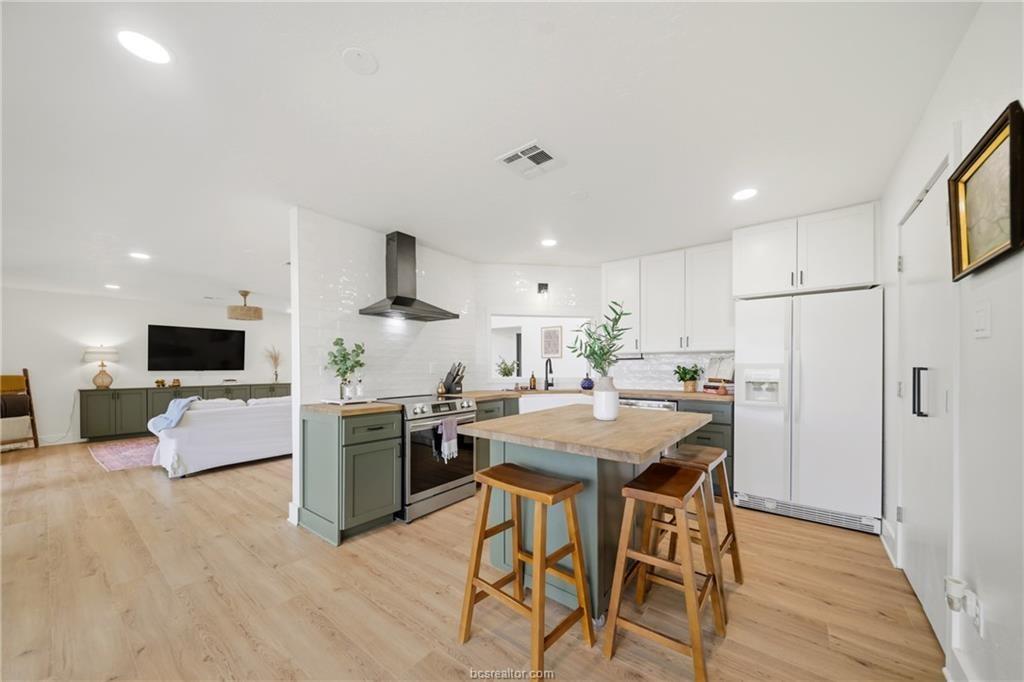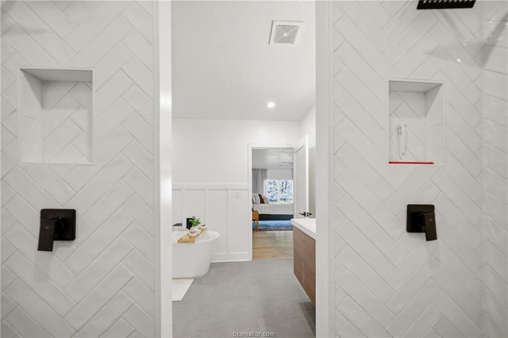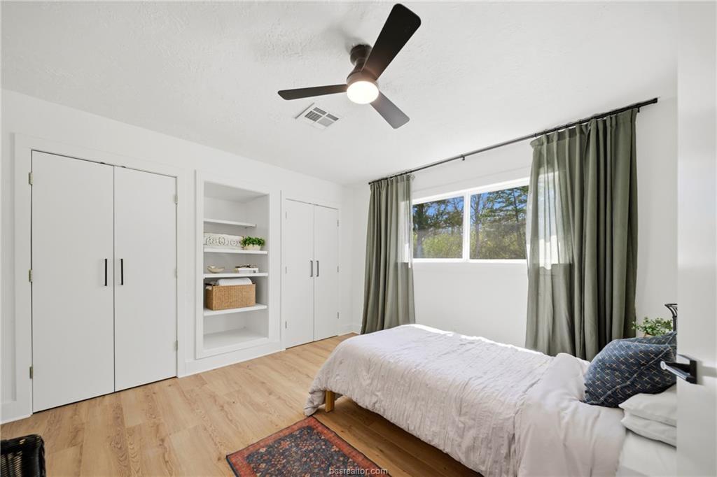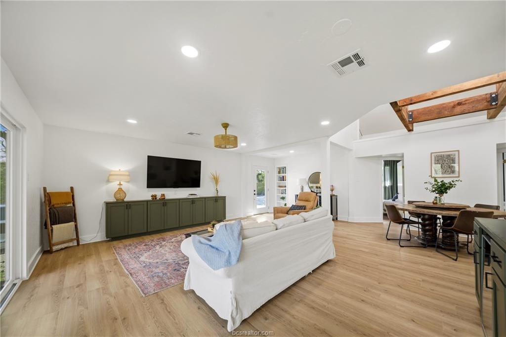 Nestled on 1.28 wooded acres with no HOA and minutes from Texas A&M, this renovated 3-bedroom, 2-bath home offers about 2,100 sq ft of comfortable living, including a spacious primary suite addition. Updates include new siding, vinyl windows and doors, updated flooring, and fresh interior/exterior paint for a bright, cohesive feel. The kitchen features custom cabinetry, an island, farmhouse sink, subway tile backsplash, and built-in storage. The primary suite includes a large bedroom, spa-style bath with soaking tub and walk-in shower, and an oversized closet. The guest bath is also remodeled. Energy efficiency is improved with spray foam insulation, averaging about $130/month utilities. Enjoy a covered patio and deck overlooking the wooded lot. Extras include a newer roof, skylight, Nest thermostat, refrigerator, 8-year-old HVAC, and septic system pumped in 2021—ideal as a retreat, game-day getaway, or investment.
