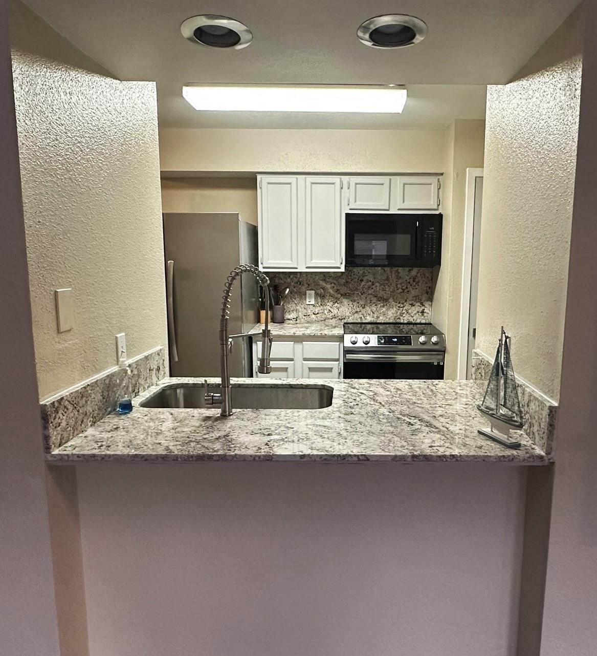 Newly Renovated 1 bedroom / 1 bathroom top floor condominium in the Texas Medical Center. Beautiful and airy, with vaulted ceilings, this unit features newly installed granite countertops in the kitchen, a newly installed granite slab backsplash, a newly installed granite slab fireplace (functional), and updated with new fixtures throughout the unit. The bathroom has been fully renovated with a new tub and tiled walls, a vanity granite countertop, and new fixtures. There is a very spacious living room attached to a balcony patio that overlooks the pool. The unit comes with brand new appliances and a brand new water heater. The reserved parking spot for this unit is in the most coveted private lot in the complex, comprised of only 16 spots. This is the most secure parking lot, next to the mailbox bank, and steps from the front door. The gated community also has security detail. LOCATION, LOCATION, LOCATION! Walking distance to MD ANDERSON RESEARCH PARK and the UT DENTAL SCHOOL.