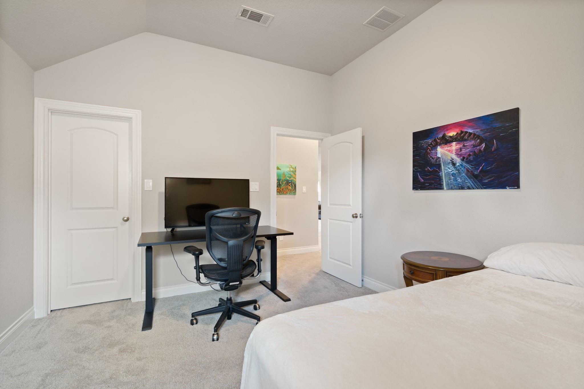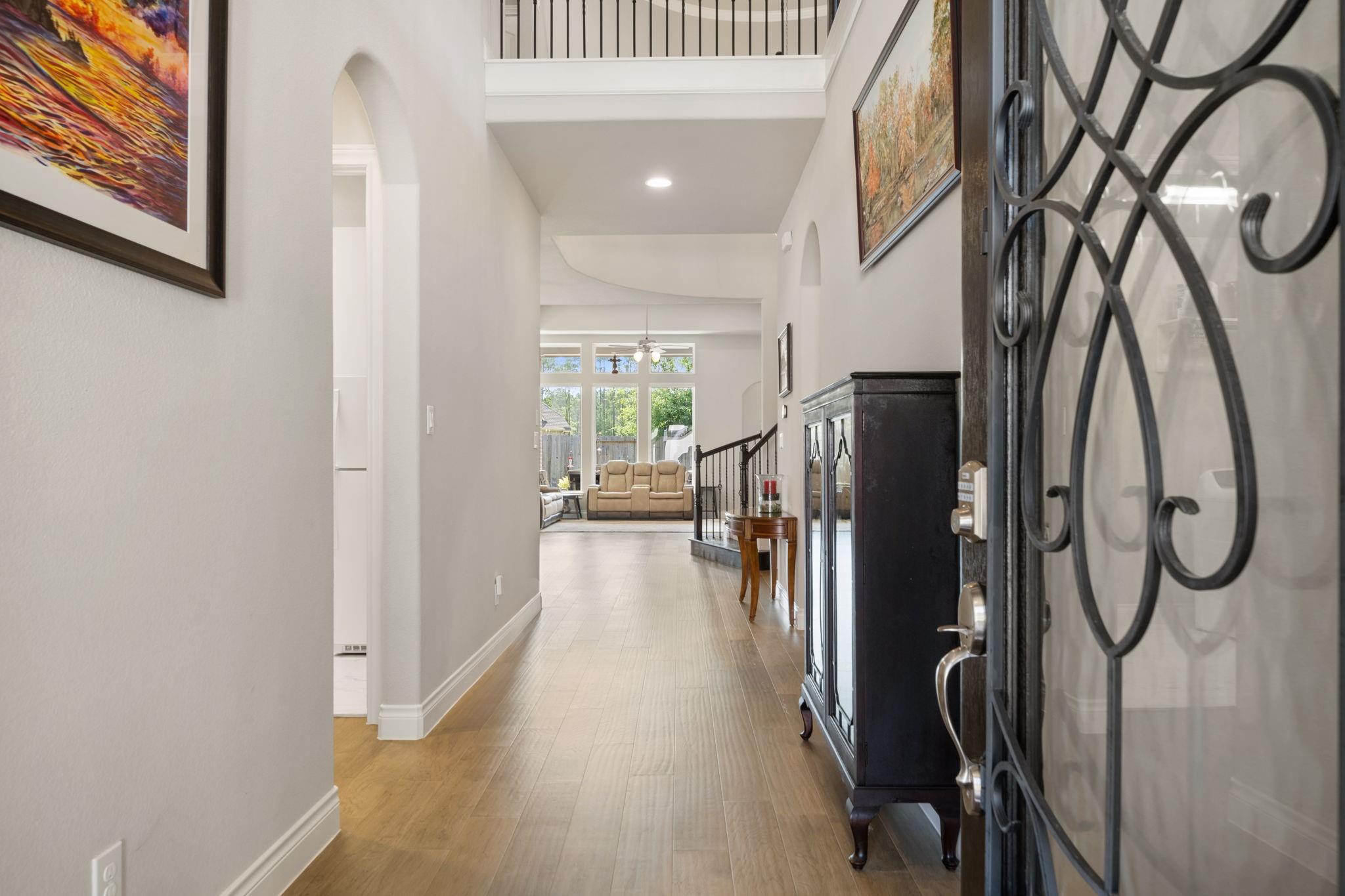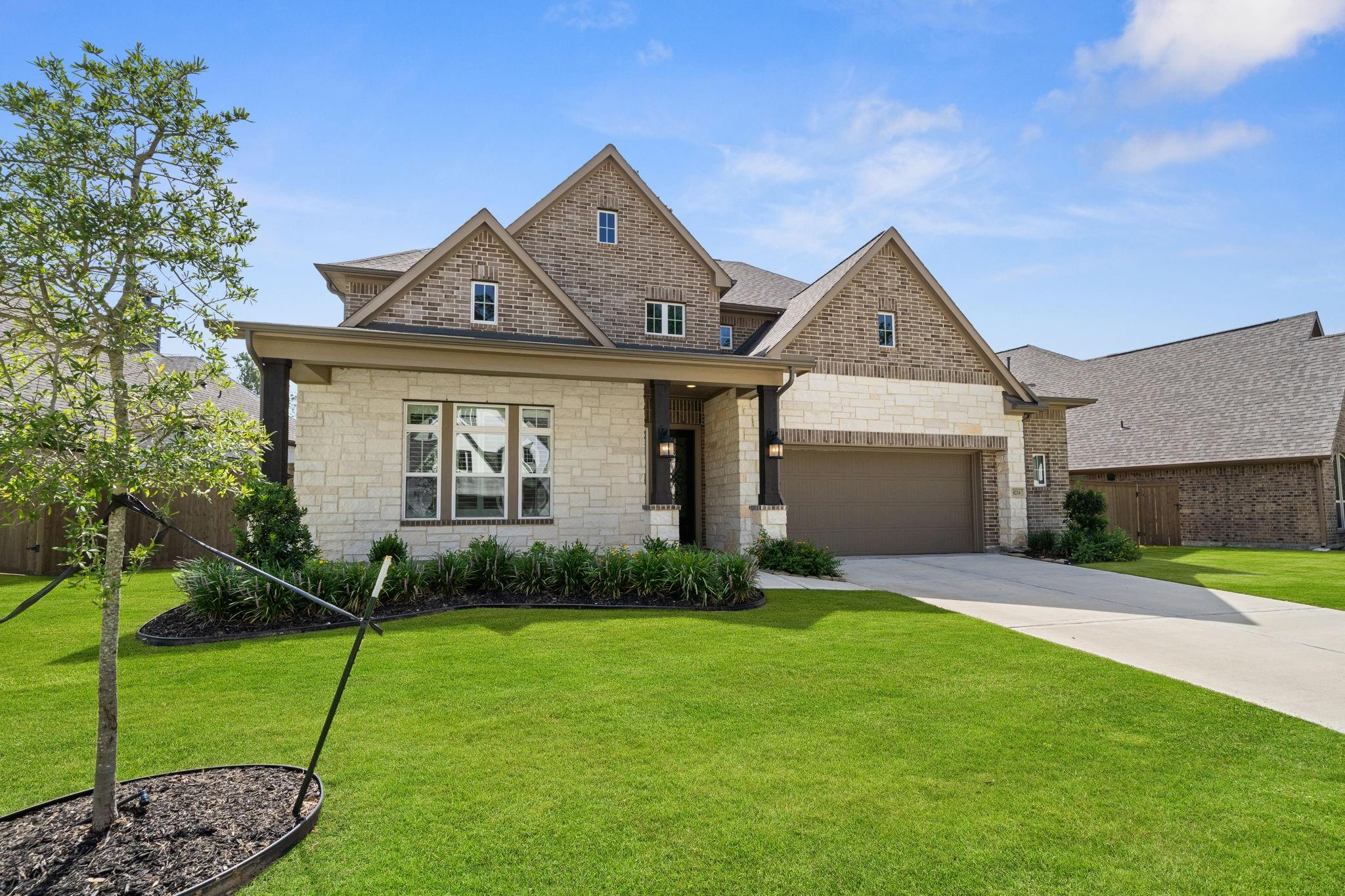 Step into this beautifully designed 2-story home, where a dramatic 21-foot entry and striking rotunda ceiling over the staircase create an unforgettable first impression. The open-concept kitchen is both stylish and functional, with upgraded can lighting, built-in stainless steel KitchenAid appliances, a Frigidaire refrigerator, and a curved island that flows seamlessly into the spacious family room. Rich RevWood flooring and custom shades throughout the main living area add warmth, durability, and everyday elegance. A light-filled front bedroom offers the perfect flexibility for a home office or guest space, while the private first-floor primary suite is tucked quietly at the back of the home for added comfort and convenience. Upstairs, you will find a generous game room, multiple secondary bedrooms, a full and secondary bathroom—ideal for family, guests, or multi-generational living. Unwind outdoors under the covered patio and enjoy the comfort of your private backyard oasis.
