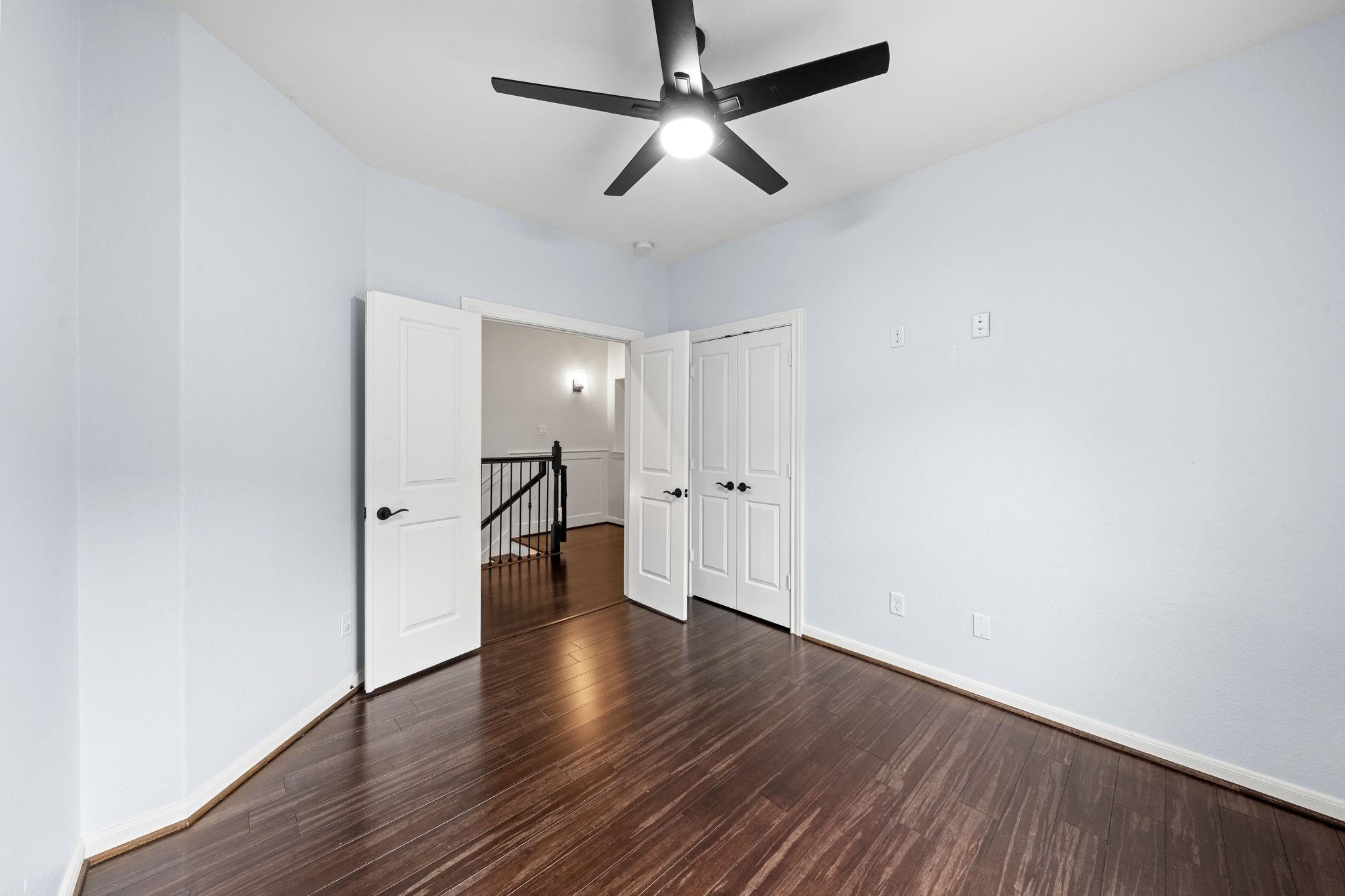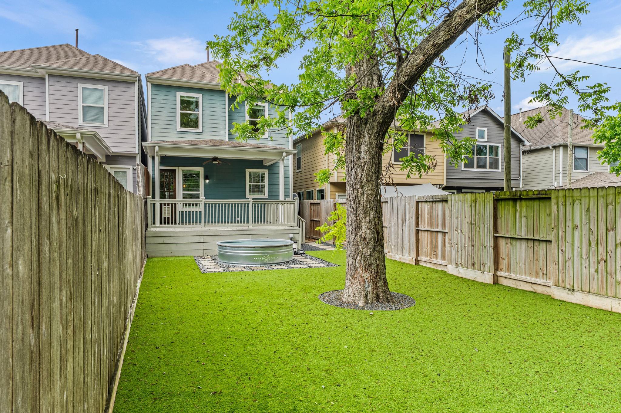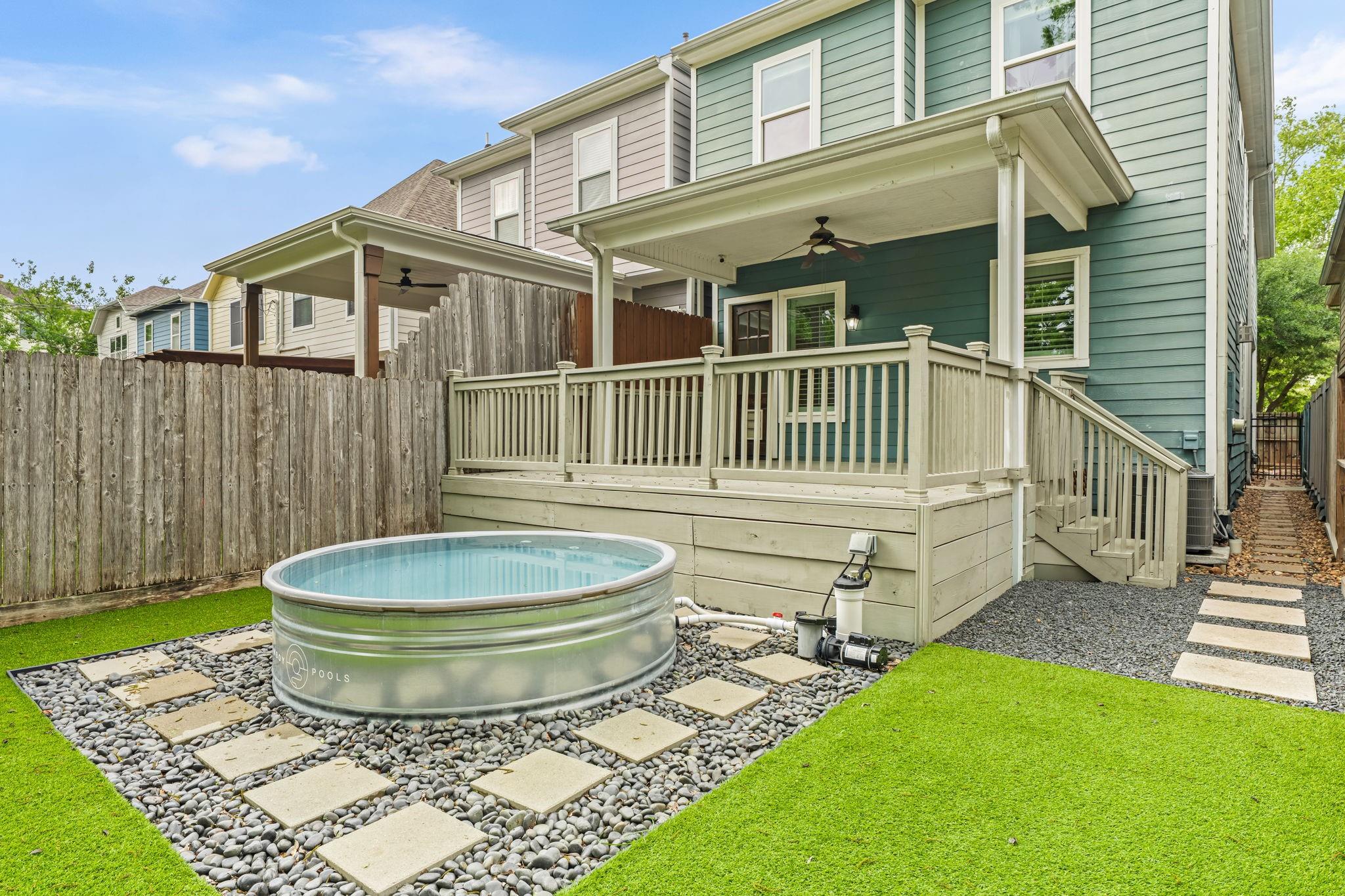 With an exceptional backyard and expansive covered deck, this Heights home offers an outdoor setting that is truly hard to find. Inside, an open floor plan pairs with timeless details including wood flooring (no carpet), plantation shutters, crown molding and wainscoting, and high ceilings. The living room centers around a gas log fireplace, while the island kitchen features granite countertops, breakfast bar, walk-in pantry, wine refrigerator, and ample cabinetry. Upstairs, the primary suite offers a private balcony, generous double closets, and a spa-like bath with dual vanities, soaking tub, and oversized shower. Two secondary bedrooms plus a flexible bonus room allow for a fourth bedroom, office, or gym. The turfed backyard features a cowboy pool and an extended, covered deck for low-maintenance outdoor living. Fully fenced with an automated gate, plus additional parking and epoxy-floored garage.