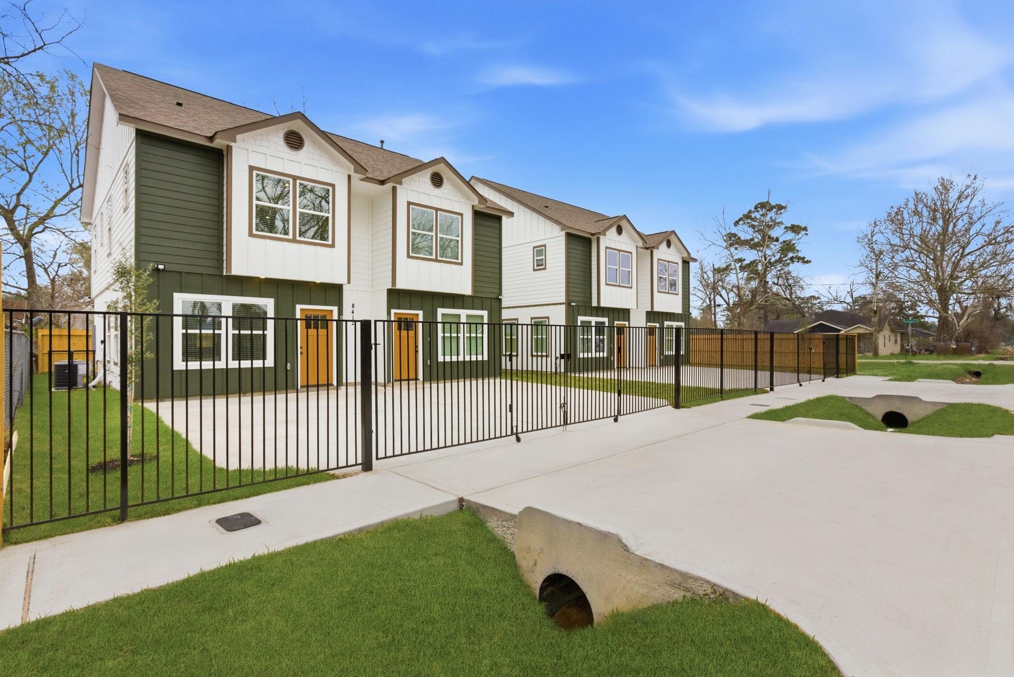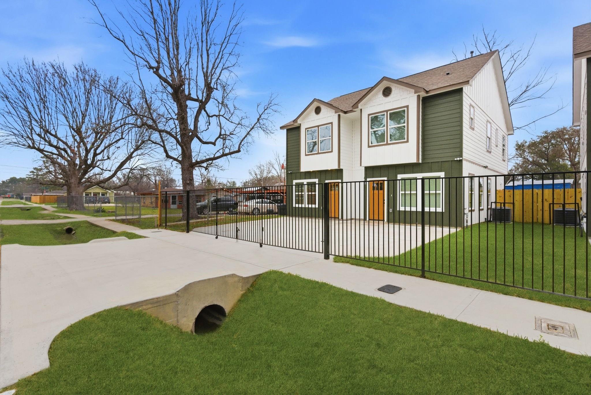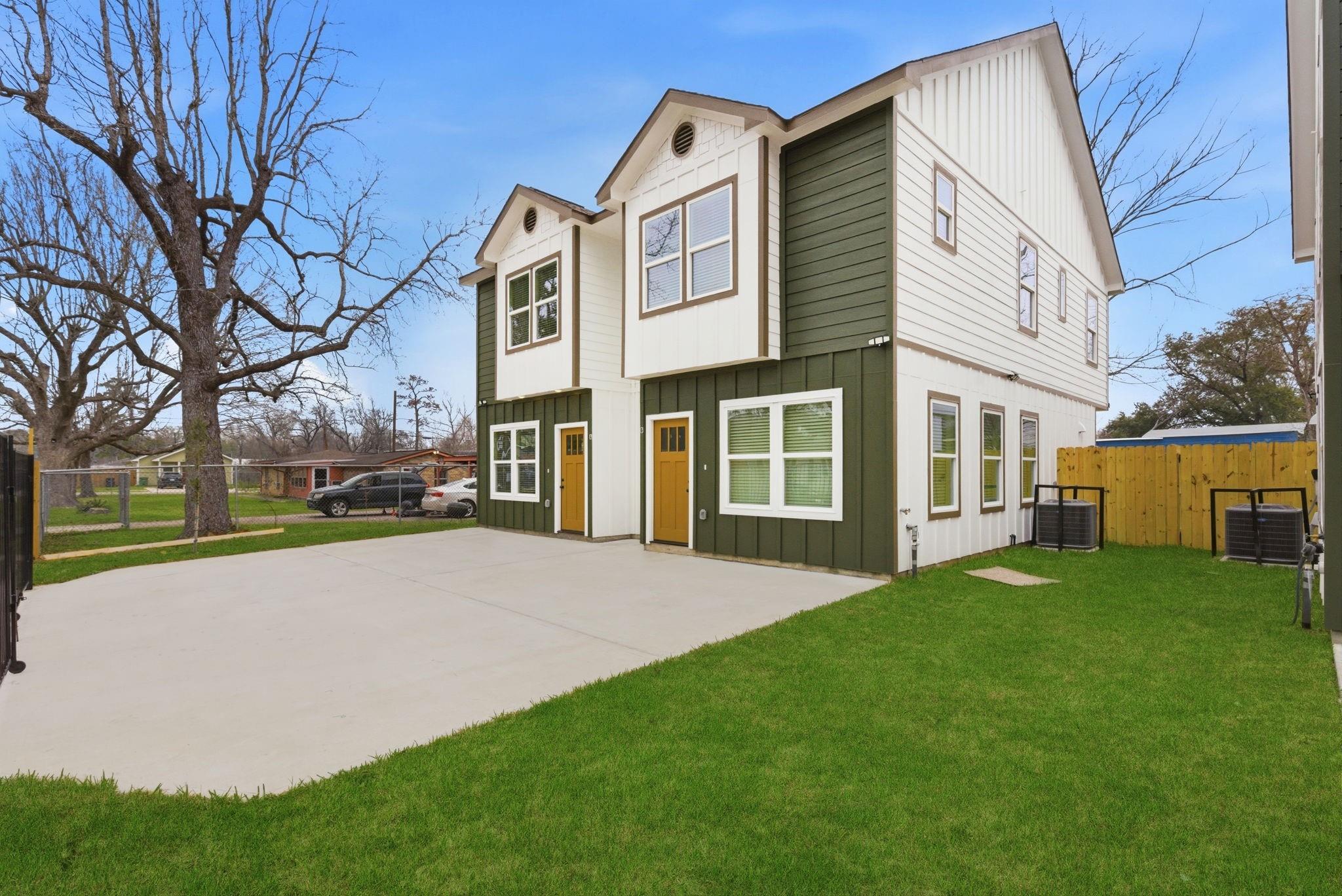 New 2026 duplex offering 2,432 sq ft with two identical 3-bed, 2.5-bath units. Each home features an open-concept living, dining, and kitchen area on the first floor, plus a downstairs utility room with gas and electric dryer connections. All bedrooms are upstairs. The primary suite includes a double-vanity bath, walk-in shower, and two closets. Secondary bedrooms share a Jack-and-Jill style bath with direct access from both rooms. Property includes a driveway gate and modern finishes throughout. Ideal for investors or buyers looking to live in one unit and rent the other. A great opportunity to own a brand-new, move-in-ready duplex in a growing area of Houston.