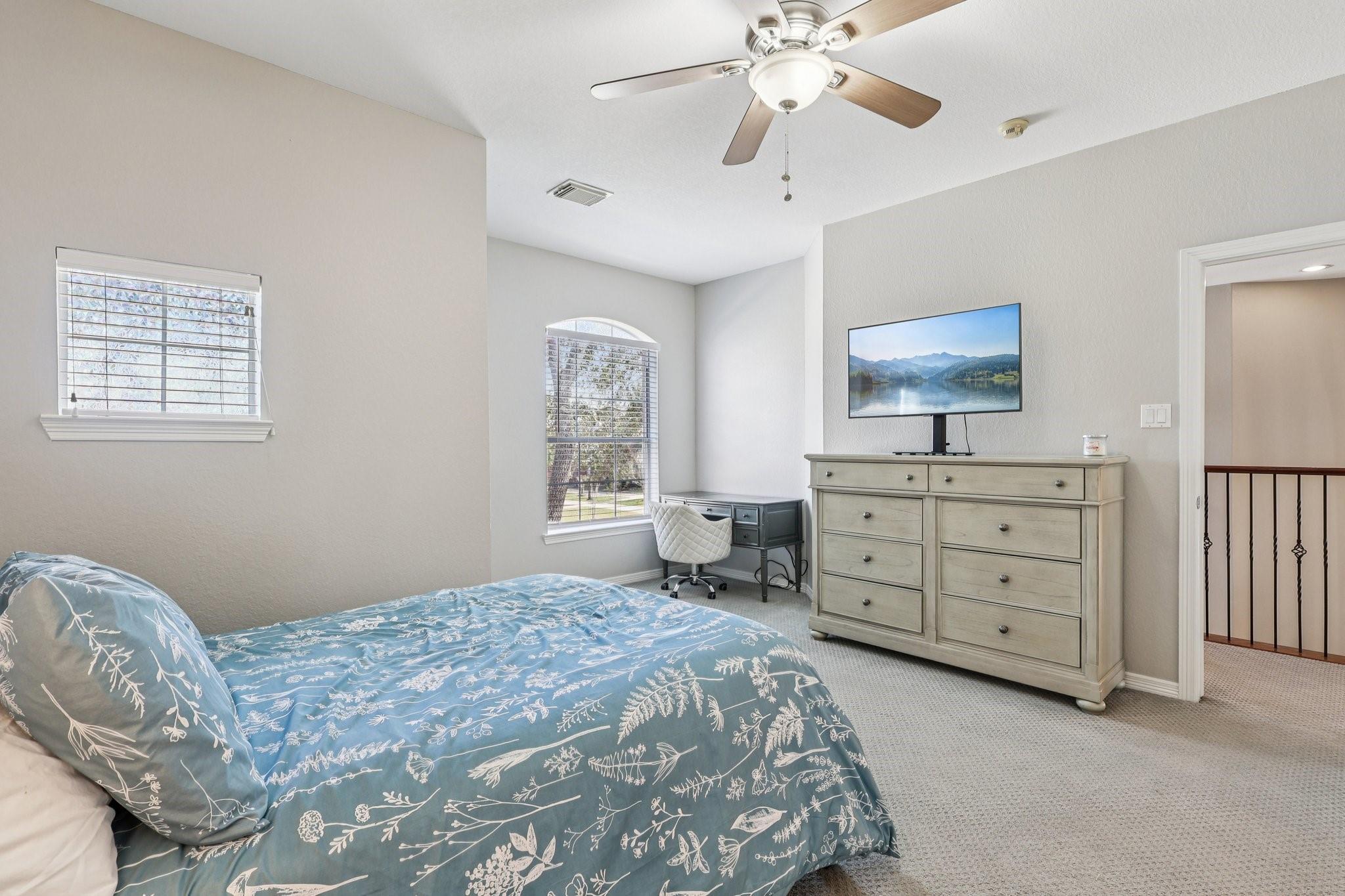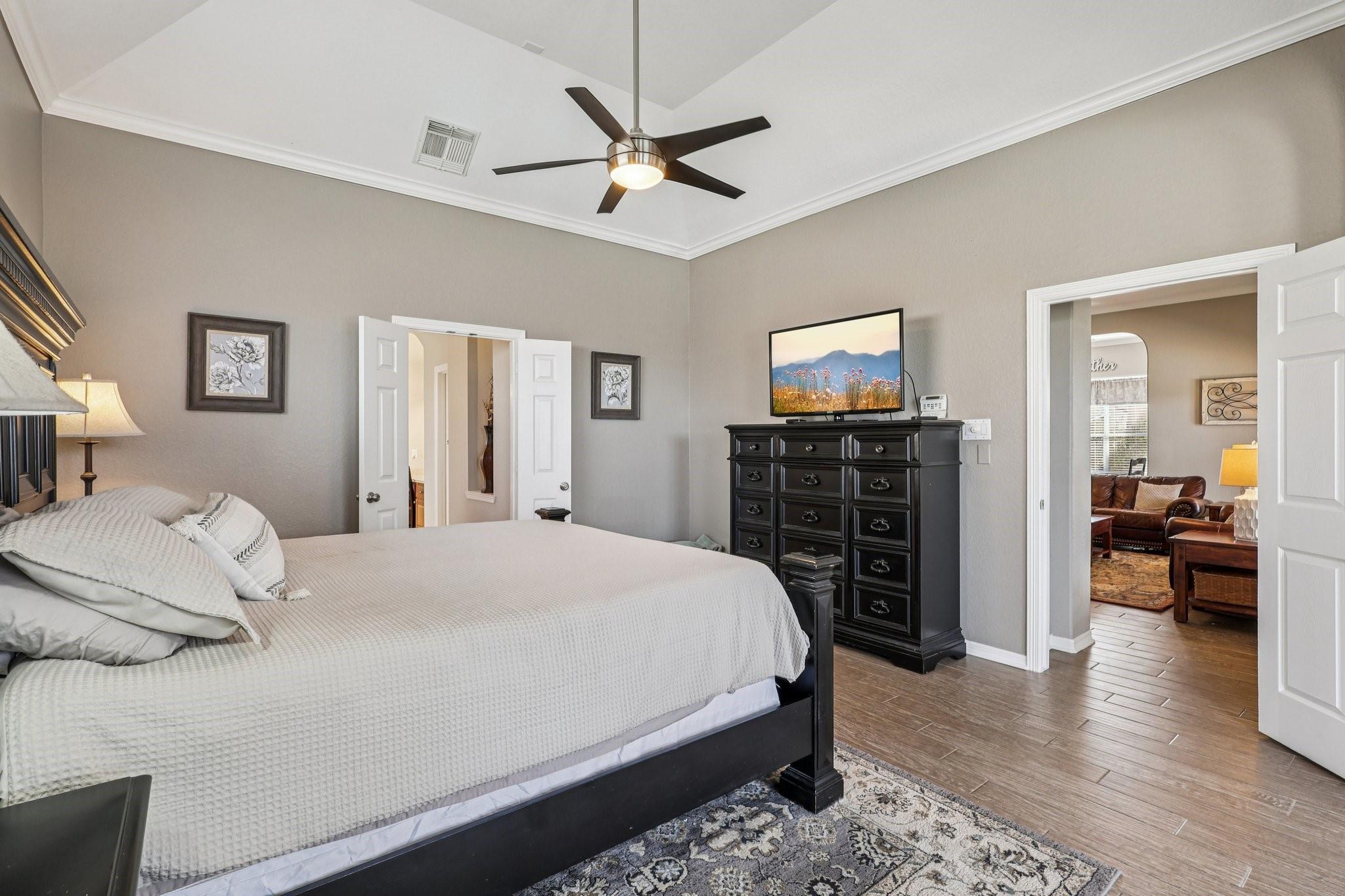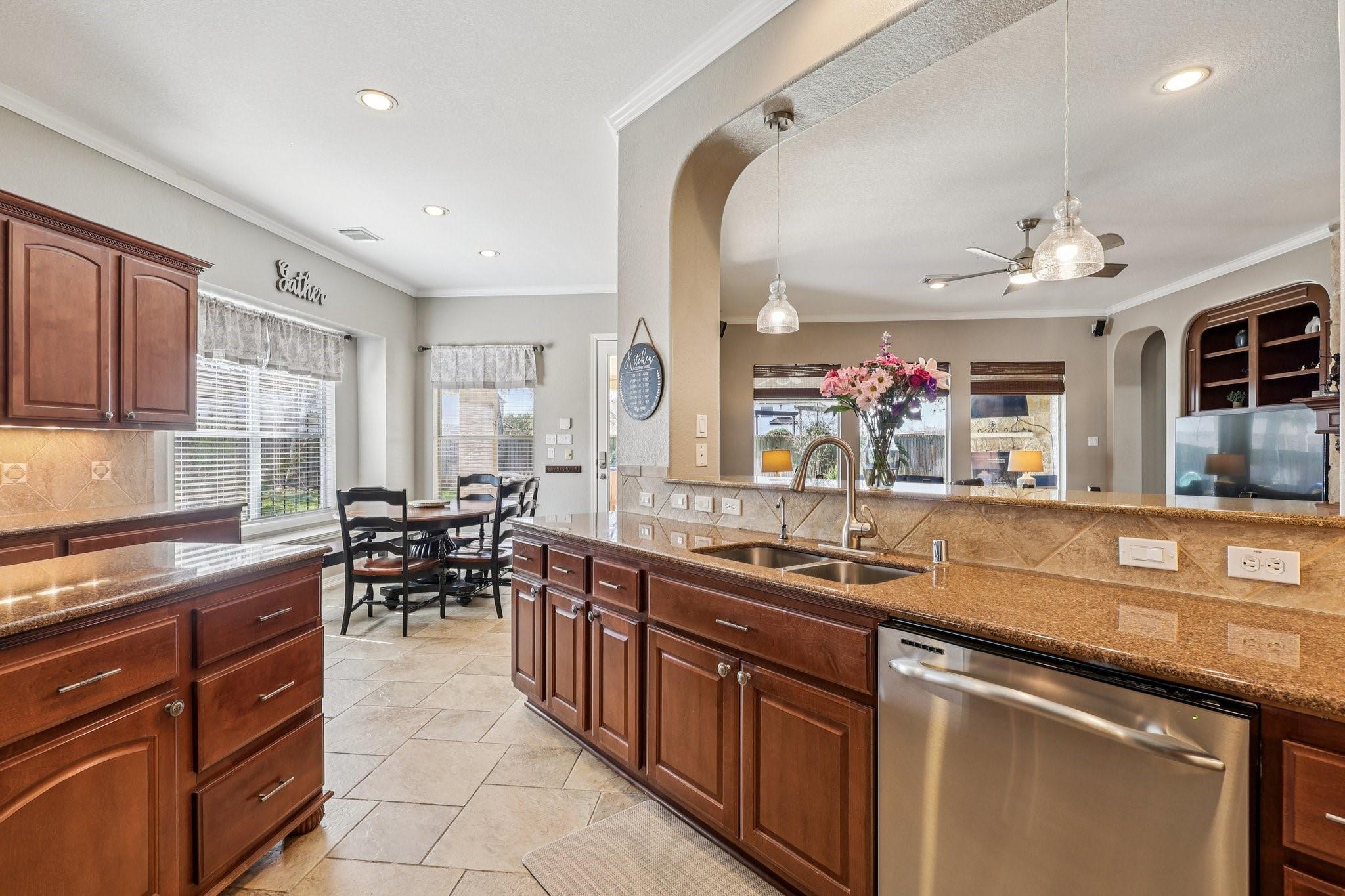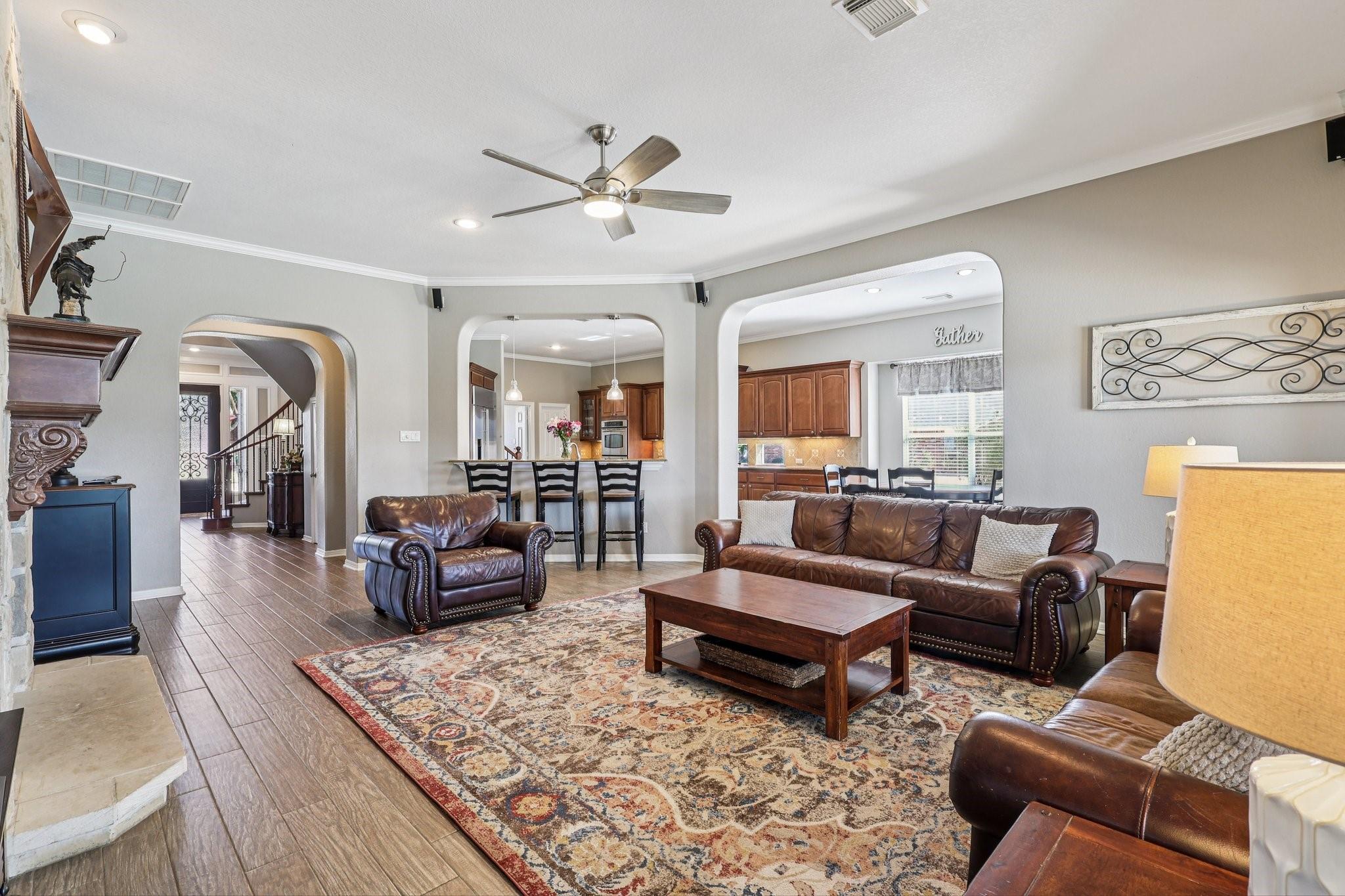 InteriorFireplace:2/Gas Connections,Gaslog FireplaceFloors:Carpet,TileCountertop:GraniteBathroom Description:Full Secondary Bathroom Down,Half Bath,Primary Bath: Separate Shower,Secondary Bath(s): Double Sinks,Secondary Bath(s): Tub/Shower Combo,Two Primary Baths,Vanity AreaBedroom Desc:3 Bedrooms Up,Primary Bed - 1st FloorKitchen Desc:Breakfast Bar,Island w/o Cooktop,Kitchen open to Family Room,PantryRoom Description:1 Living Area,Breakfast Room,Formal Dining,Gameroom Up,Home Office/Study,Living Area - 1st Floor,Media,Utility Room in HouseHeating:Central GasCooling:Central ElectricConnections:Gas Dryer Connections,Washer ConnectionsDishwasher:YesDisposal:YesCompactor:NoMicrowave:YesRange:Gas RangeOven:Gas OvenIce Maker:NoEnergy Feature:Attic Fan,Attic Vents,Ceiling FansInterior:2 Staircases,Crown Molding,High Ceiling,Refrigerator Included,Split Level