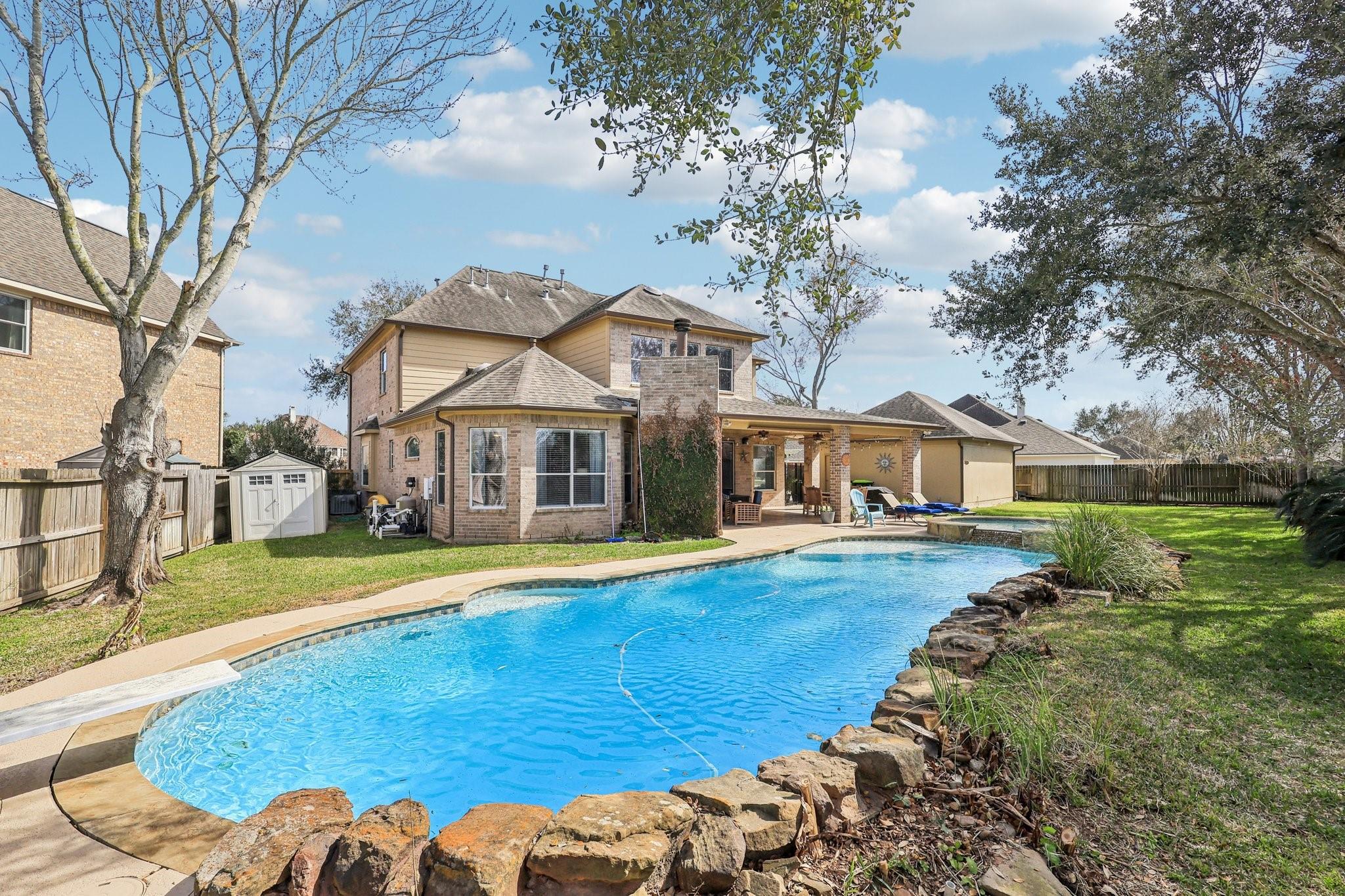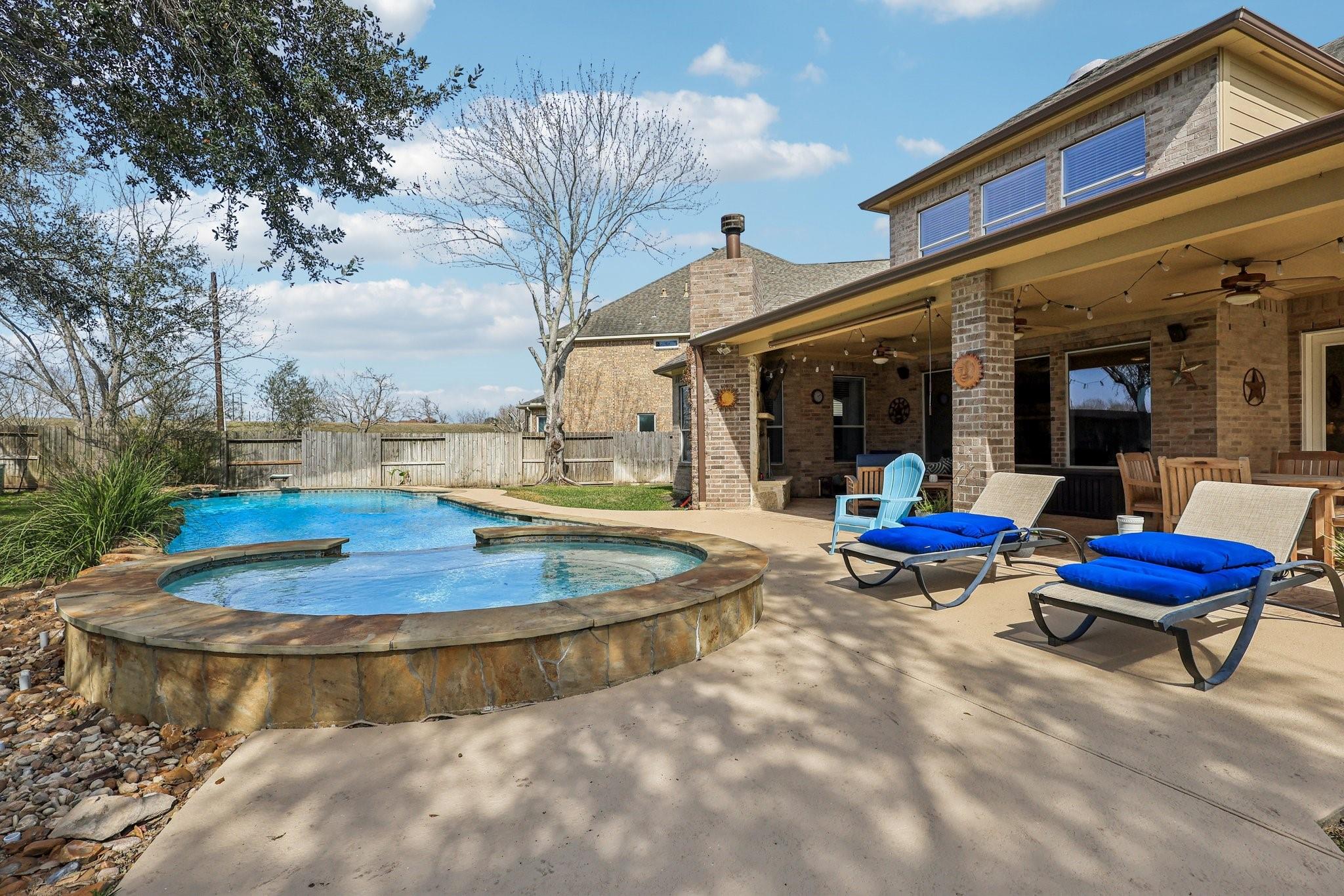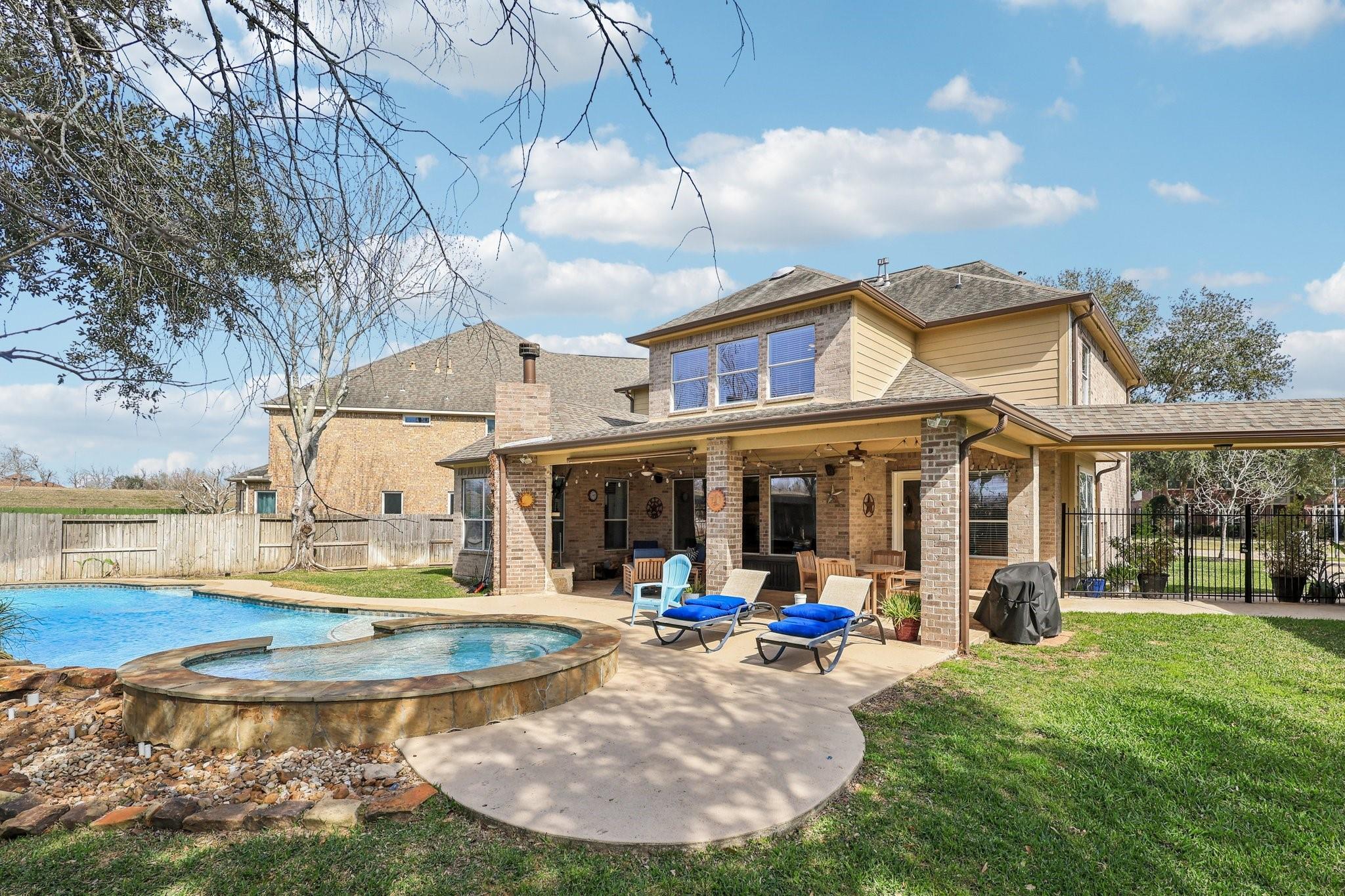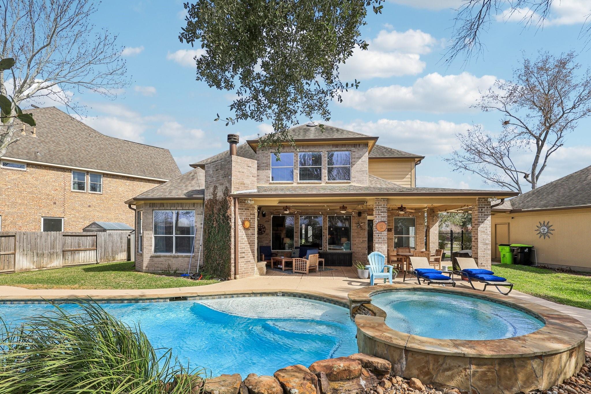 This Sienna home is turn key ready. Through the 8 foot iron door is a grand entrance with high ceiling and curved staircase with an office and formal dining on the other. Downstairs, wood-look tile floors lead you to the living room with fireplace open to the chefs kitchen. Here you have ample cabinet and counter space, and a built-in 48 inch commercial fridge that stays. Cross the living to a generous primary suite with attached seating area and a primary bath that includes oversized shower and tub along with THREE vanities and his and hers closets. 4 bedrooms upstairs, an additional desk office area, and media room. Three car garage with new doors, 500 square feet of covered patio, and a beautiful pool and spa complete with diving board are outside, all on a .39 acre lot! Recent update include HVAC, water heater, and more. Attend highly sought-after schools like Sienna Crossing and Ridge Point. Amenities include multiple parks, pools, tennis and pickle ball courts, and a golf course!