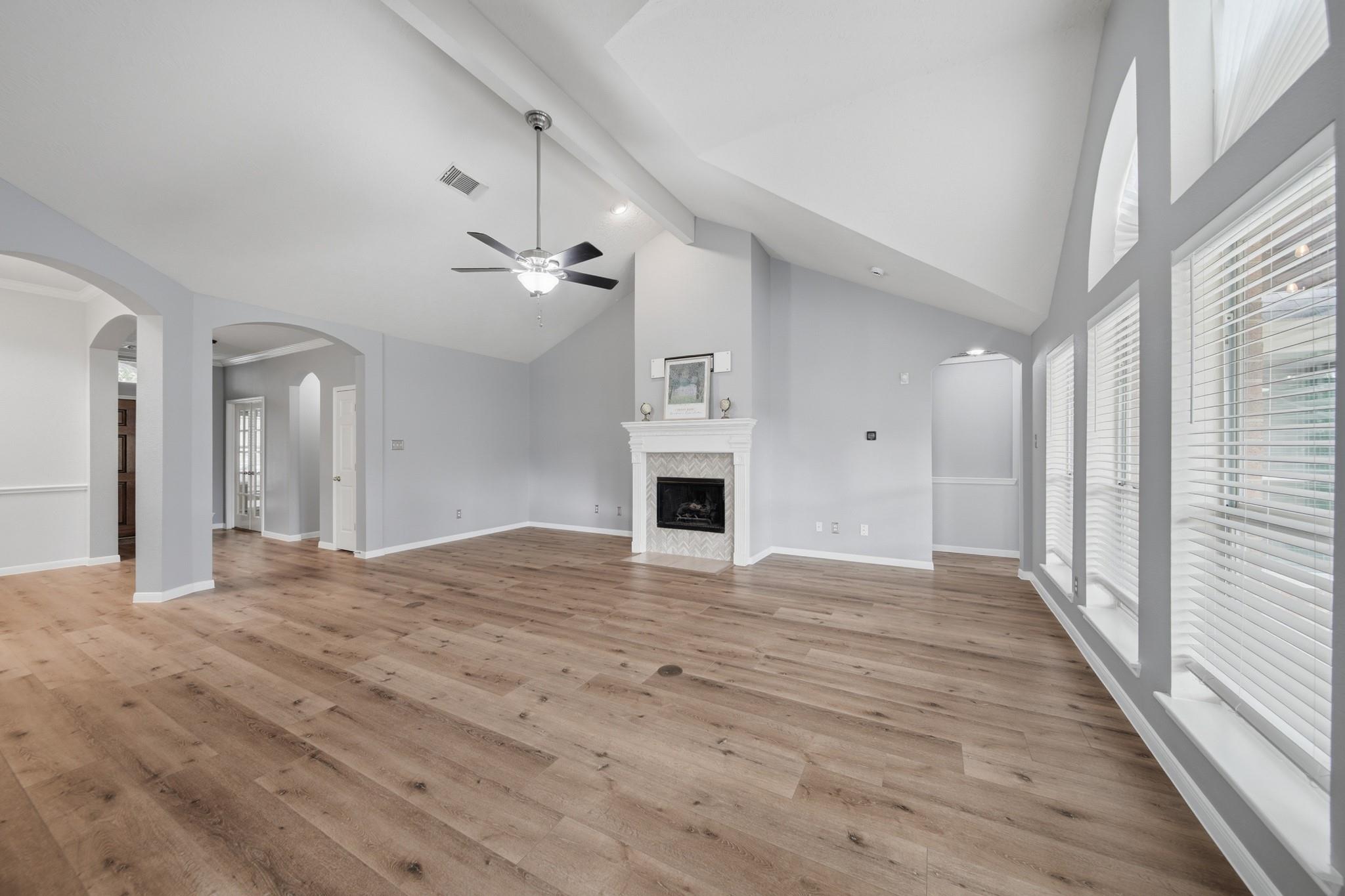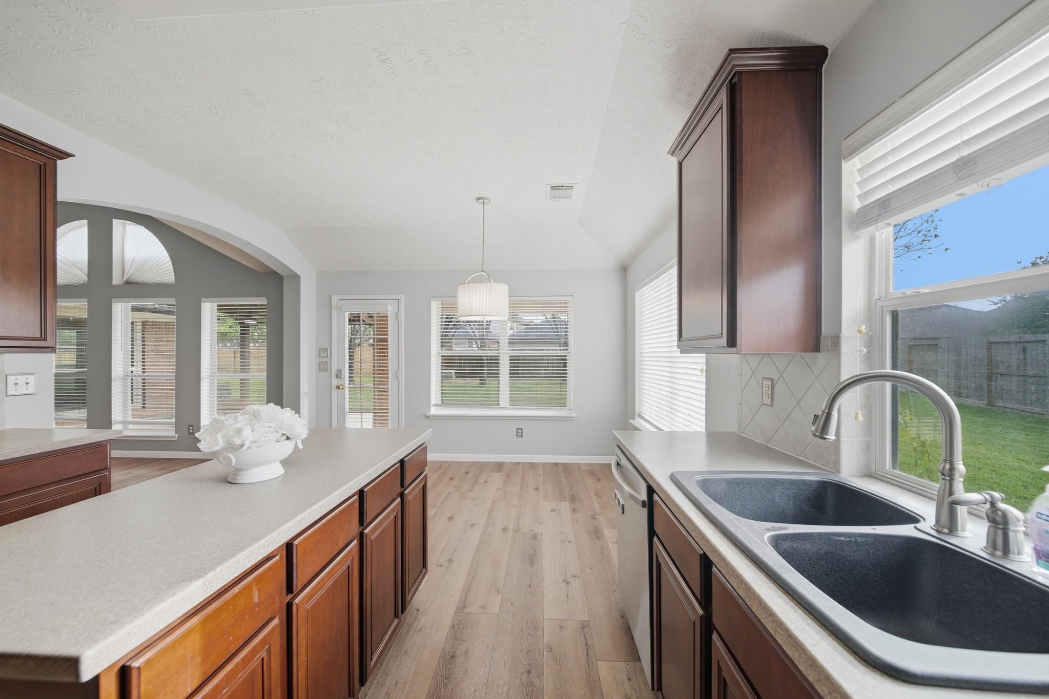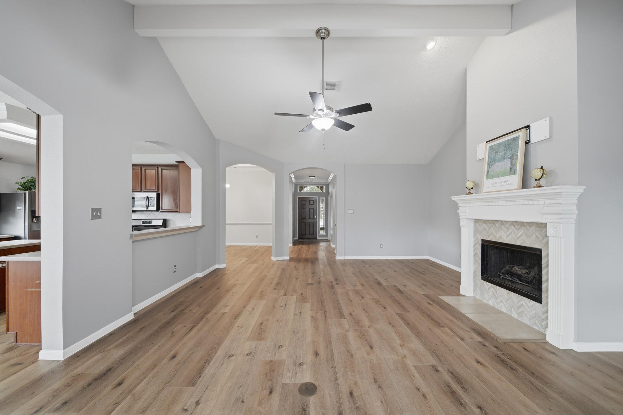 Beautifully maintained one-story home tucked on a quiet cul-de-sac in highly desirable South Shore Harbour. This inviting 3-bedroom, 2-bath home features a new roof (2022), HVAC system ( 2024), updated primary shower, and durable LVP flooring throughout, with carpet in the bedrooms for added comfort. A cozy fireplace anchors the high-ceiling living room, creating a warm, welcoming space. A skylight brightens the elegant formal dining room with natural light. The oversized 2-car garage includes a 5-ft extension and epoxy flooring, ideal for storage or a workspace. The open-concept layout offers a bright living area that flows seamlessly into the island kitchen with stainless steel appliances. The spacious primary suite includes a sitting area. French doors lead to a private study -ideal for working at home. Step outside to a gigantic backyard with plenty of room for a pool, plus a covered patio, extended concrete, and pergola-for relaxing and entertaining. A House you can call a home.