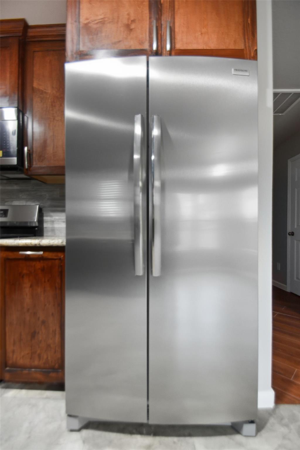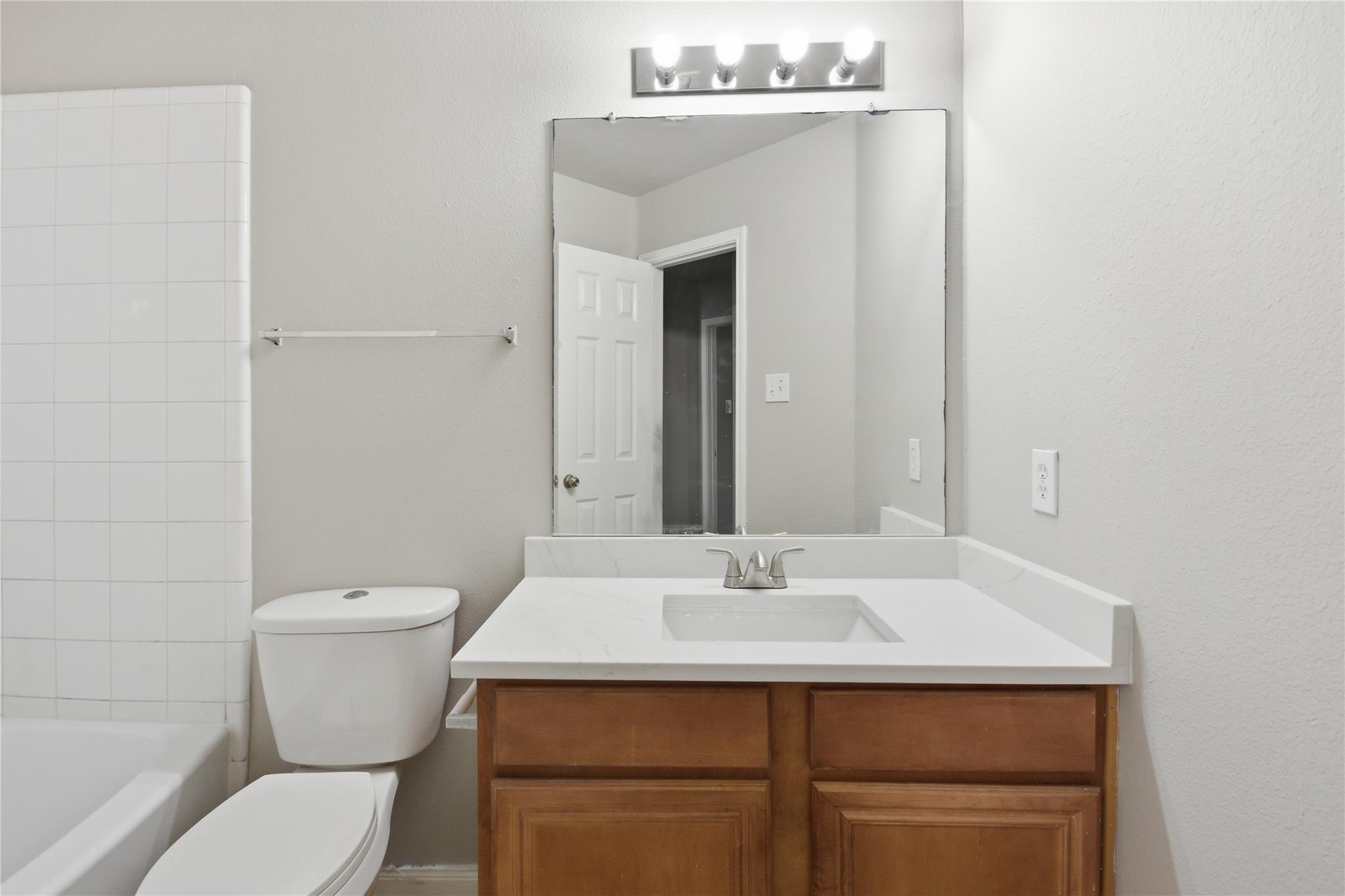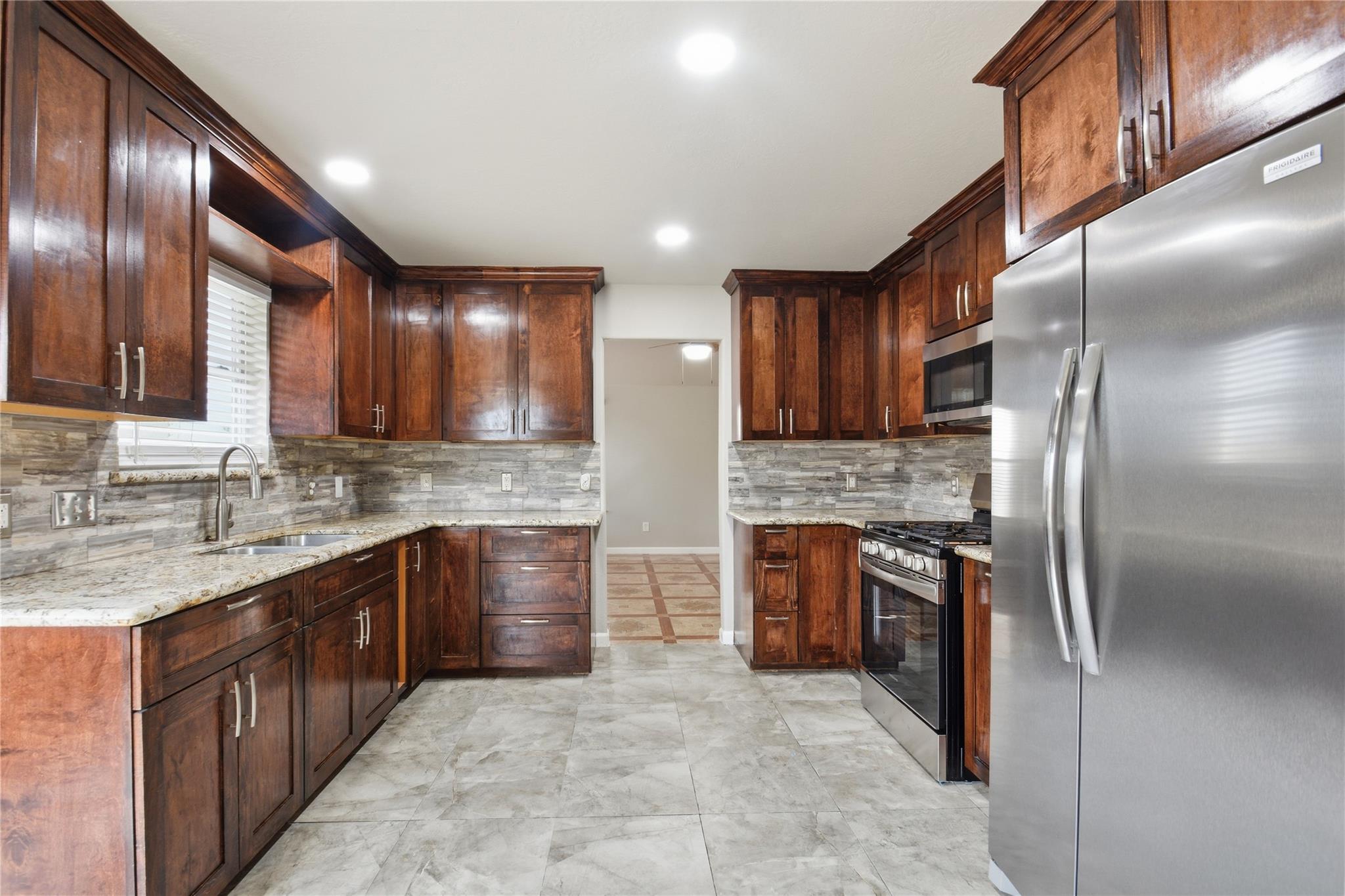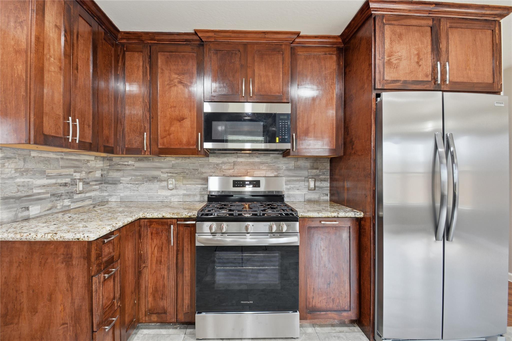Nicely updated 2 story, 3 bedroom, 2.5 bath home with new appliances - washer/dryer, gas range, microwave, and refrigerator, all of which convey with property. Fresh paint inside and out, high ceilings, granite counters, and refinished cabinets in kitchen. New water heater recently installed. Immaculate garage with wood look tile flooring. All bedrooms upstairs with tile, wood, and laminate flooring, no carpet in home. New fence on one side of backyard, no back neighbors. Convenient access to Beltway 8, backyard features new fire pit and resurfaced patio. Excellent, move-in ready condition in a great location.
