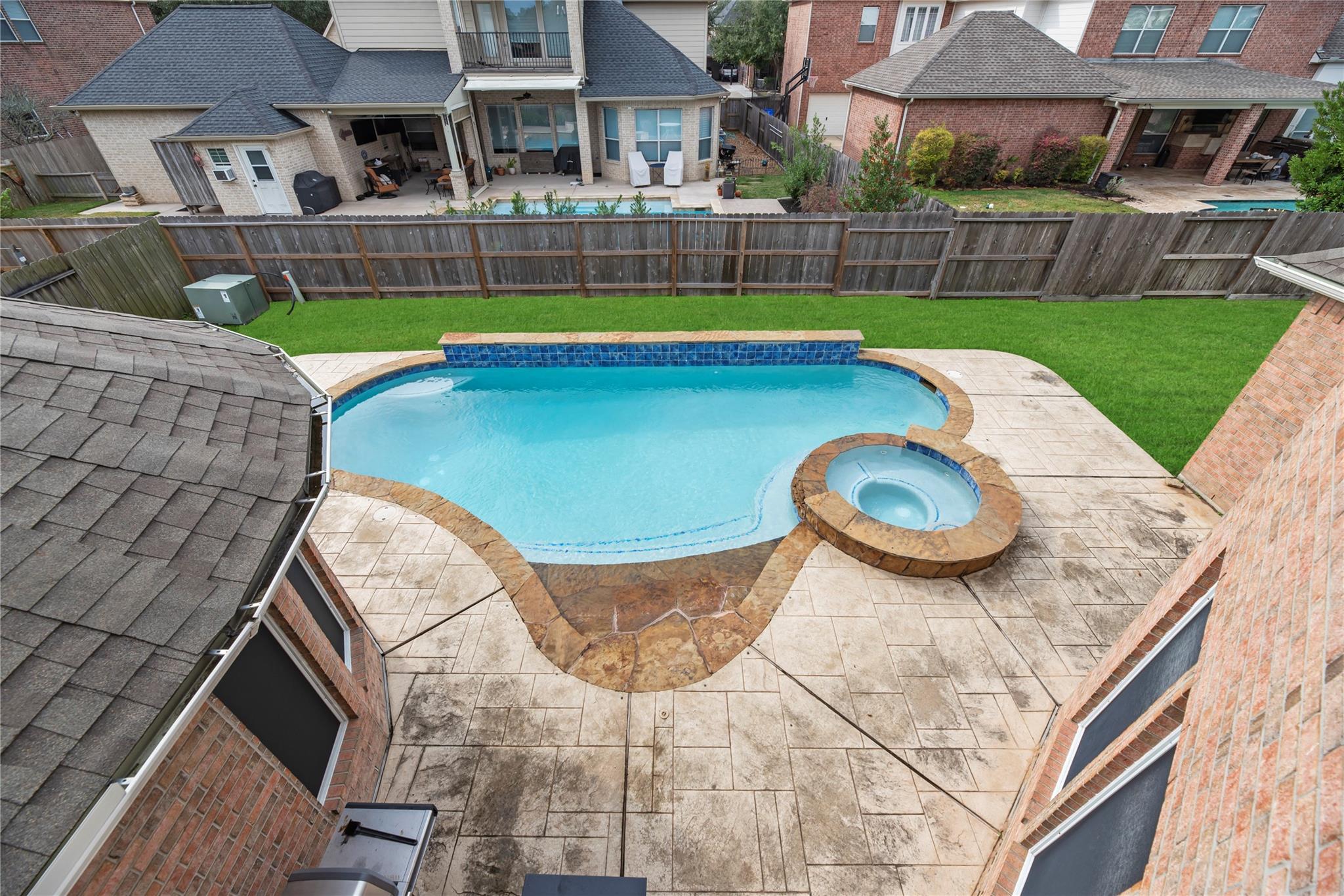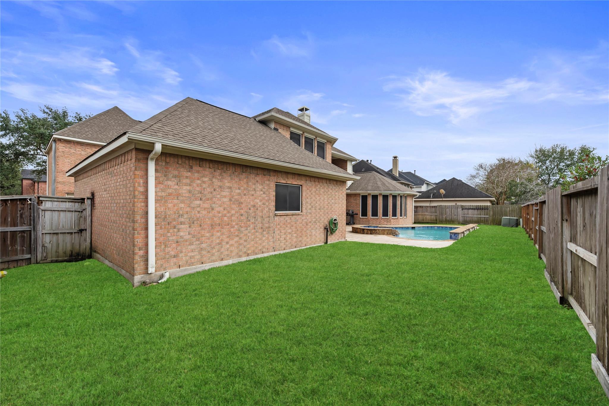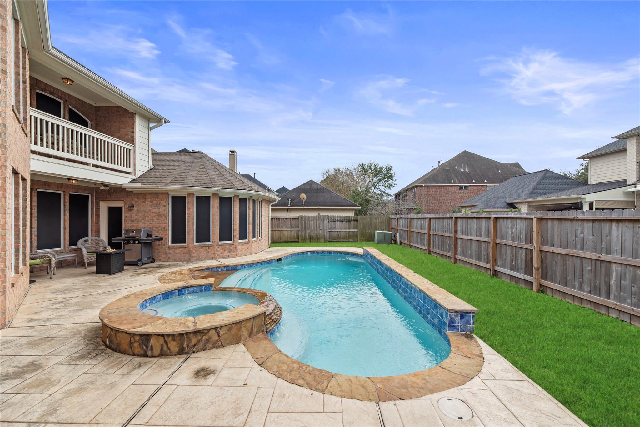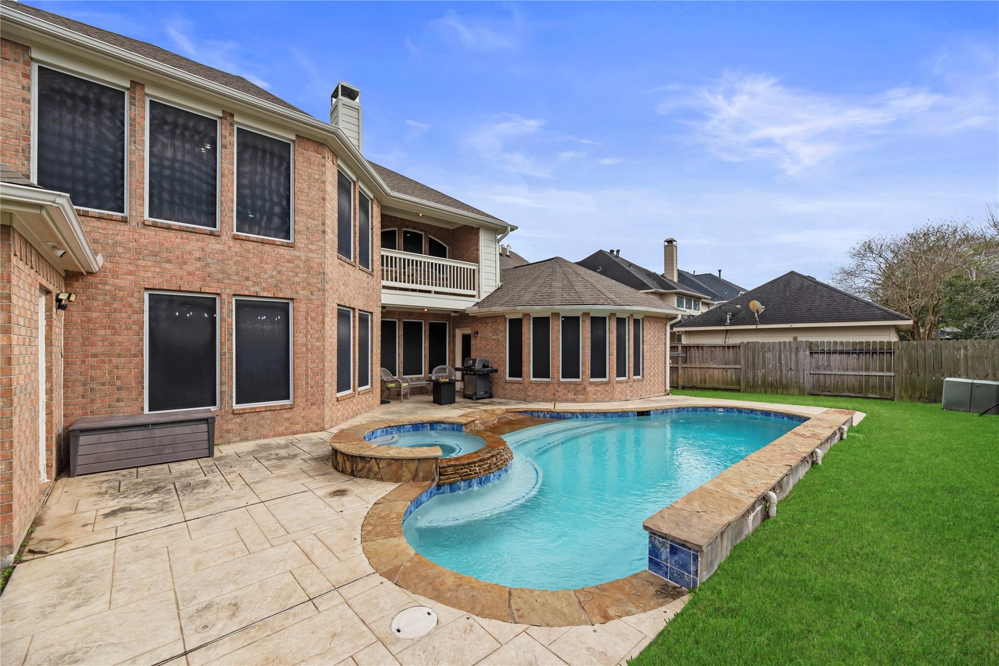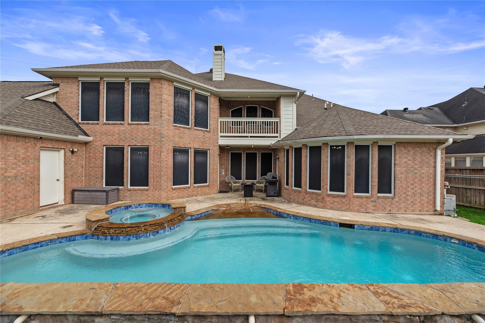 Step into this spacious 5 bedroom, 3.5 bath home in the welcoming community of Fall Creek. With its open floor plan, this home is ideal for entertaining. The beautifully updated large kitchen offers a coffee bar and is a dream for cooking enthusiasts. This property boasts a home office, two game rooms, a media room, and an updated primary bathroom with a large shower and also a soaker tub for when you need a little extra relaxation time. A organized, updated primary closet is an extra special touch to the primary bath. Outside you can enjoy the pool during hot summers and the 3 car garage offers plenty of storage space. A porte-cochere and dedicated auto court enhances day-to-day convenience, providing secure parking and the perfect place to play basketball. This home combines comfort and functionality for the whole family. Roof was replaced in 2023.