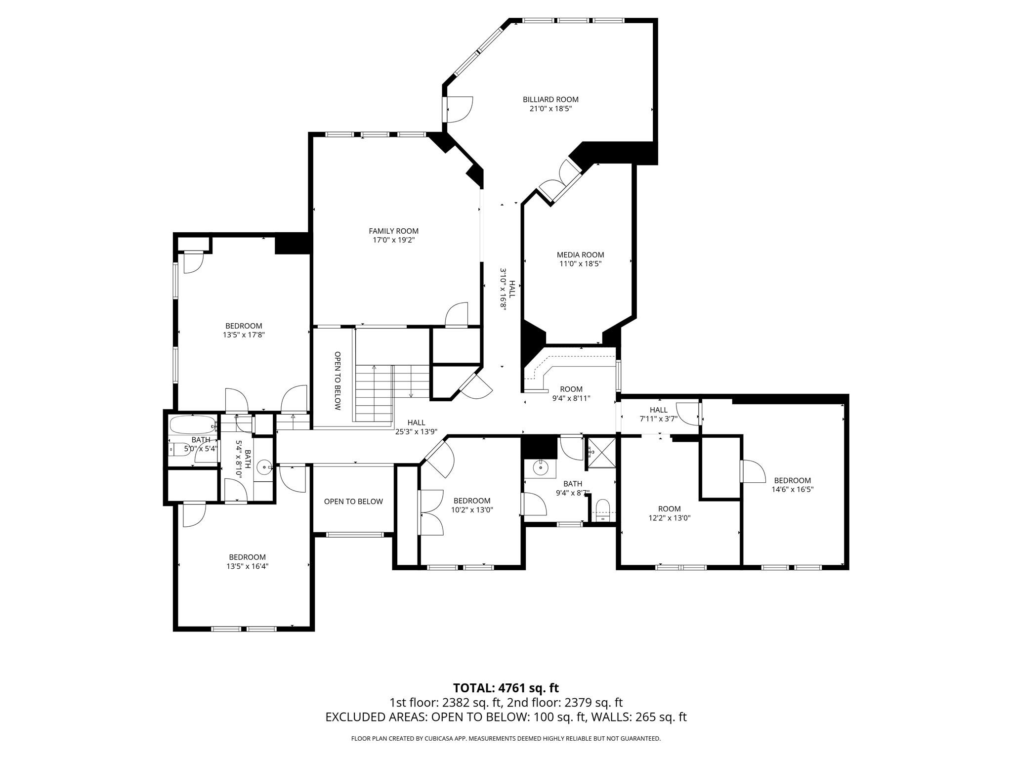 Second FloorFamily Room:17'0" x 19'2"Bedroom:13'5" x 16'4"Bedroom 2:13'5" x 17'8"Bedroom 3:14'6" x 16'5"Bedroom 4:10'2" x 13'0"Game Room:21'0" x 18'5"Home Office/Study:9'4" x 8'11"Media Room:11'0" x 18'5"Extra Room:12'2" x 13'0"