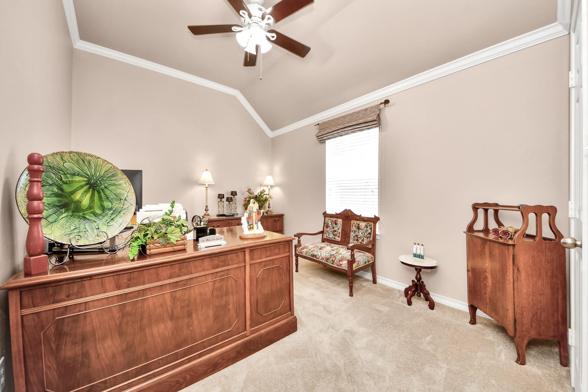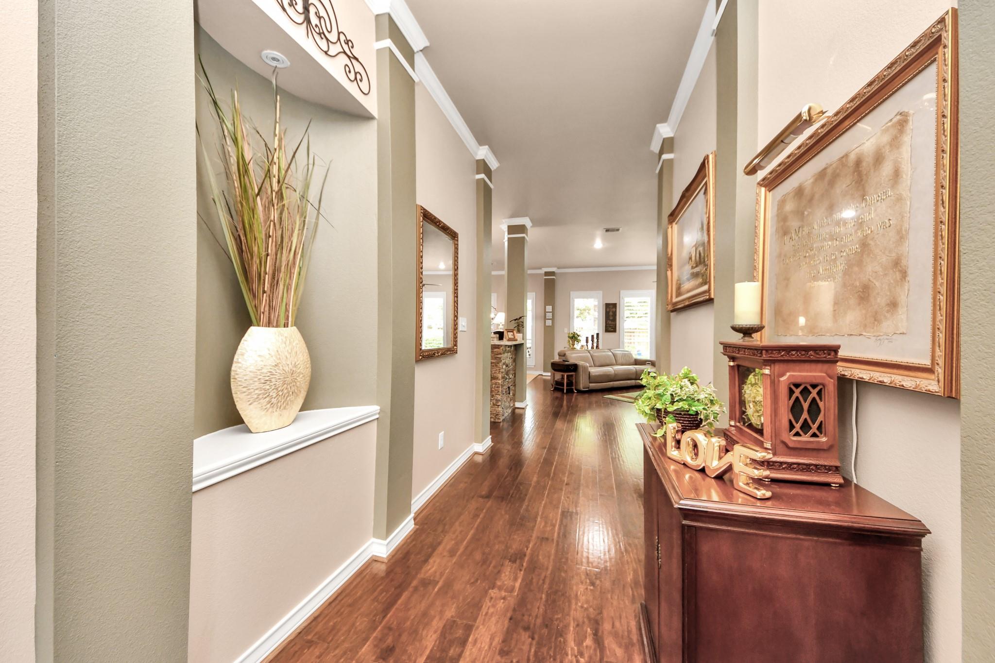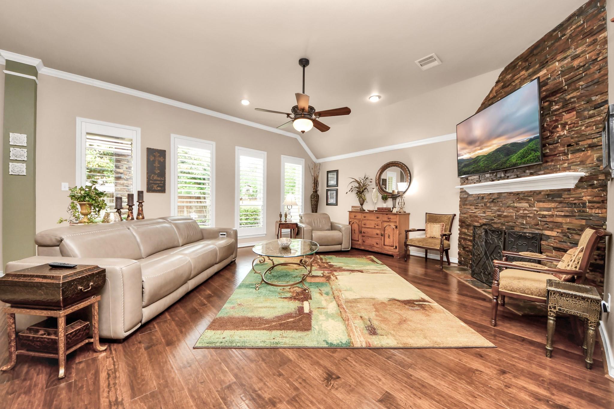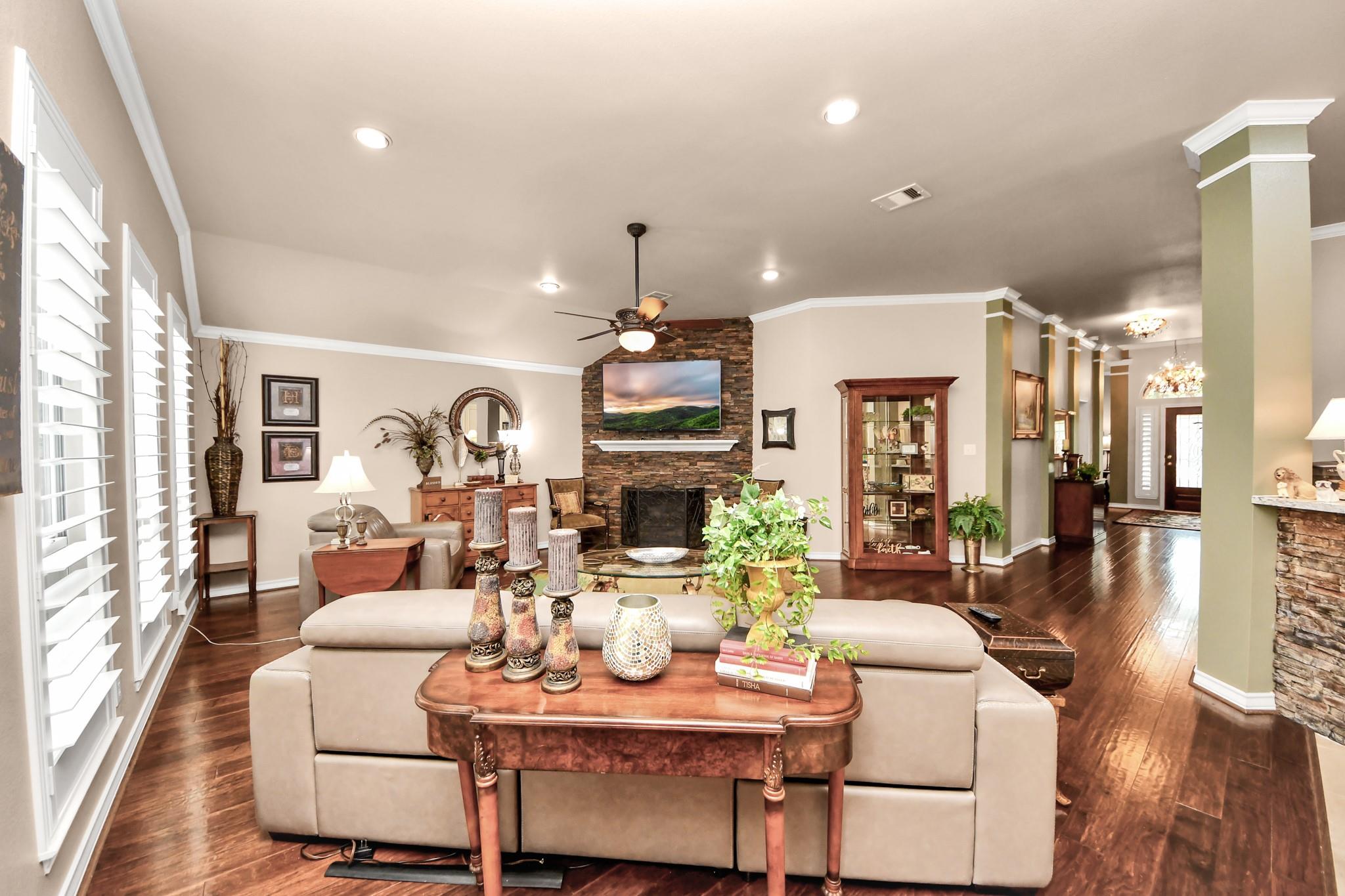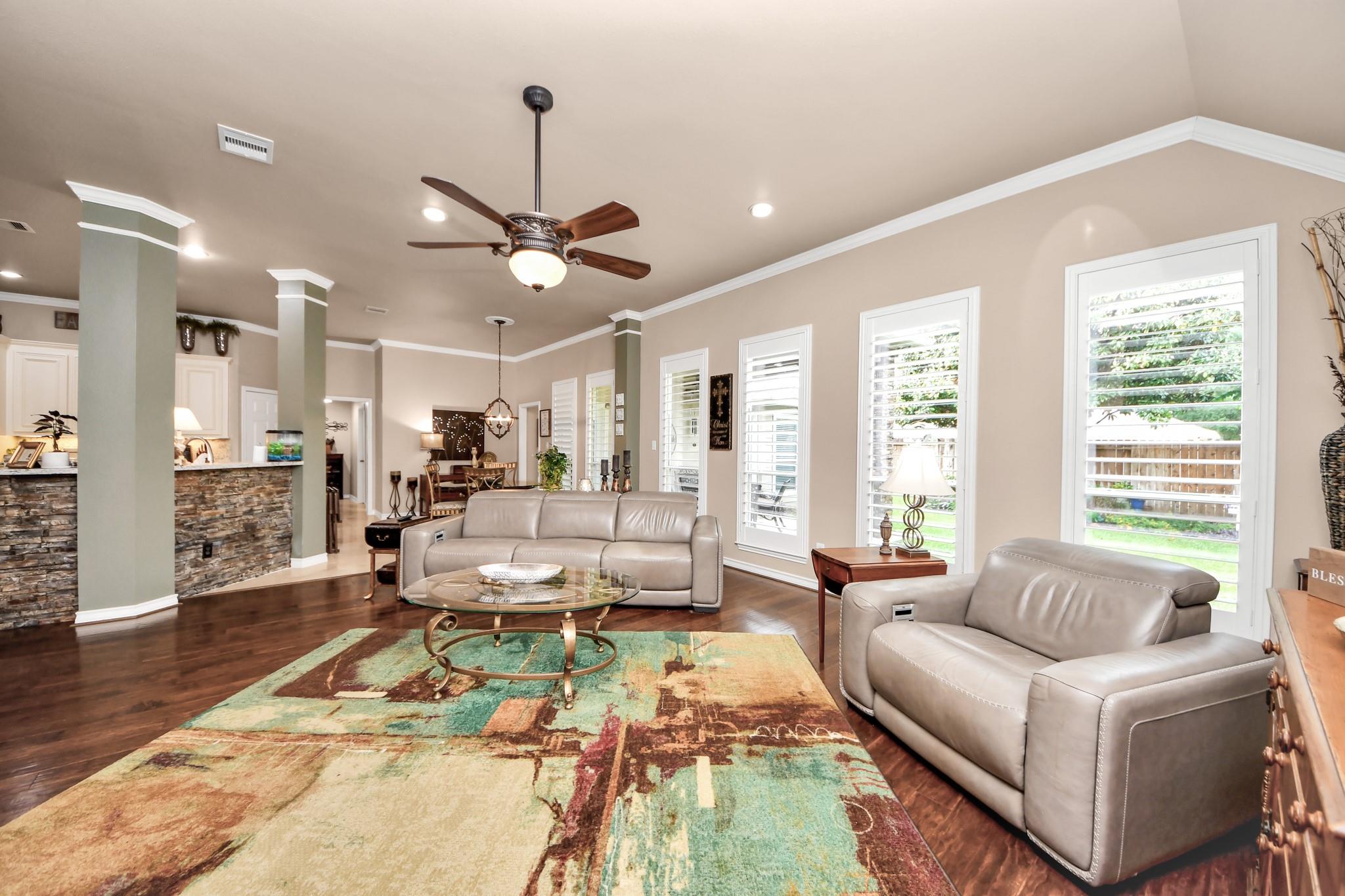 This lovely Perry home offers a highly desirable floor plan featuring a grand front foyer, formal dining room, and formal living room. The split layout provides 4 bedrooms, 3 full baths, and privacy for the primary suite tucked away at the back of the home. The primary bath retreat includes a walk-in shower, soaking tub, dual sinks and a spacious walk-in closet. The kitchen opens to the living room, breakfast nook and features an island with a gas cooktop, stainless steel Bosch dishwasher, refrigerator, walk-in pantry, butler’s pantry, and a nicely sized laundry room. The living room is filled with natural light from floor-to-ceiling windows. Crown molding, rich hardwood floors, elegant light fixtures, and plantation shutters add warmth and charm throughout. This home has never flooded and sits nicely on a corner lot in Copper Village. The roof was replaced in 2023 with a 50-year shingle, and the home is equipped with a Generac generator, offering peace of mind during power outages.