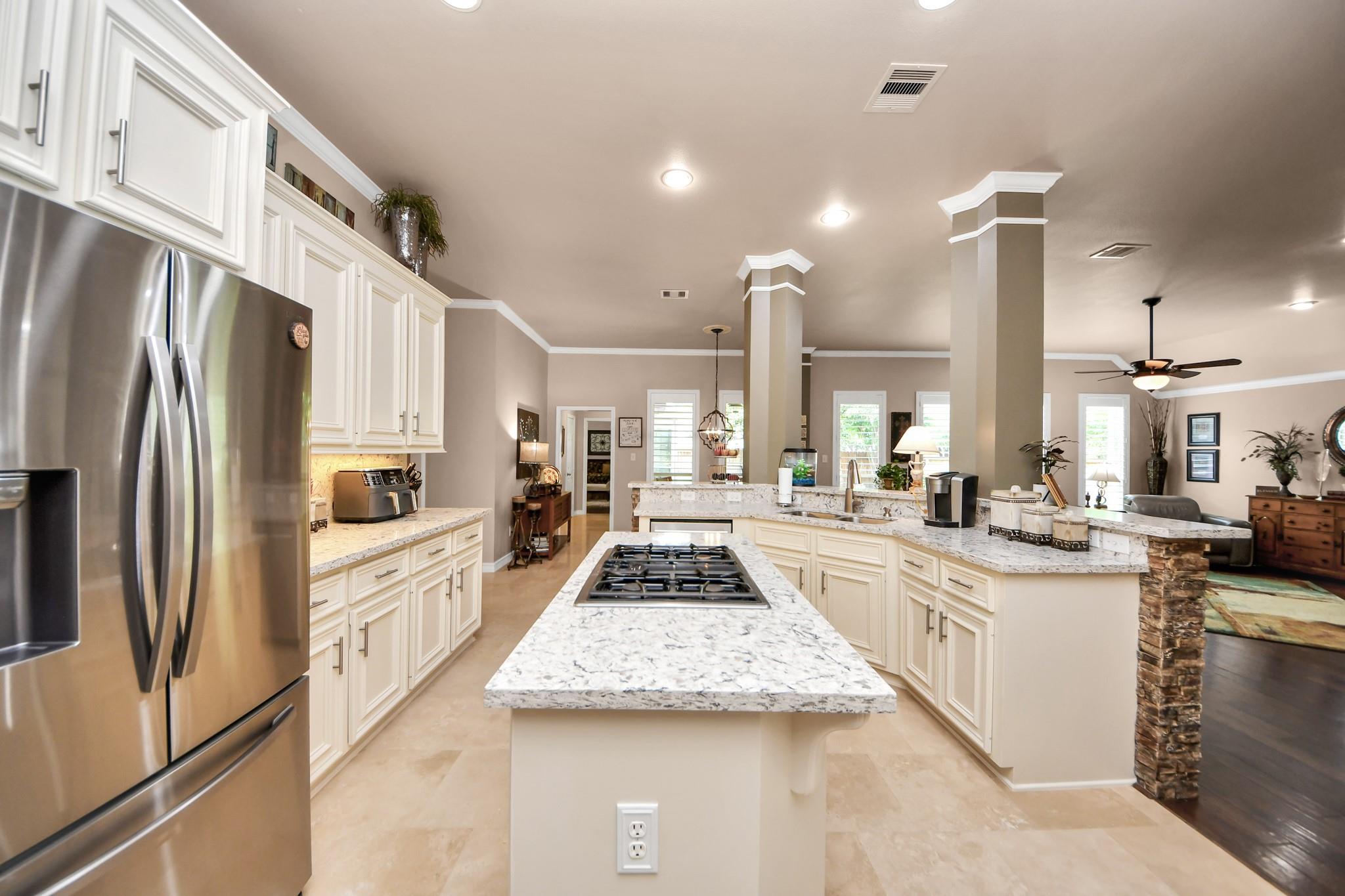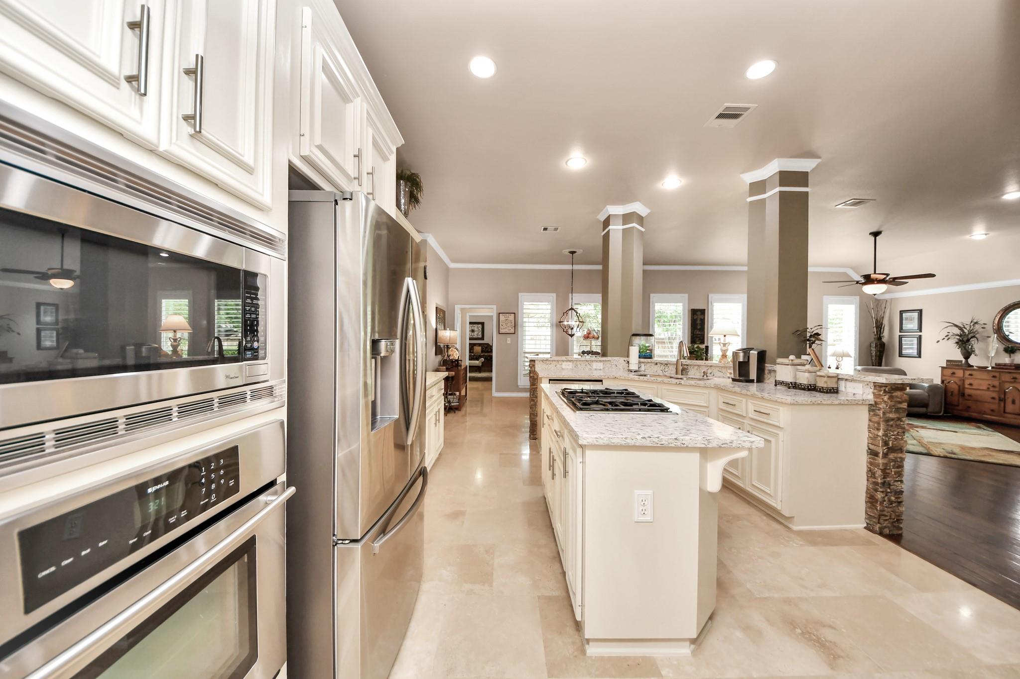 InteriorFireplace:1/Gaslog FireplaceFloors:Carpet,Stone,Tile,Travertine,WoodCountertop:GRANITEBathroom Description:Primary Bath: Double Sinks,Primary Bath: Separate Shower,Primary Bath: Soaking Tub,Secondary Bath(s): Tub/Shower ComboBedroom Desc:All Bedrooms Down,Primary Bed - 1st Floor,Split Plan,Walk-In ClosetKitchen Desc:Butler Pantry,Island w/ Cooktop,Kitchen open to Family Room,Pantry,Under Cabinet Lighting,Walk-in PantryRoom Description:Family Room,Formal Dining,Formal Living,Utility Room in HouseHeating:Central GasCooling:Central ElectricConnections:Gas Dryer ConnectionsDishwasher:YesDisposal:YesCompactor:NoMicrowave:YesRange:Gas CooktopOven:Gas OvenIce Maker:NoEnergy Feature:Ceiling Fans,GeneratorInterior:Crown Molding,Fire/Smoke Alarm,Formal Entry/Foyer,High Ceiling,Refrigerator Included,Window Coverings