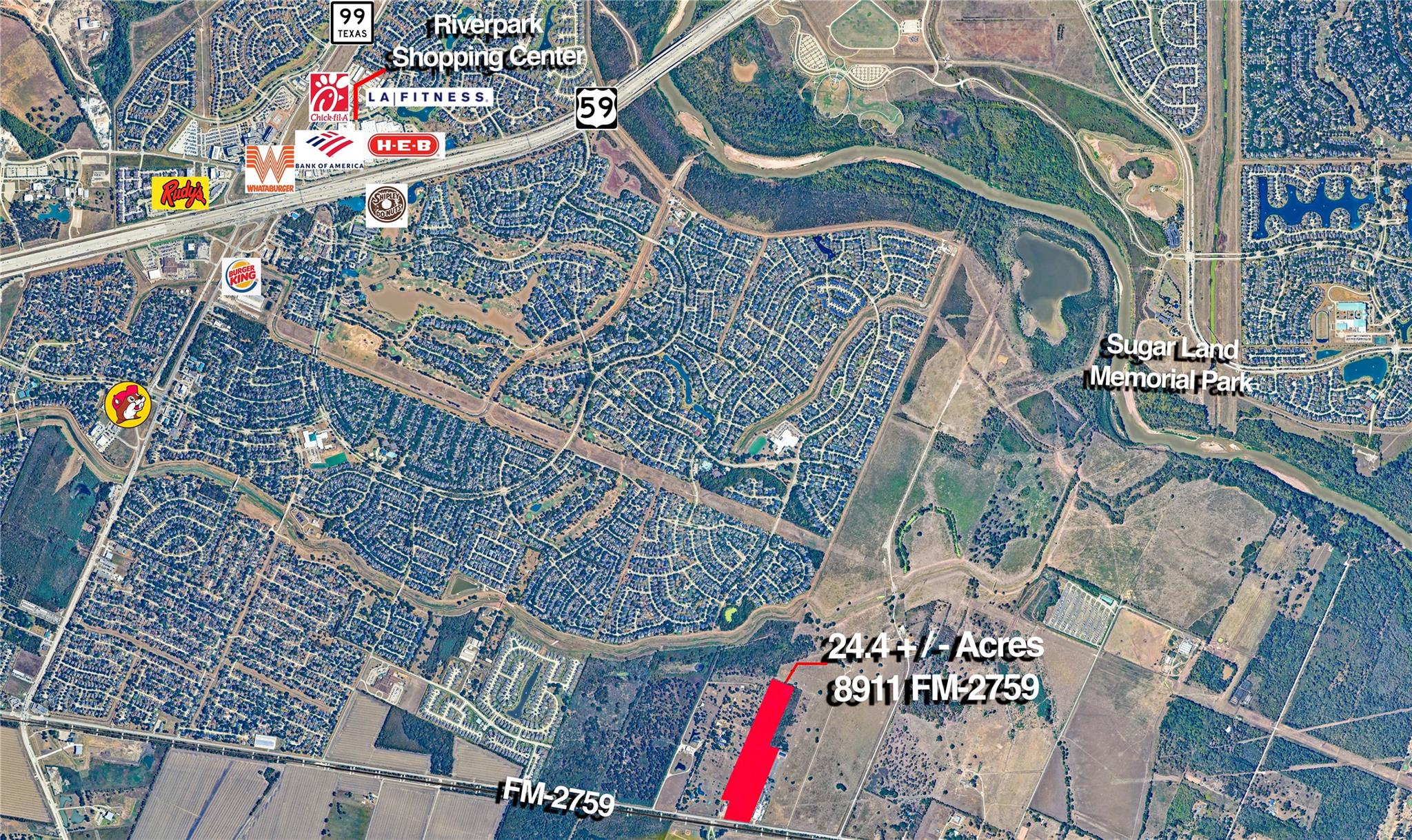 Located in the heart of Fort Bend County, this rare 24.4± acre tract offers over 400 feet of high-visibility frontage along FM 2759. Just minutes from the planned expansion of the Grand Parkway (99 Tollway) and Highway 69, the property is positioned in a rapidly growing corridor. Nearby developments include Austin Point, a large master-planned community projected to feature over 14,000 homes, and Del Webb, a 2,000+ home active adult community directly across the street. Growth is further supported by the nearby MD Anderson Cancer Center in Sugar Land, fueling strong demand for residential and commercial development. With no zoning or deed restrictions, the property provides exceptional flexibility for multifamily, single-family acreage communities, RV park or self-storage development, or a private estate. Ideal for immediate development or long-term investment.