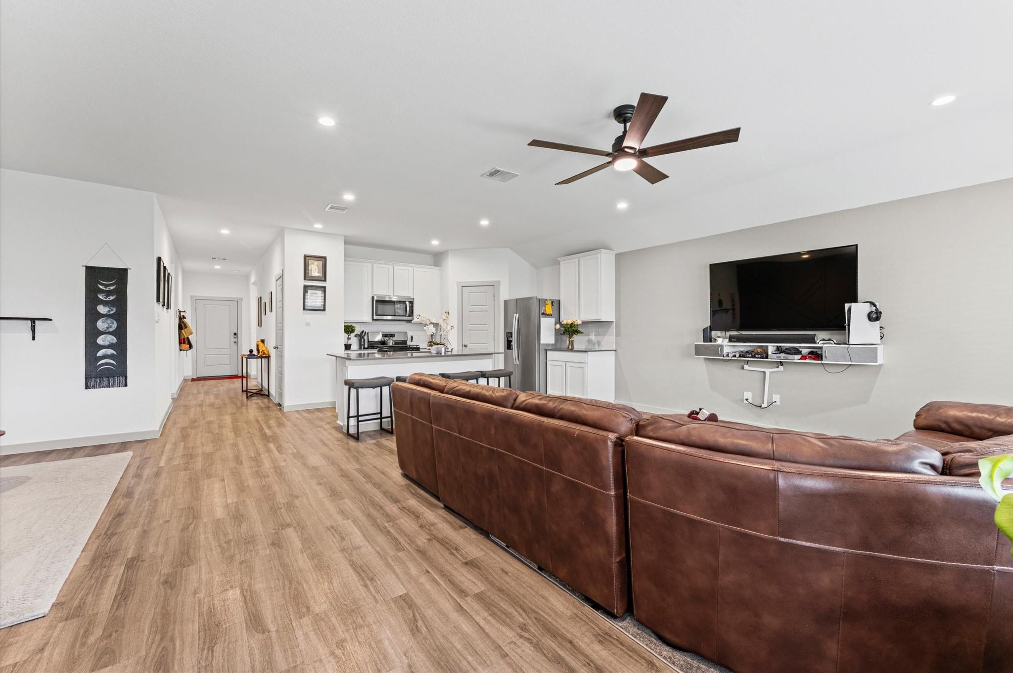 Welcome to this beautifully maintained 4-bedroom, 2-bathroom home located in the desirable Caldwell Ranch community in Rosharon. Built in 2023, this home features a modern open floor plan designed for comfortable living and effortless entertaining. Sitting on an oversized lot, you'll enjoy the extra outdoor space which is perfect for play, pets, or future additions. The large covered patio provides the ideal setting for backyard gatherings, weekend BBQs, or simply relaxing in the shade. Inside, you’ll find spacious bedrooms, a bright and airy living area, and a thoughtfully designed kitchen that flows seamlessly into the dining and family rooms. The home also offers ample storage throughout, making organization a breeze. Don’t miss your chance to own this move-in-ready home with great curb appeal, modern features, and plenty of room for a pool! Not to mention, all within a short drive to schools, shopping, and major highways. SOLAR PANELS; FRONT/BACK SPRINKLER SYS; ELECTRIC FIREPLACE.