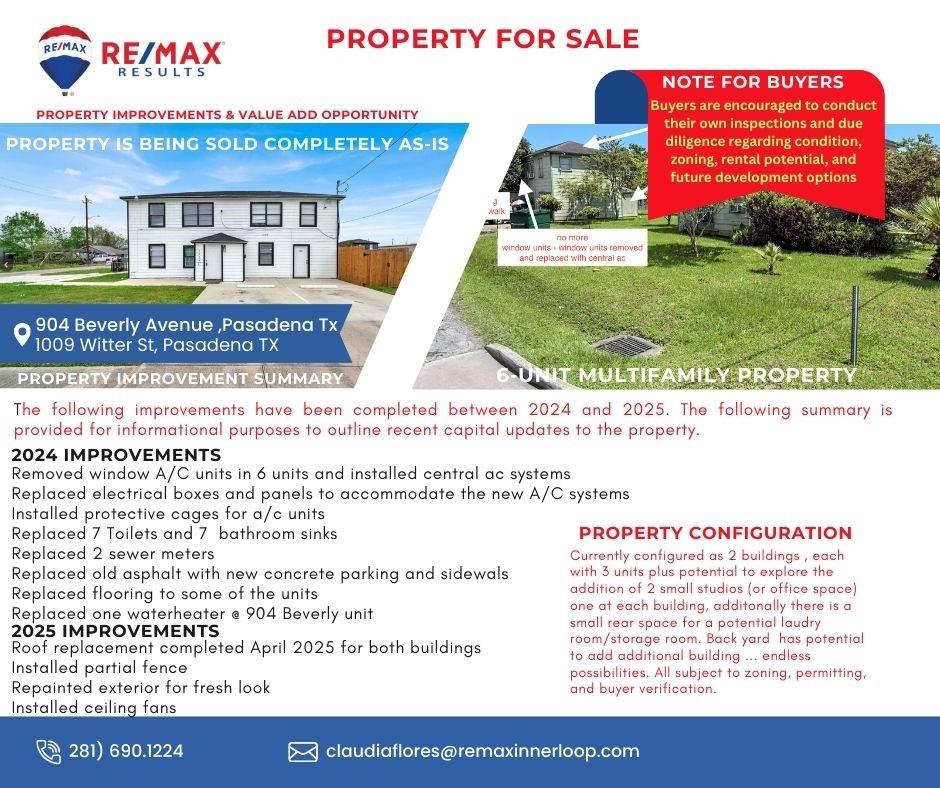 6-unit multi-family property in Pasadena offers an excellent rental mix with 2buildings, each two 1BD/1BA upstairs units and one 2BD/1BA downstairs (possibility to increase to 8 units) Extensive upgrades completed in 2024–2025 include new central A/C systems,roof, fencing,electrical panels and boxes,sewer meters, fresh paint, and much more, see full upgrade list for details. A rear utility room with W/D hookups can be converted into a dedicated laundry area, spacious backyard provides room for future expansion. Located near schools, shopping, major hwys, industrial job centers for strong rental demand. Sold AS-IS. Buyers should verify condition, zoning, rental potential, and development opportunities. (seller has done extensive upgrades)no low offers! Property is 904 Beverly Ave & 1009 Witter St.(3 units ea) . 904 Beverly (office) previously leased as a studio. Currently vacant - needs make ready for added income as your 7th unit !!