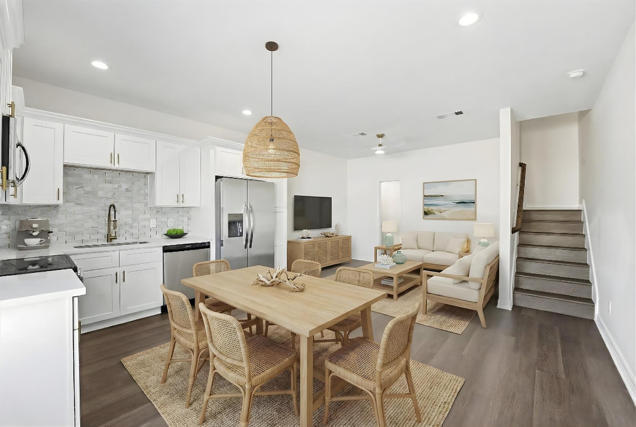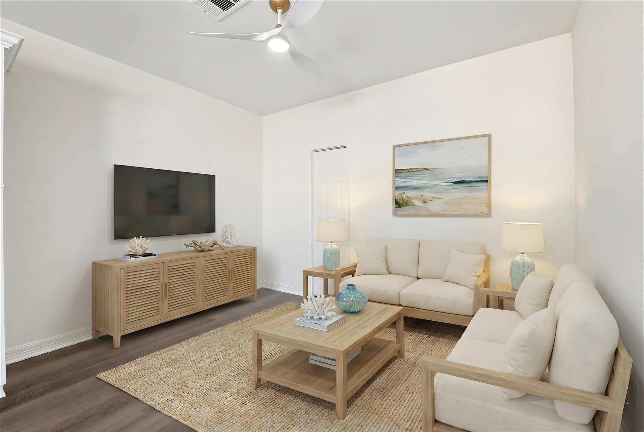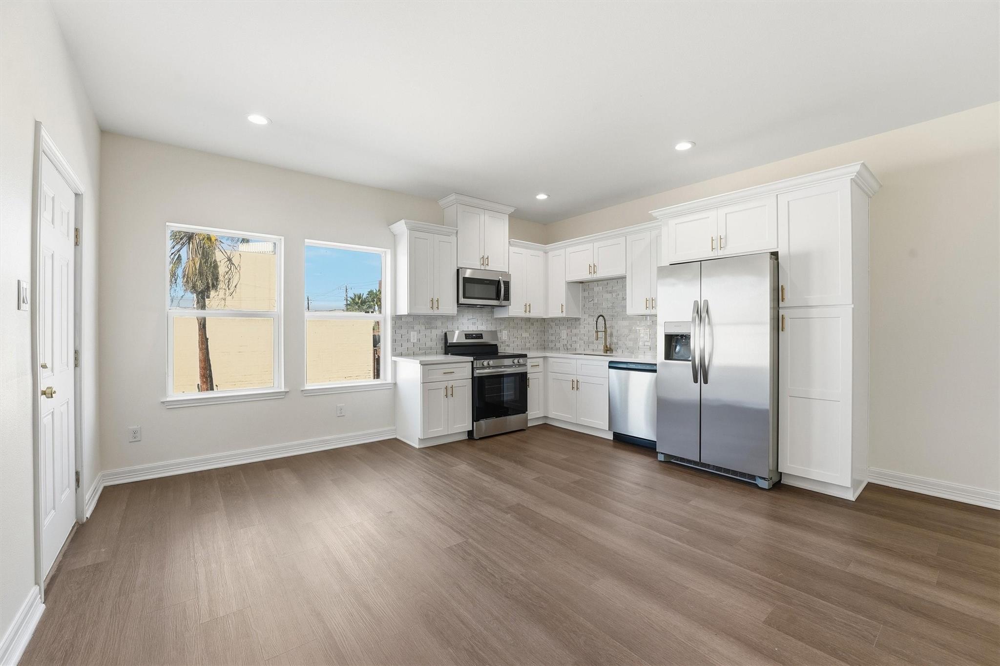 HARD TO FIND BRAND NEW CONSTRUCTION DUPLEX offering an opportunity for owner-occupants or investors. Live in one unit and lease the other or rent both for income. Both identical units feature a modern design with vinyl plank flooring throughout, open-concept living, dining, and kitchen areas, 42" white cabinets, white quartz countertops, stylish tiled backsplash, stainless steel appliances, and contemporary lighting. Each unit includes a half bath downstairs, two spacious bedrooms upstairs, a dedicated washer and dryer area, and a beautifully updated full bathroom. All appliances included, even the washer and dryer. Each unit offers private covered parking for two vehicles or golf cart. Located within walking distance to the Entertainment District and The Strand, with nearby restaurants, shops, and attractions, and just a short ride to the beach, Seawall, and Pleasure Pier. Move-in ready. Unit A is currently Tenant Occupied for immediate rental income. Call for private tour today!