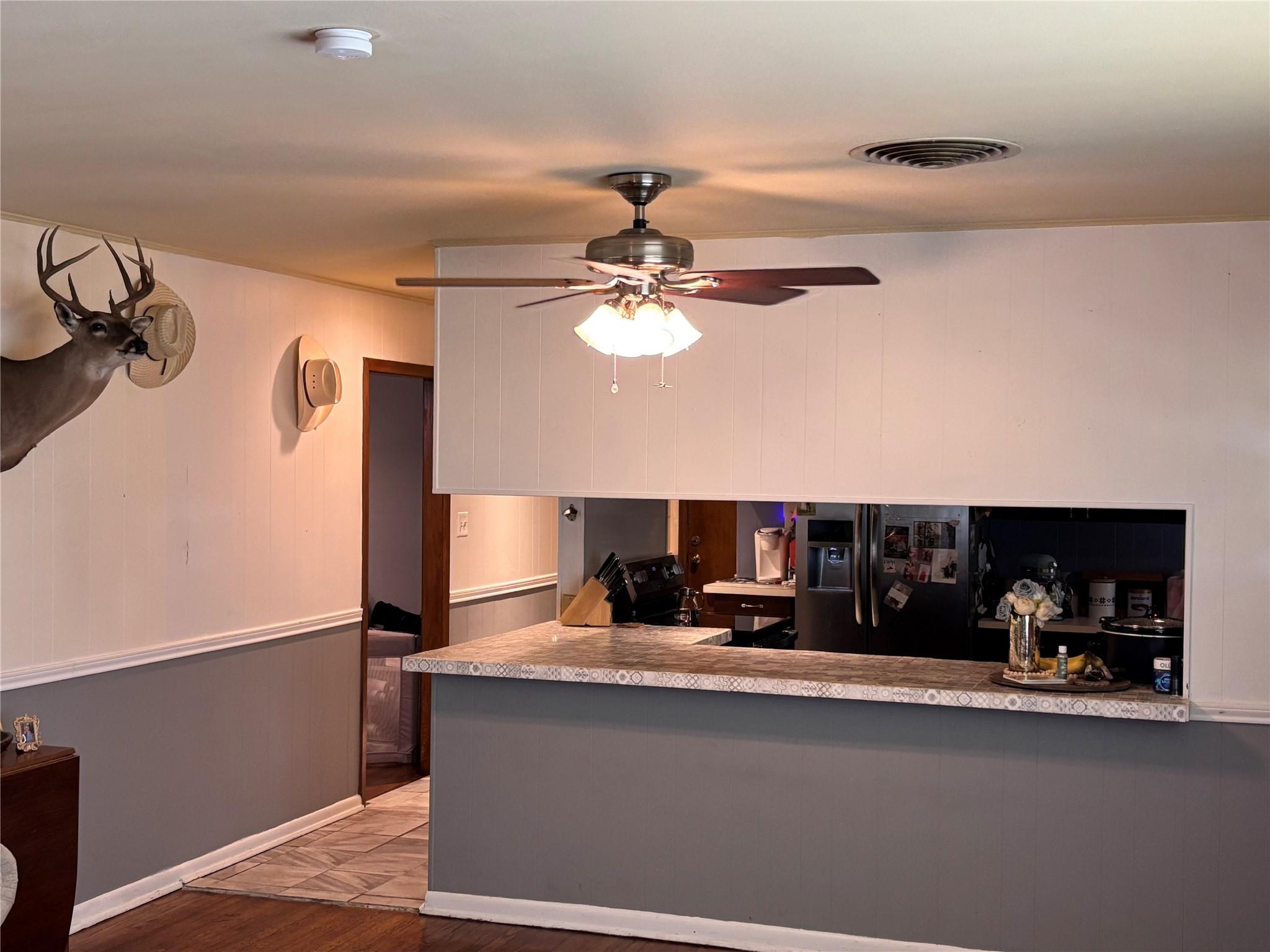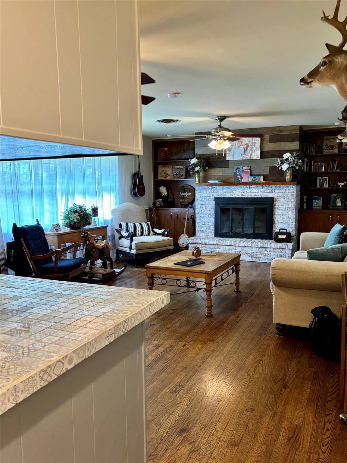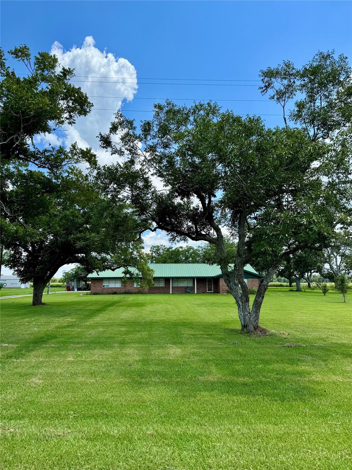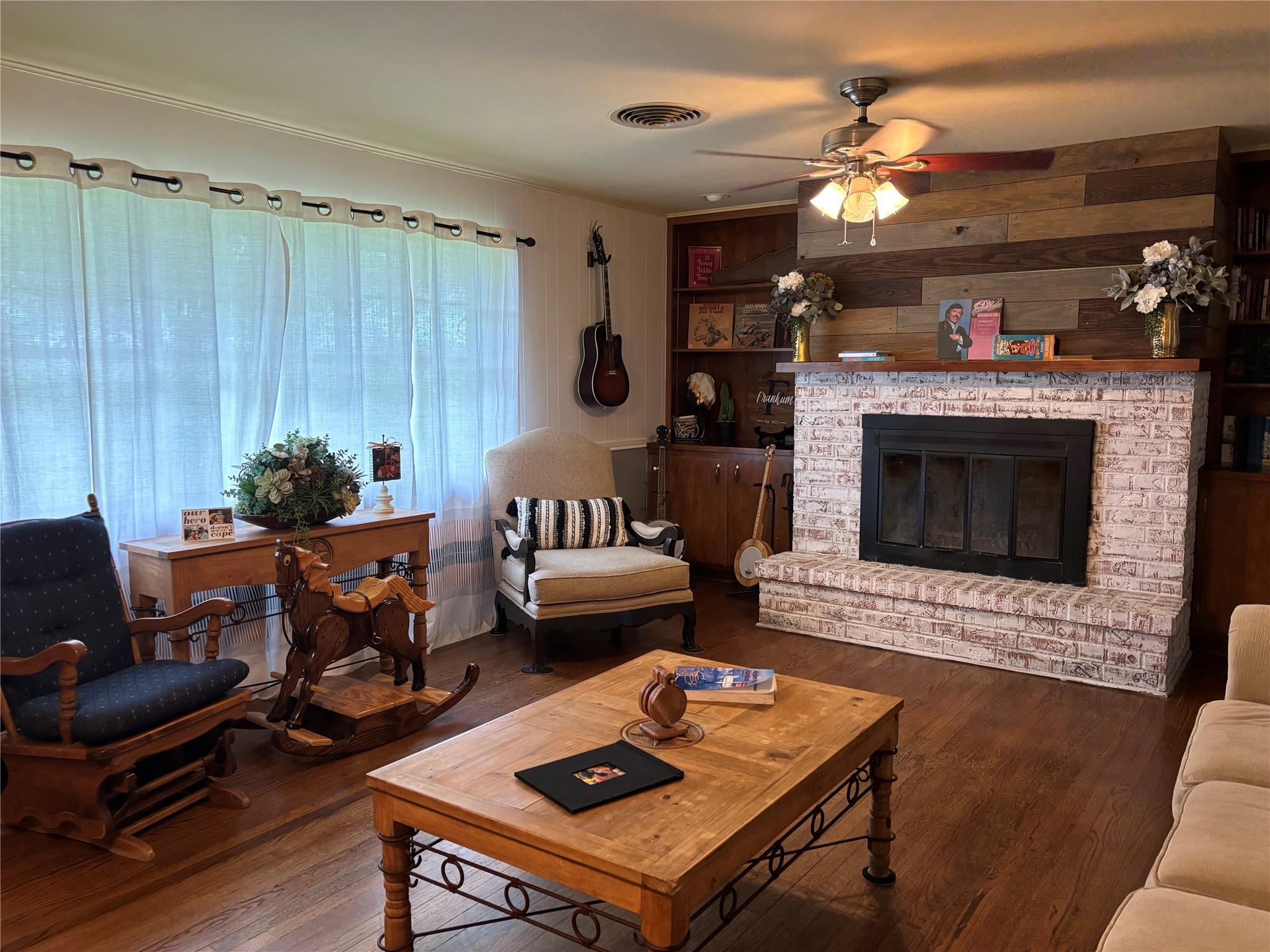 A concrete drive leads to the brick home with metal roof on 4.78 ac. Spacious bedrooms and living areas, shop building, firepit, porches, pecan trees. Large living room, dining room with fireplace and lots of built-ins, entry with large closet, kitchen with wrap around bar & pantry. Big primary bedroom with primary bath w/ tiled shower. The other two bedrooms are spacious and share a bath (Jack & Jill bath) with a tub/shower combination and double sinks. Hardwood flooring and tile. Spacious pantry. Wide frontage on FM 1728, ideal for an investor looking to build an additional home.