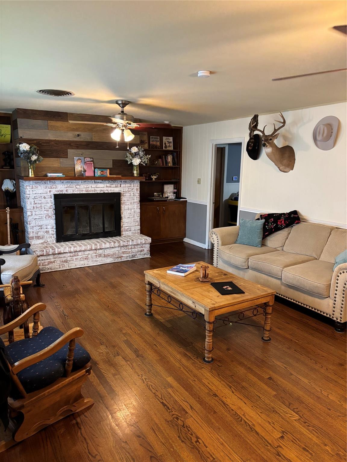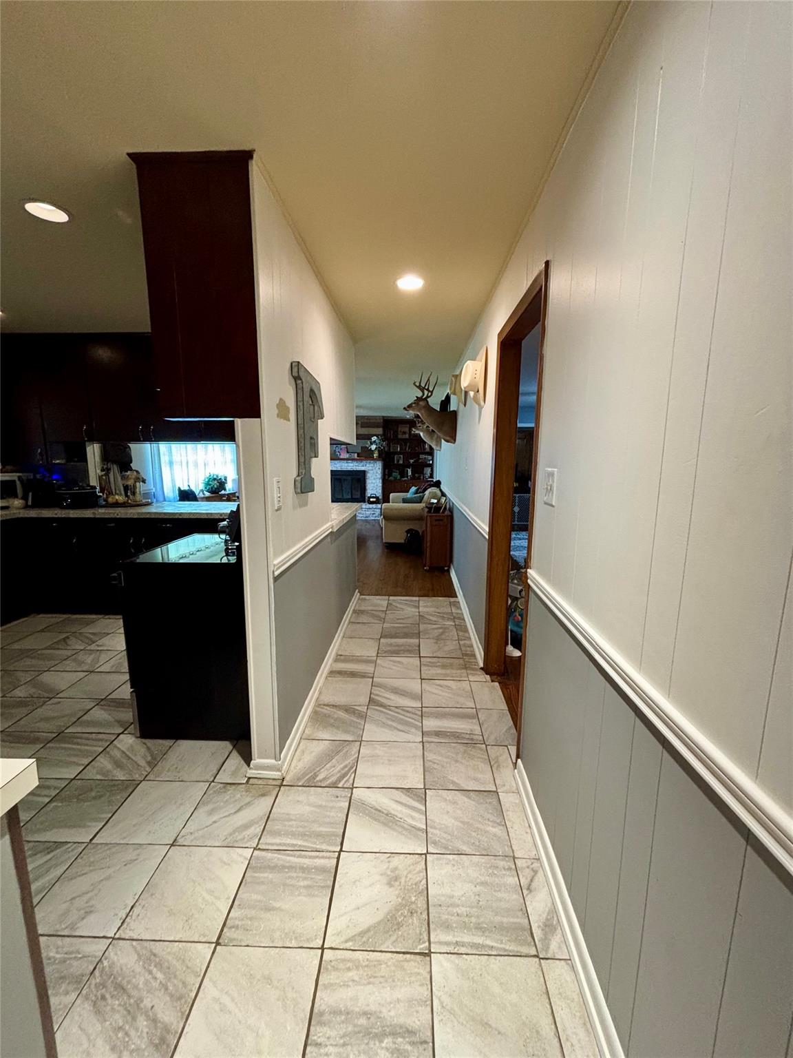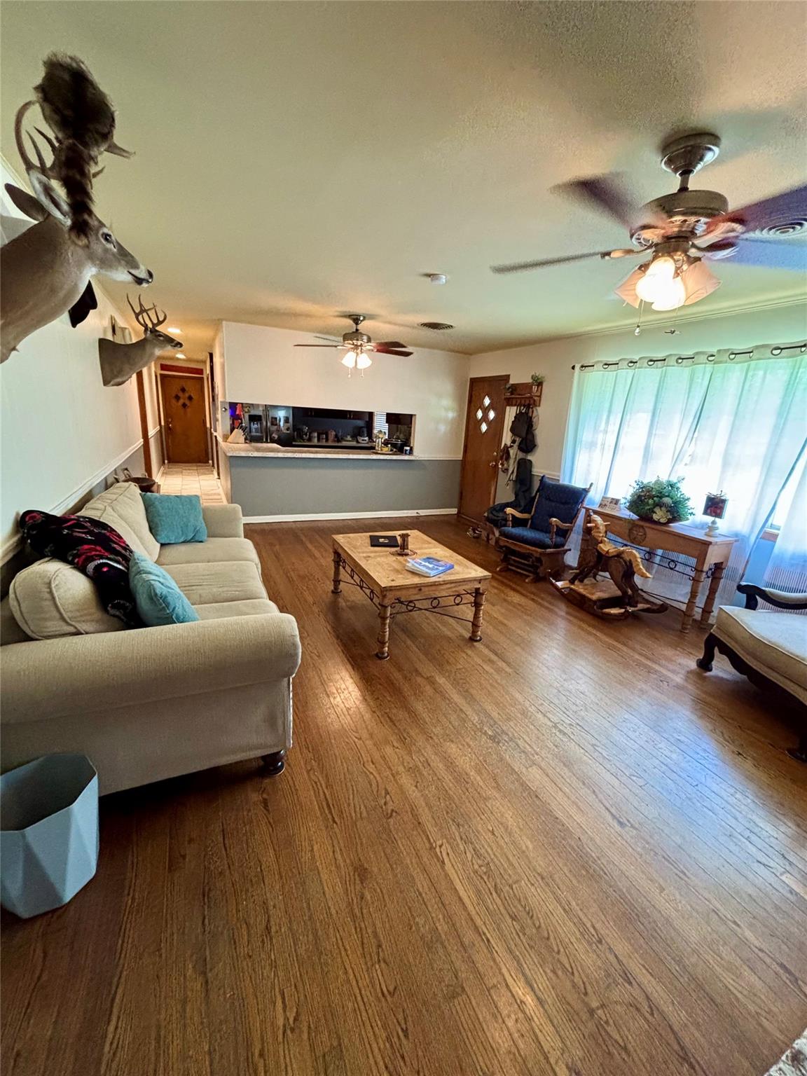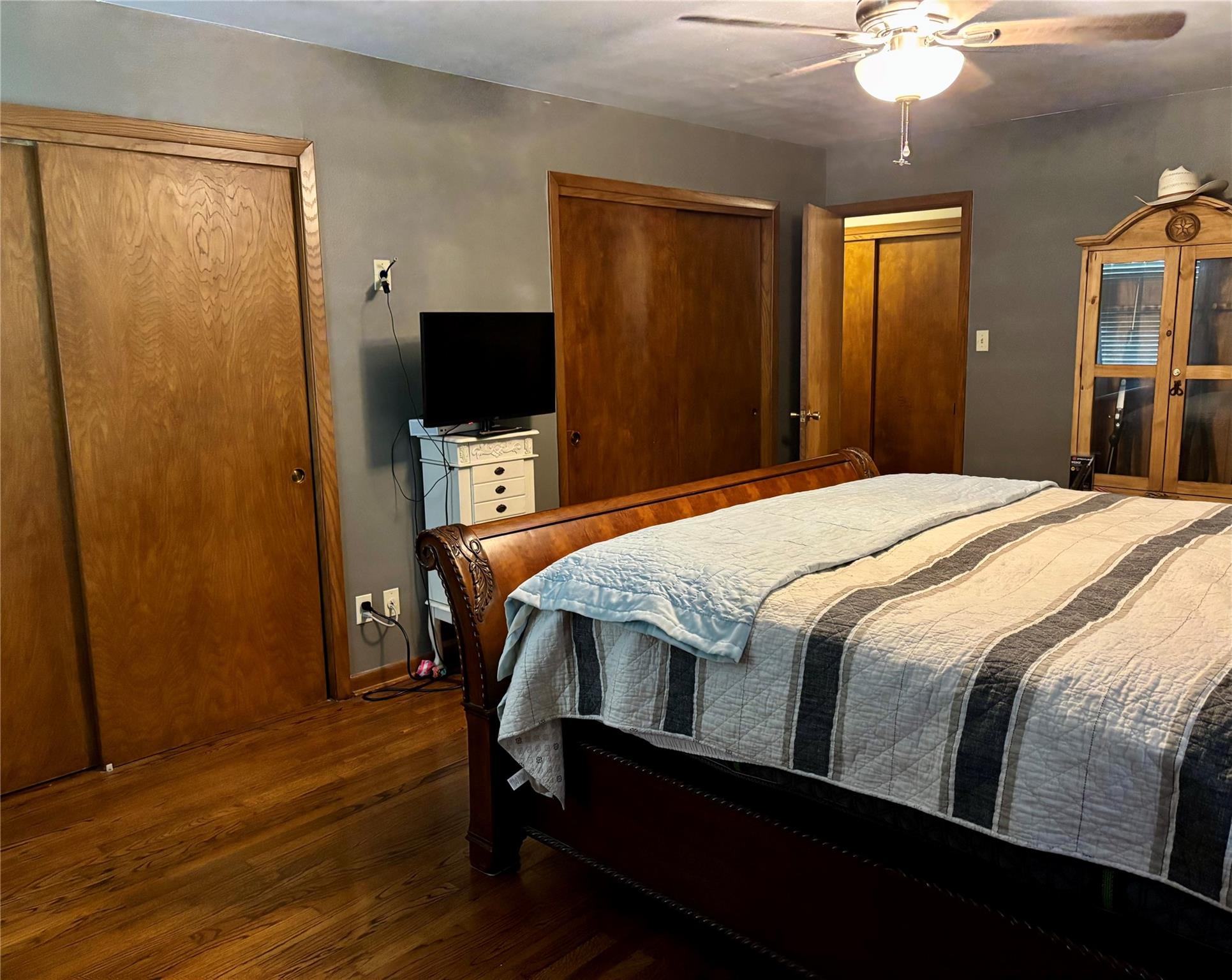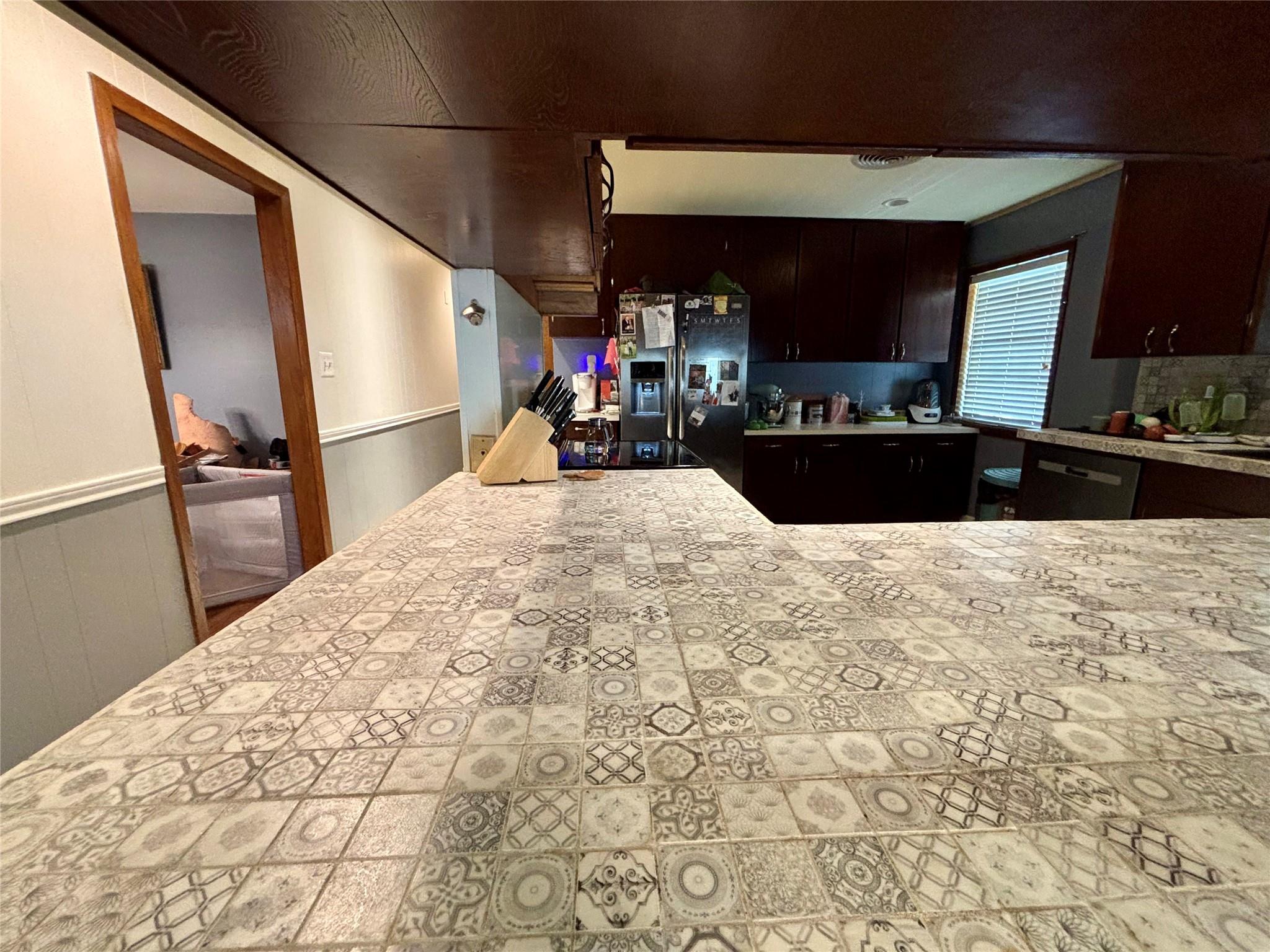 A concrete drive leads to the brick home with metal roof on 4.78 ac. Spacious bedrooms and living areas, shop building, firepit, porches, pecan trees. Large living room, dining room with fireplace and lots of built-ins, entry with large closet, kitchen with wrap around bar & pantry. Big primary bedroom with primary bath w/ tiled shower. The other two bedrooms are spacious and share a bath (Jack & Jill bath) with a tub/shower combination and double sinks. Hardwood flooring and tile. Spacious pantry. Wide frontage on FM 1728, ideal for an investor looking to build an additional home.