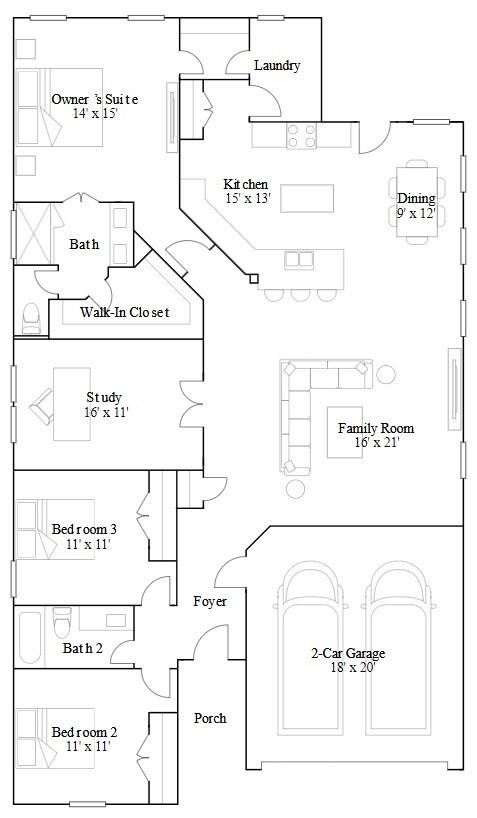 First FloorFamily Room:16x21Dining:9x12Kitchen:15x13Primary Bedroom:14x15Bedroom:11x11Bedroom 2:11x11Home Office/Study:16x11