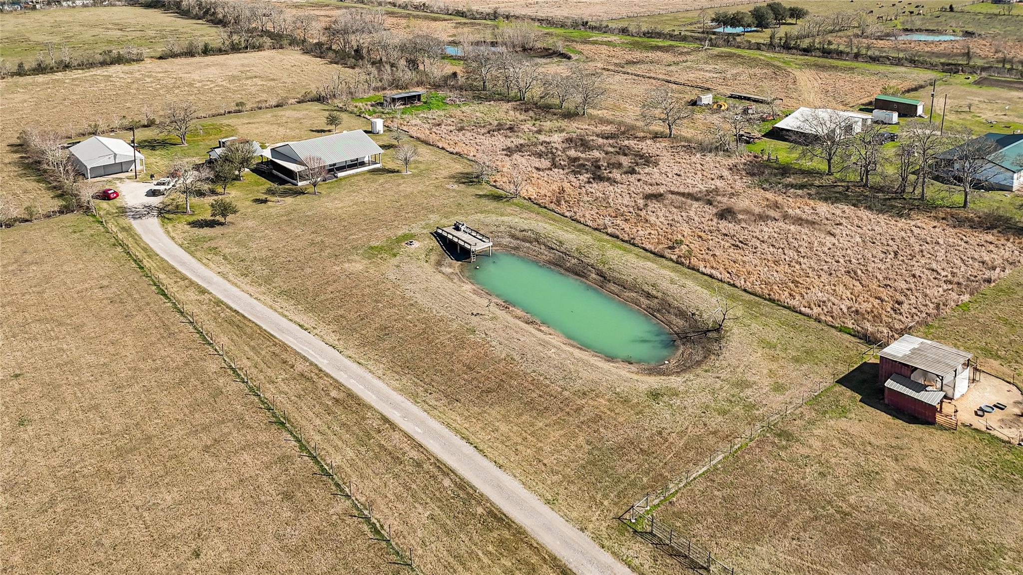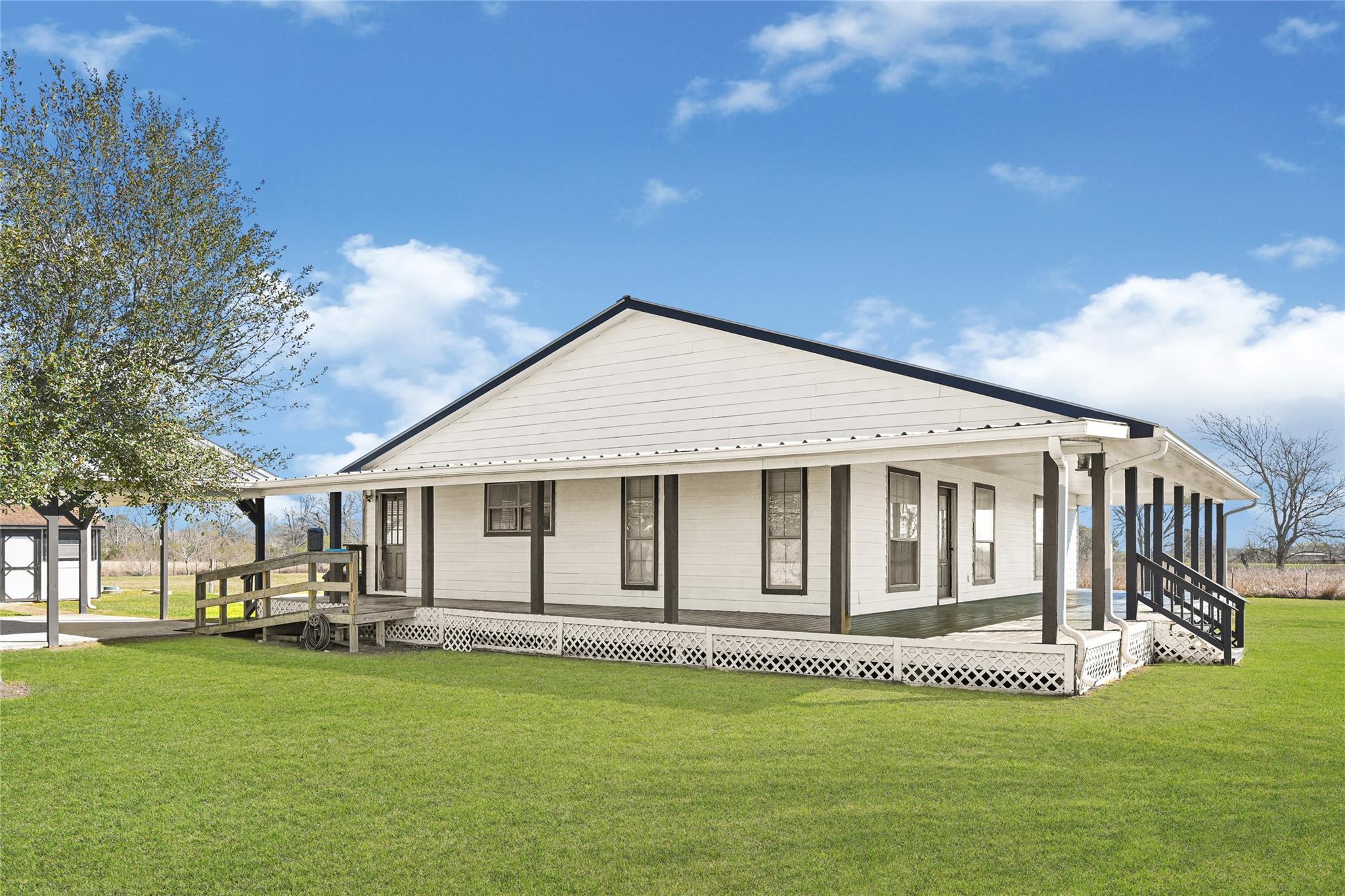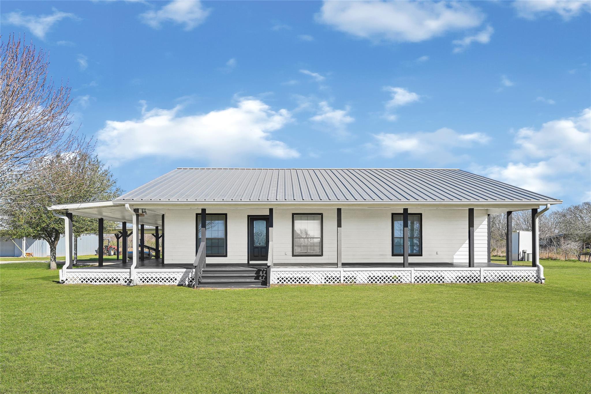 Lovely unrestricted country living on 4.64 acres. Fenced with split fencing if you have horses/cows. The home boasts 3 bedrooms, 2 baths, open concept, with a huge wrap around porch for relaxing or entertaining; butcher block counter tops in the kitchen, and built in desk. There is a large metal worshop for hobbies, extra parking, or a barn if needed. Other amenities include a 2 car carport, metal roof, wood frame storage building painted to match the home, well house, small barn, pond with pier, and the property has been drilled & piped for a 2nd well. Recent upgrades include spray foam insulation in the attic & it has been ducted to include A/C for the attic as well; new A/C unit with 5 yr warranty; home leveled with concrete pillars & extra beams with a 10 yr transferrable warranty; new water heater with 6 yr warranty and a fully assumable loan for qualified buyers with an interest rate around 2.8%!! Come make this country charmer your new home!