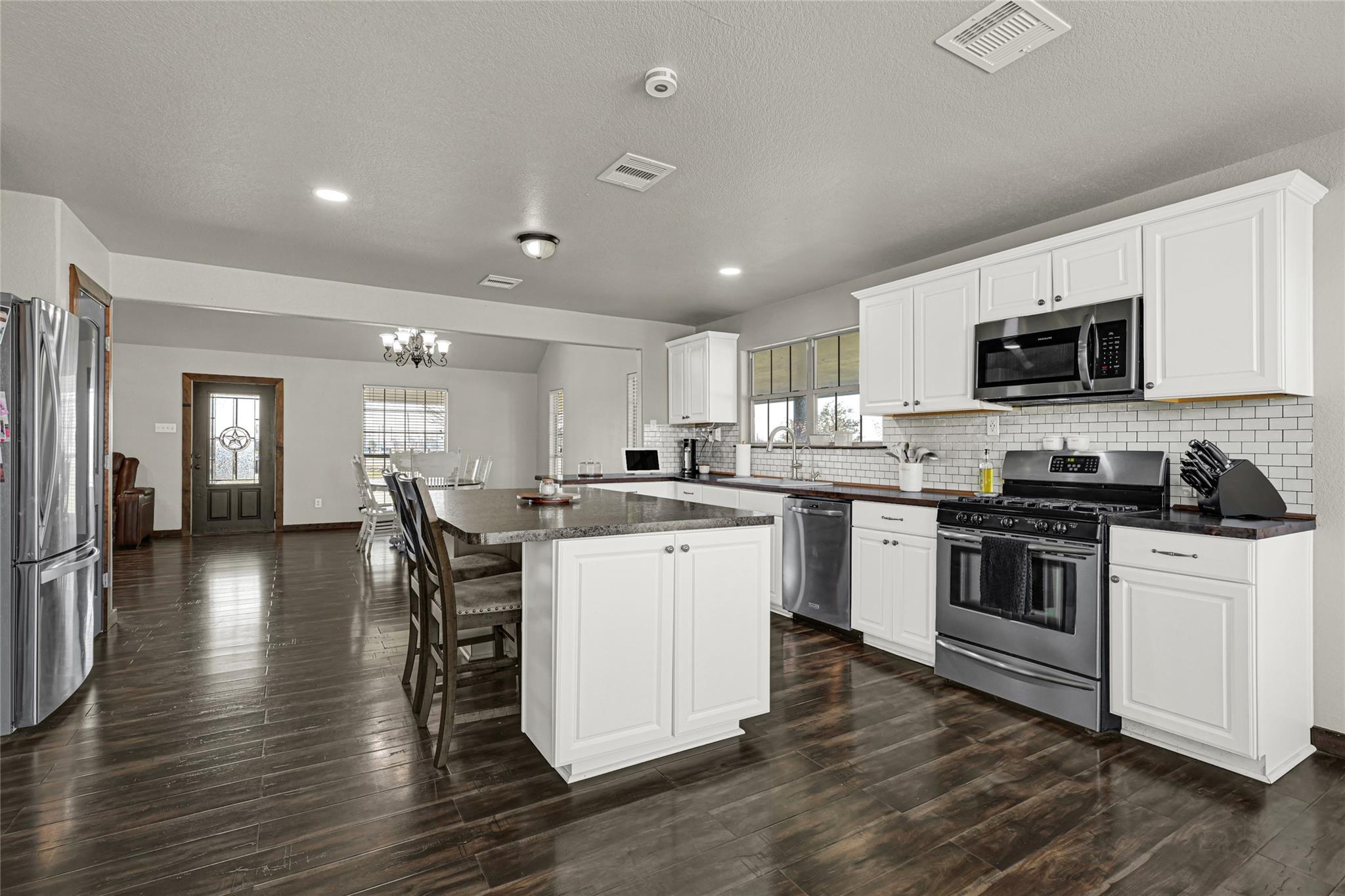 InteriorCountertop:Butcher blockFloors:Carpet,Laminate,TileBedroom Desc:All Bedrooms DownHeating:Central Gas,PropaneCooling:Central ElectricMicrowave:YesOven:Gas OvenDishwasher:YesEnergy Feature:Attic Vents,Ceiling Fans,High-Efficiency HVAC,Insulation - Spray-FoamInterior:Fire/Smoke Alarm,High Ceiling