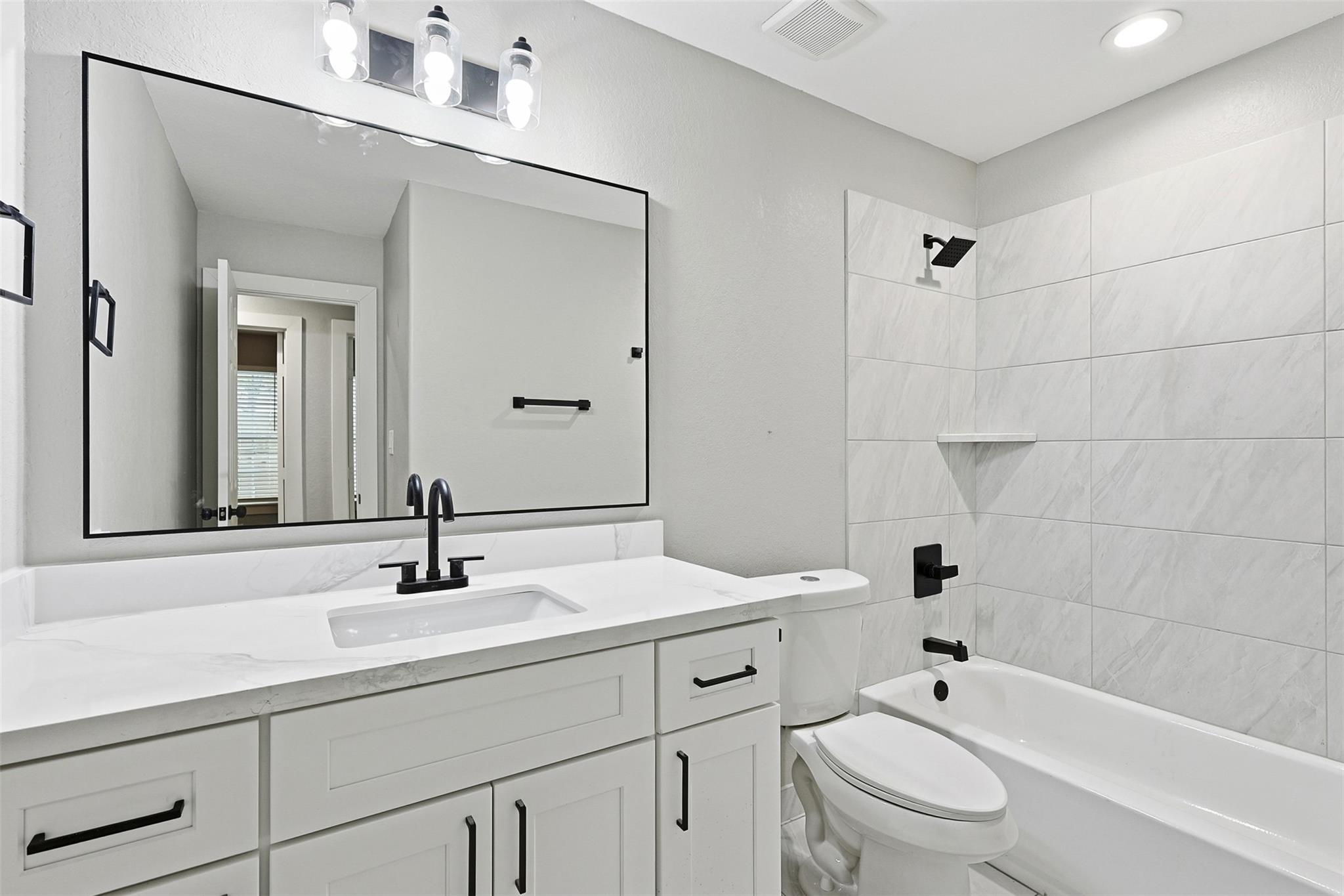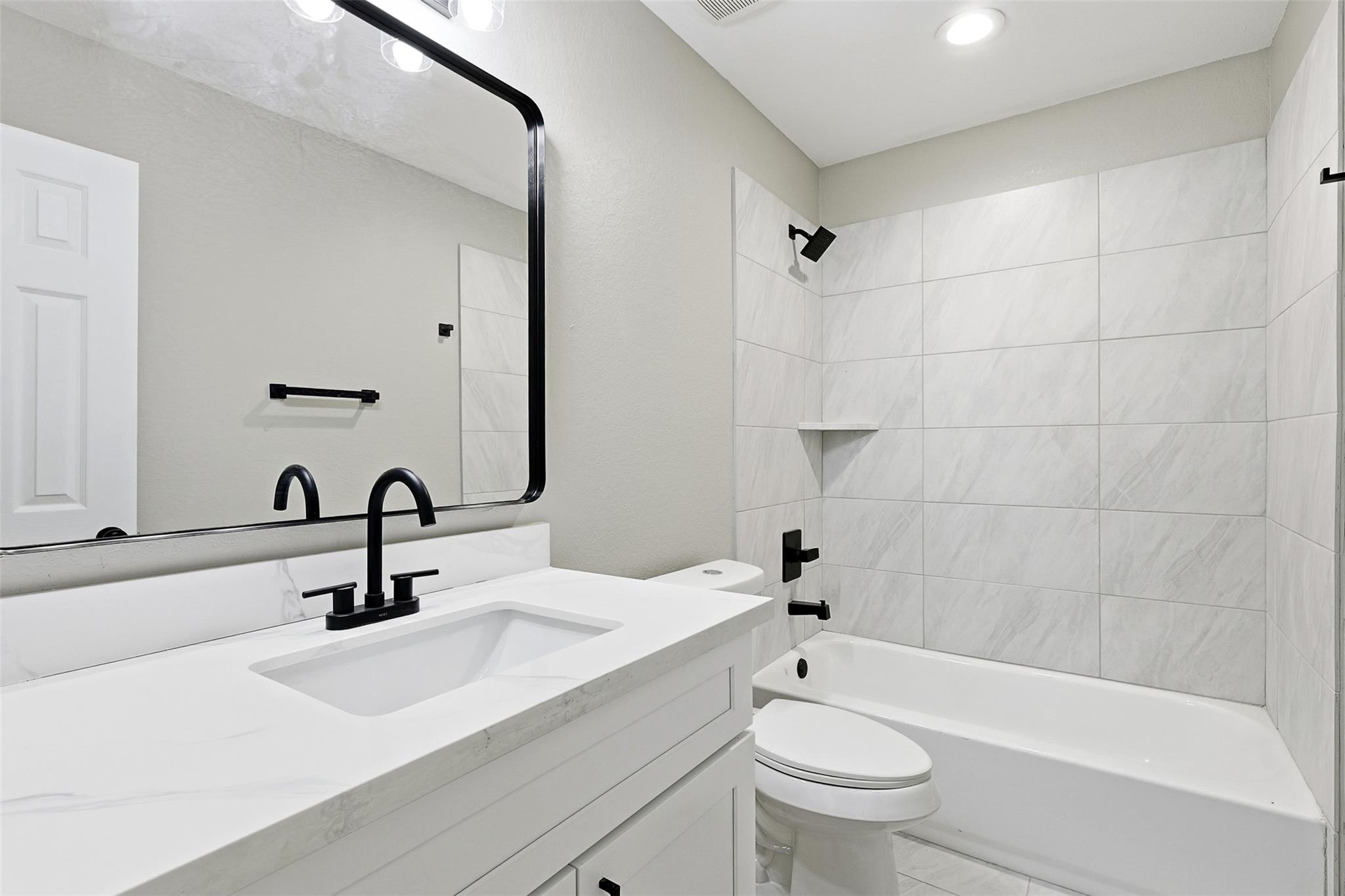 Completed this year, this modern duplex offers two beautifully finished 3-bedroom, 2-bath units, each with open-concept living, sleek white cabinetry, stainless steel appliances, subway tile backsplash, and light flooring. Spacious bedrooms include plush carpet, double-door closets, and ceiling fans, while contemporary bathrooms feature elegant tile work and black fixtures. Each unit has private entrances, separate driveways, and individual fenced backyards with covered patios. With central electric cooling, in-unit laundry connections, and a corner lot setting, this income-producing property is ideal for investors seeking a turnkey opportunity near major Houston employment hubs.