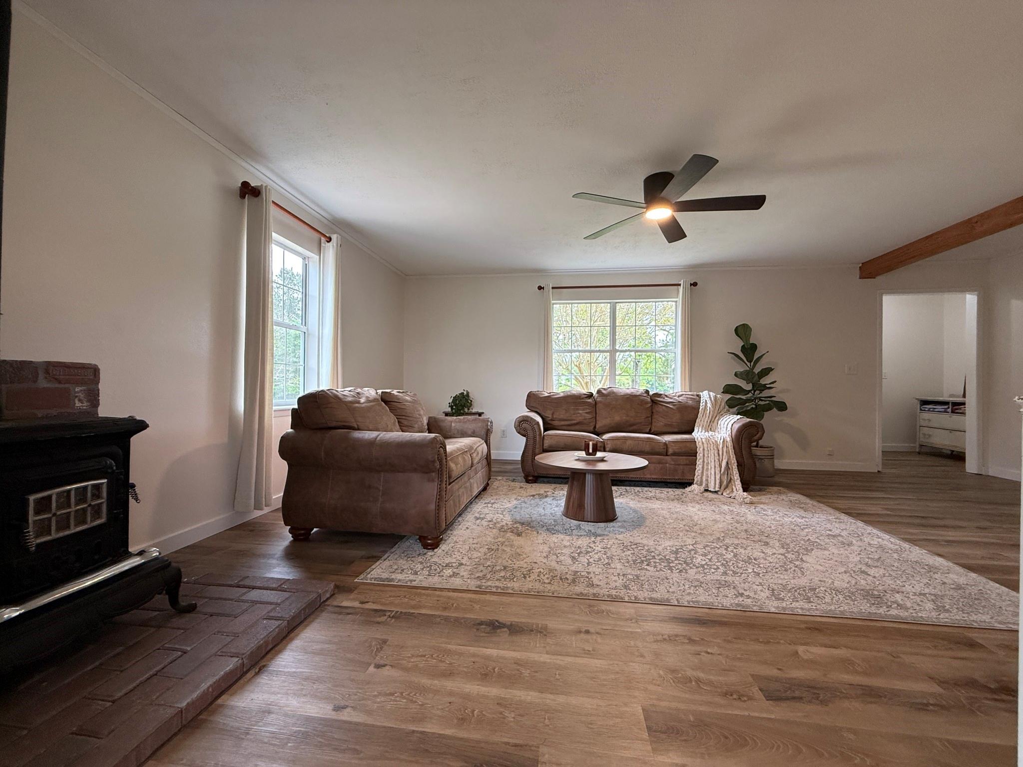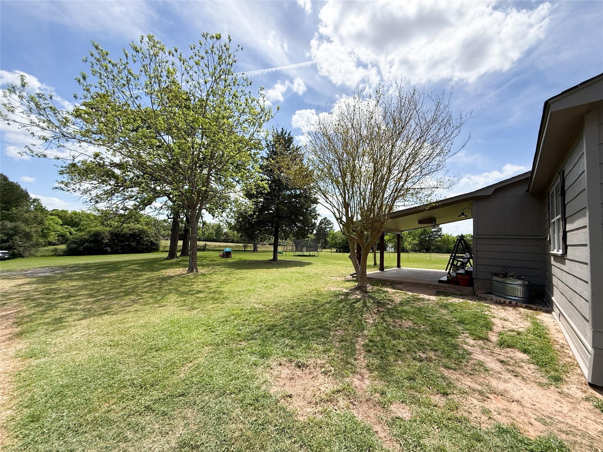 Enjoy peaceful country living in this beautifully remodeled home sitting on 5 private acres at the end of a private road with no thru traffic. Property offers a blend of comfort, functionality, and outdoor living. The home features spacious bedrooms, walk-in closets, abundant storage. The kitchen comes equipped with refrigerator, built-in microwave, and dishwasher making your move seamless from day one. 2-car garage with a workbench and additional storage adds even more convenience. Step outside and take in the quiet surroundings from the breezy patios, where deer are frequent visitors. For those needing space and versatility, the property includes a well-sized barn with lean-tos and RV shed for equipment, tools, and recreational vehicles. The land features improved pasture and a pond stocked with fish. Mature oak trees provide shade and enhance the property’s natural beauty. Whether you're looking for a homestead, small ranch, or private retreat, this property has everything in place.