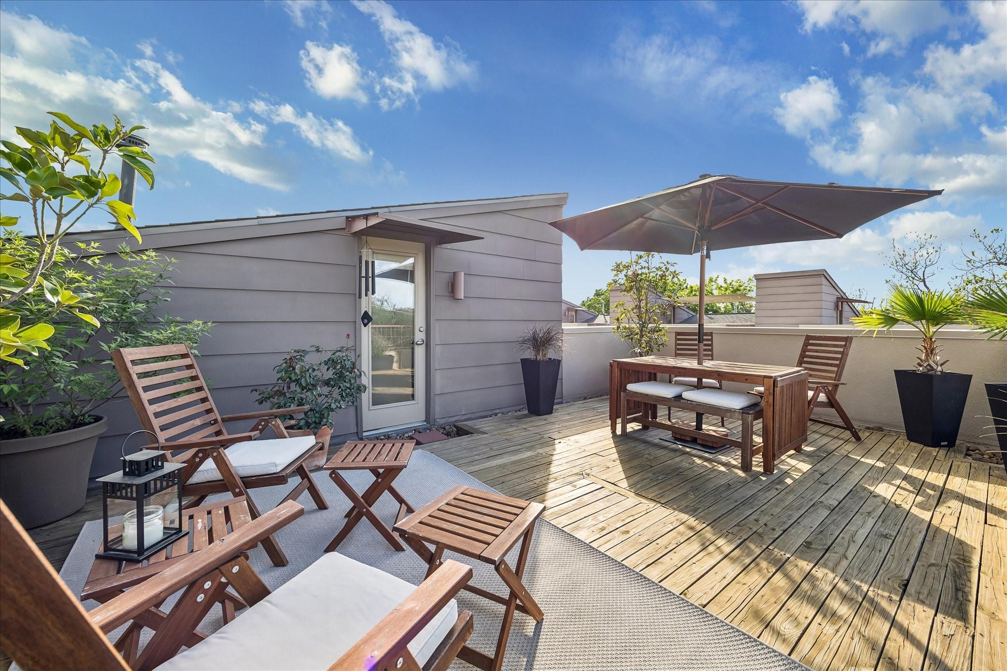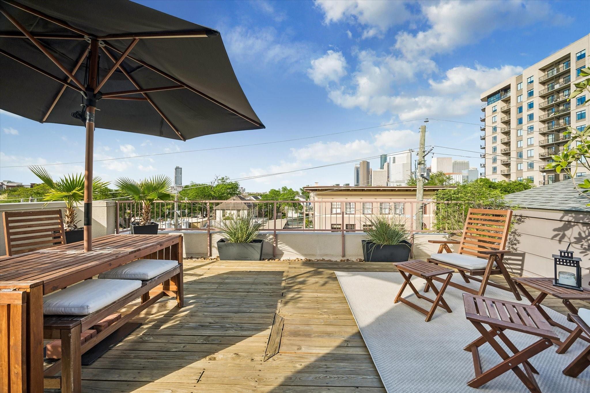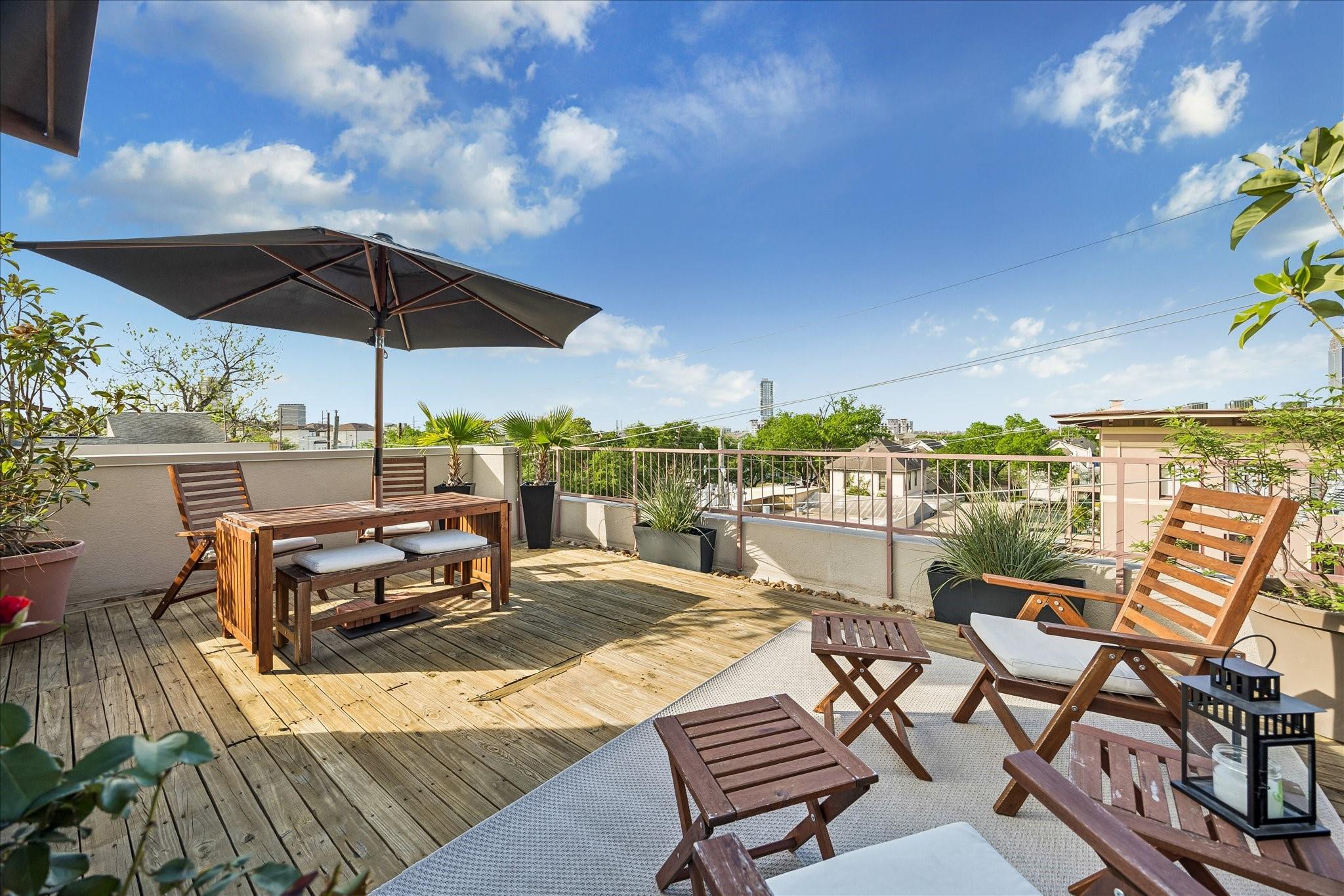 Nestled within a small gated enclave in the heart of Midtown, this updated, modern townhome offers striking architecture & protected downtown views. A 1st-floor bedroom opens to the side yard, creating a private retreat for guests. The 2nd-floor living spaces are defined by 10' ceilings, exposed stained trusses, hardwood floors, flex track lighting, a custom metal & wood staircase, & a gaslog fireplace. The adjoining dining room & beautifully appointed kitchen create an ideal setting for everyday living & entertaining, complete with a quartzite island & granite countertops. The 3rd-floor hosts the elegant primary suite with a luxurious travertine bath & 2-story-height closet, utility closet, & third bedroom/study. Spiral stairs lead to the rooftop deck with irrigated planters, wired speaker, & exceptional skyline views. Recent improvements include refinished hardwood floors, updated counters, full interior repainting, replacement of the flat roof & rooftop decking, & dishwasher (2025)