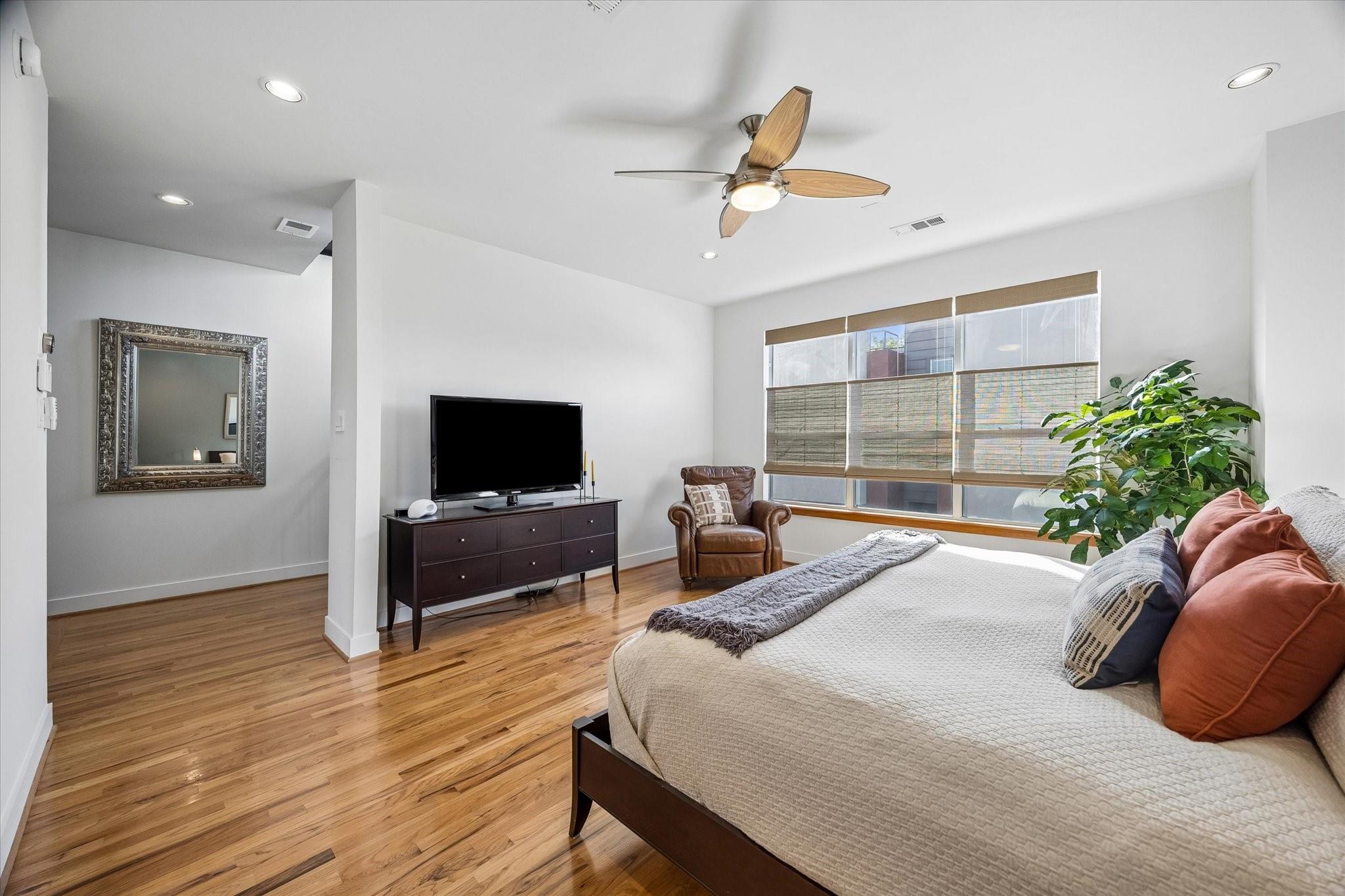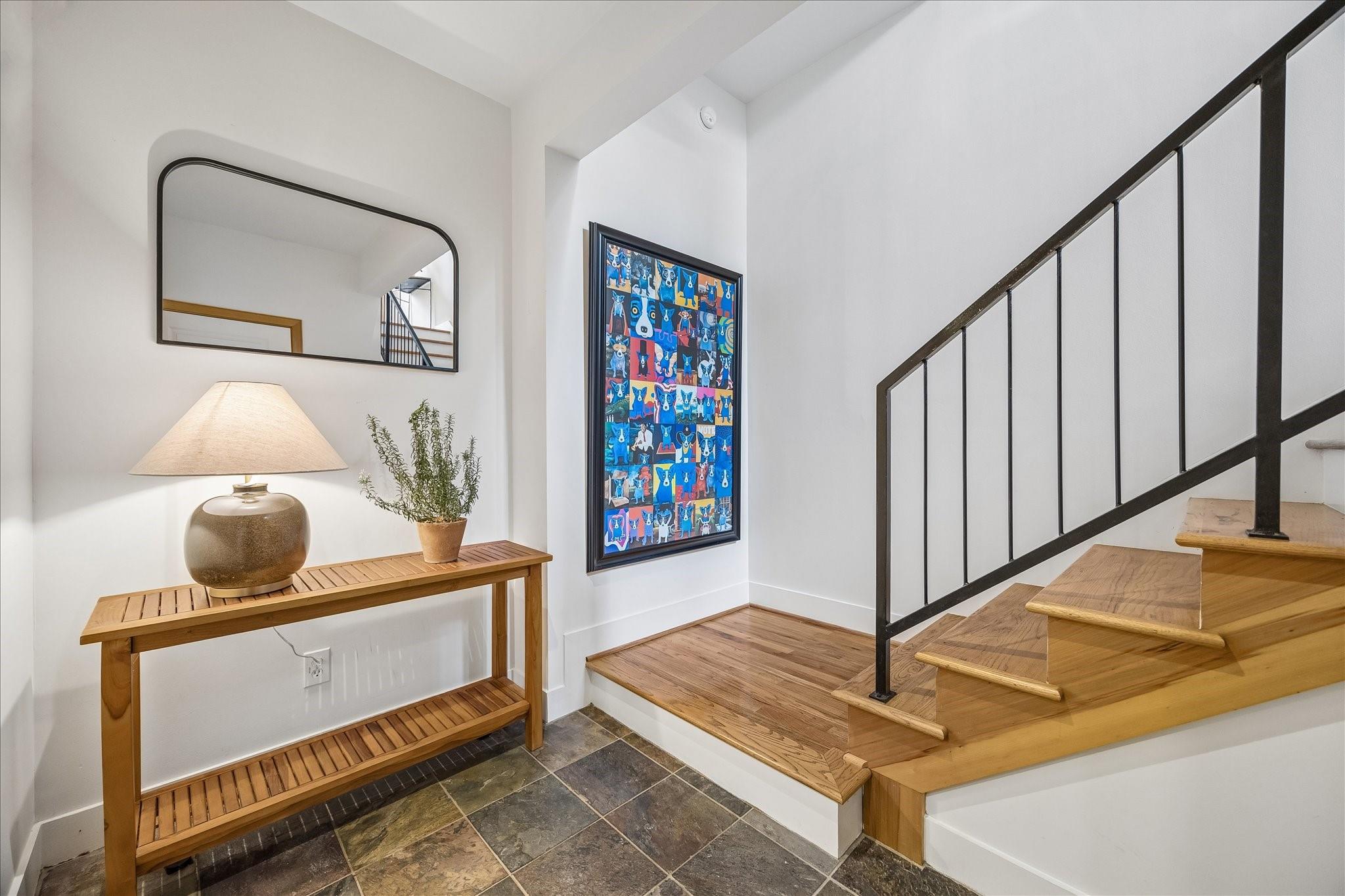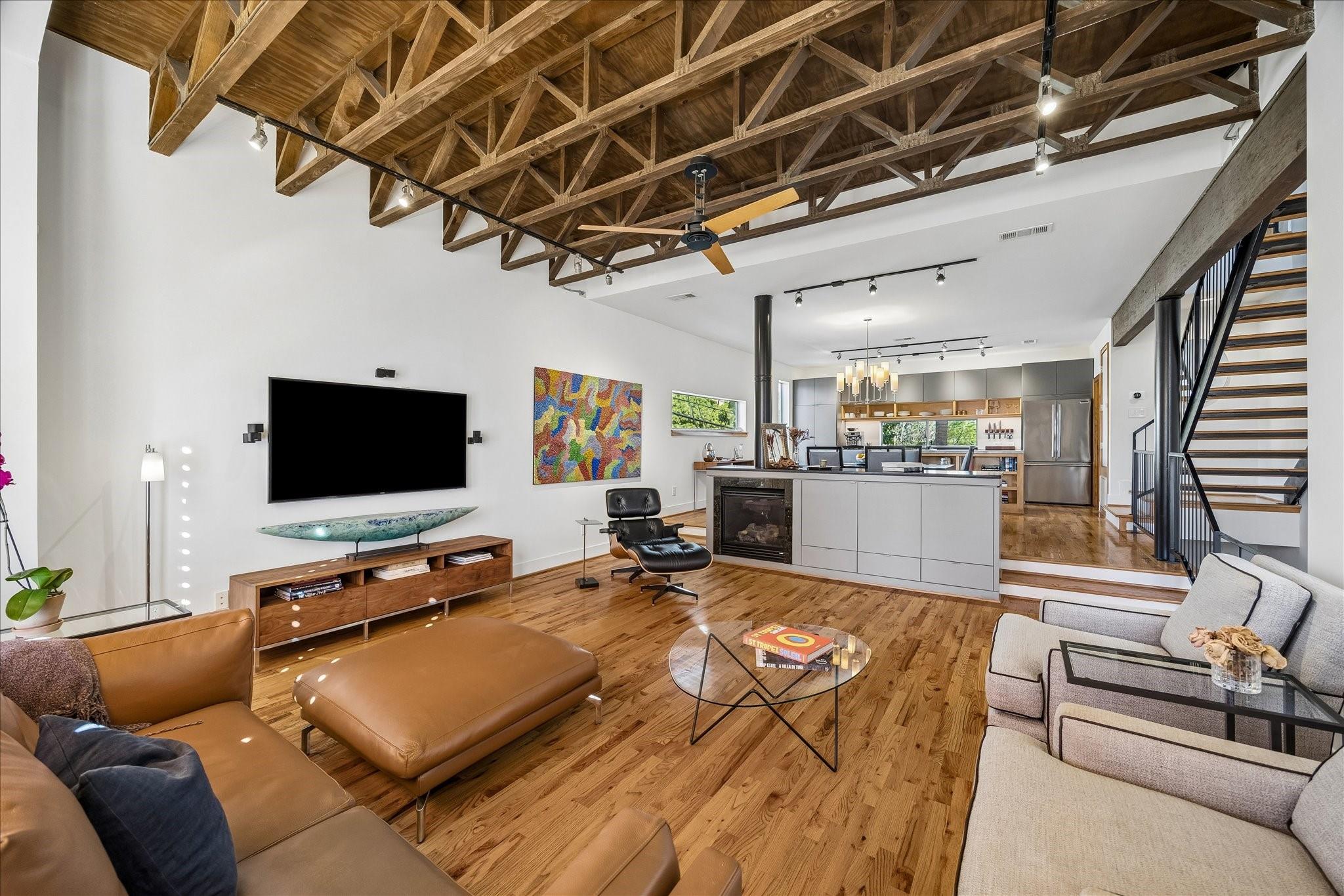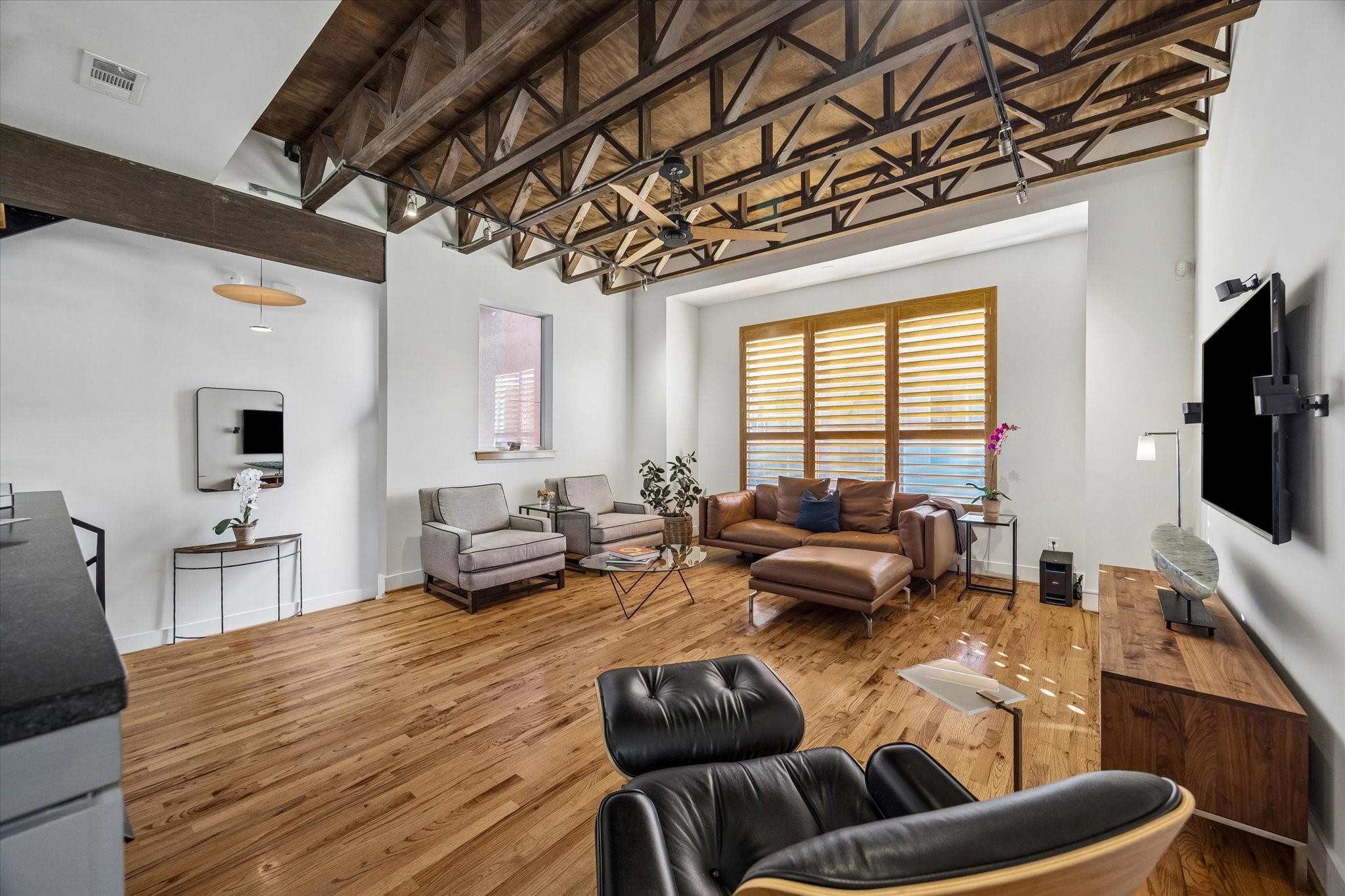 Nestled within a small gated enclave in the heart of Midtown, this updated, modern townhome offers striking architecture & protected downtown views. A 1st-floor bedroom opens to the side yard, creating a private retreat for guests. The 2nd-floor living spaces are defined by 10' ceilings, exposed stained trusses, hardwood floors, flex track lighting, a custom metal & wood staircase, & a gaslog fireplace. The adjoining dining room & beautifully appointed kitchen create an ideal setting for everyday living & entertaining, complete with a quartzite island & granite countertops. The 3rd-floor hosts the elegant primary suite with a luxurious travertine bath & 2-story-height closet, utility closet, & third bedroom/study. Spiral stairs lead to the rooftop deck with irrigated planters, wired speaker, & exceptional skyline views. Recent improvements include refinished hardwood floors, updated counters, full interior repainting, replacement of the flat roof & rooftop decking, & dishwasher (2025)