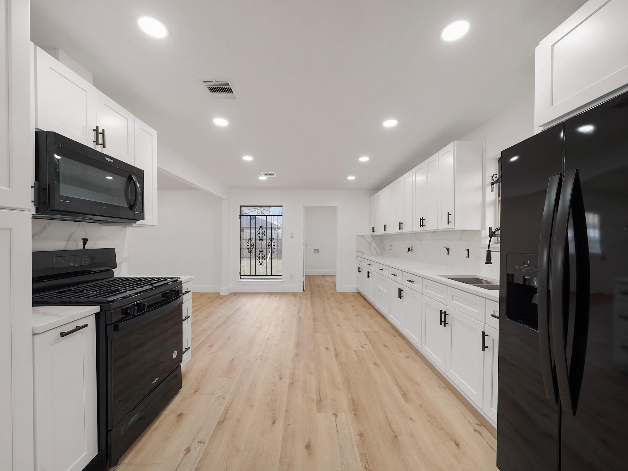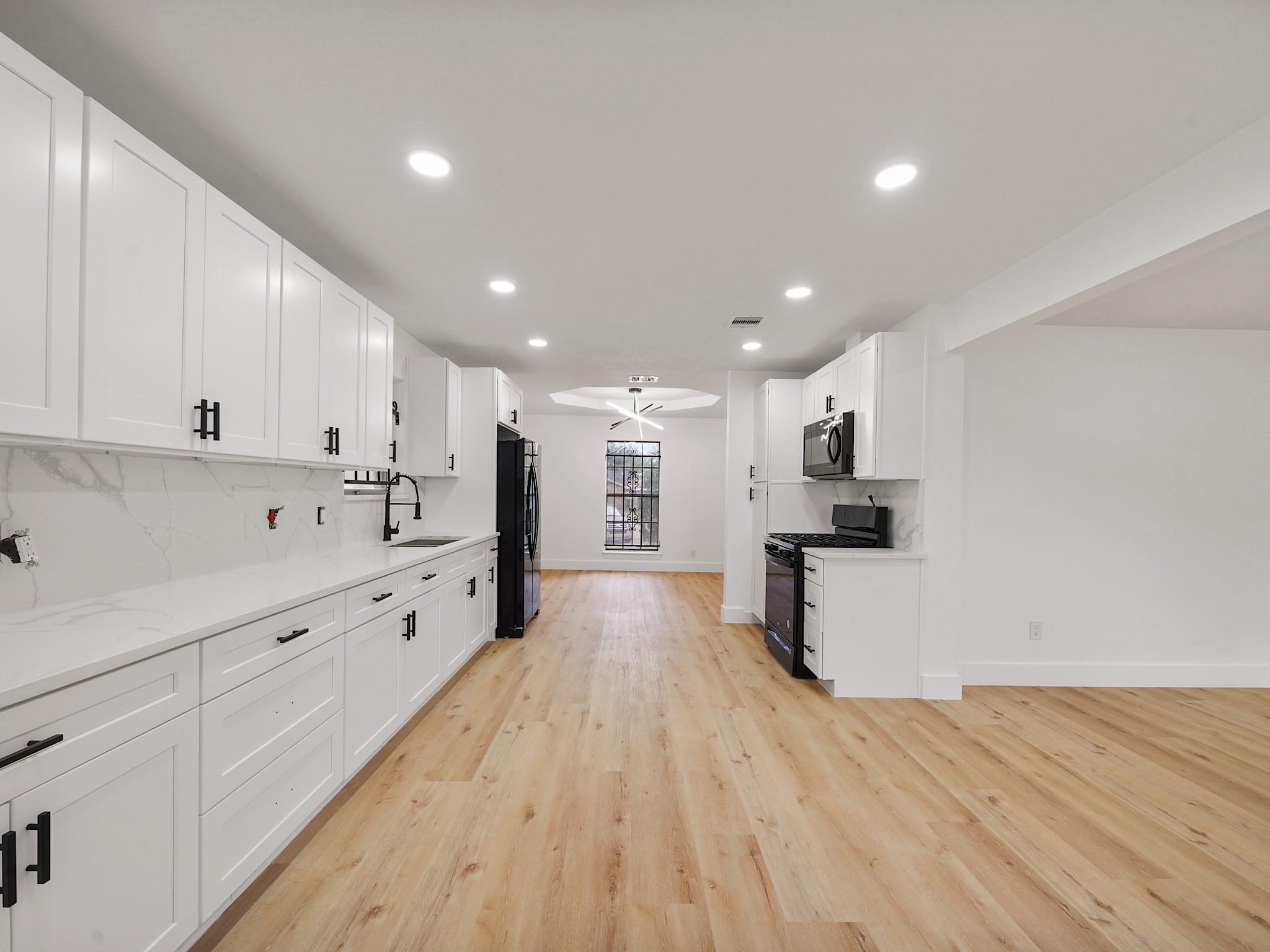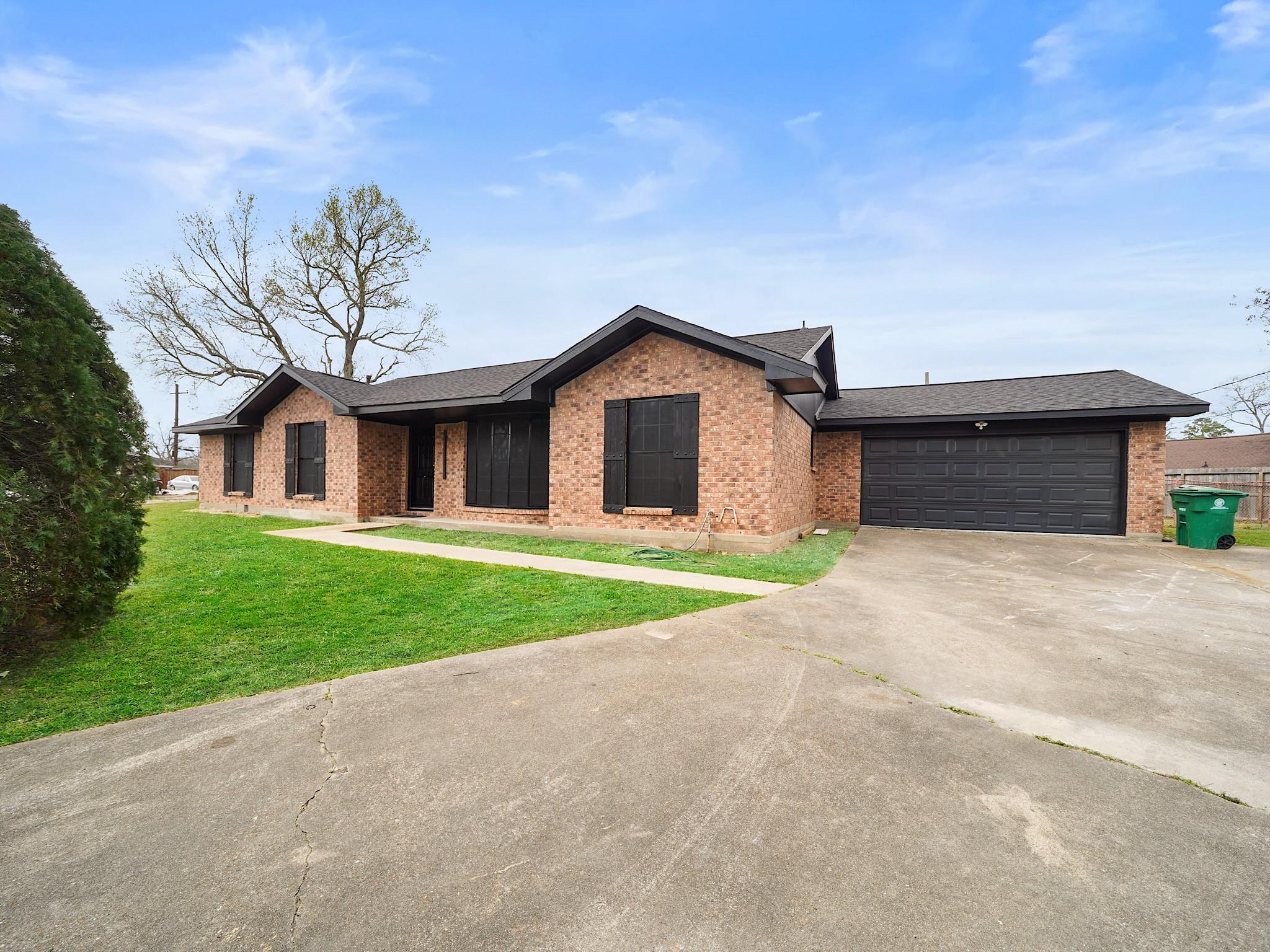 Completely remodeled 4-bedroom, 2-bath home at 9811 Degas Ln, Houston, TX! This move-in-ready property features an open layout with wood-look flooring, recessed lighting, fresh paint, and modern black fixtures throughout. The updated kitchen offers white shaker cabinets, quartz countertops, marble-look backsplash, and sleek appliances. Both bathrooms have been beautifully renovated with contemporary finishes, including a dual-sink vanity and glass-enclosed shower in the primary suite. Spacious secondary bedrooms provide flexibility for guests or a home office. Enjoy a large backyard, two-car garage, and classic brick exterior with fresh accents. Conveniently located near major roads, shopping, and dining. A must-see!